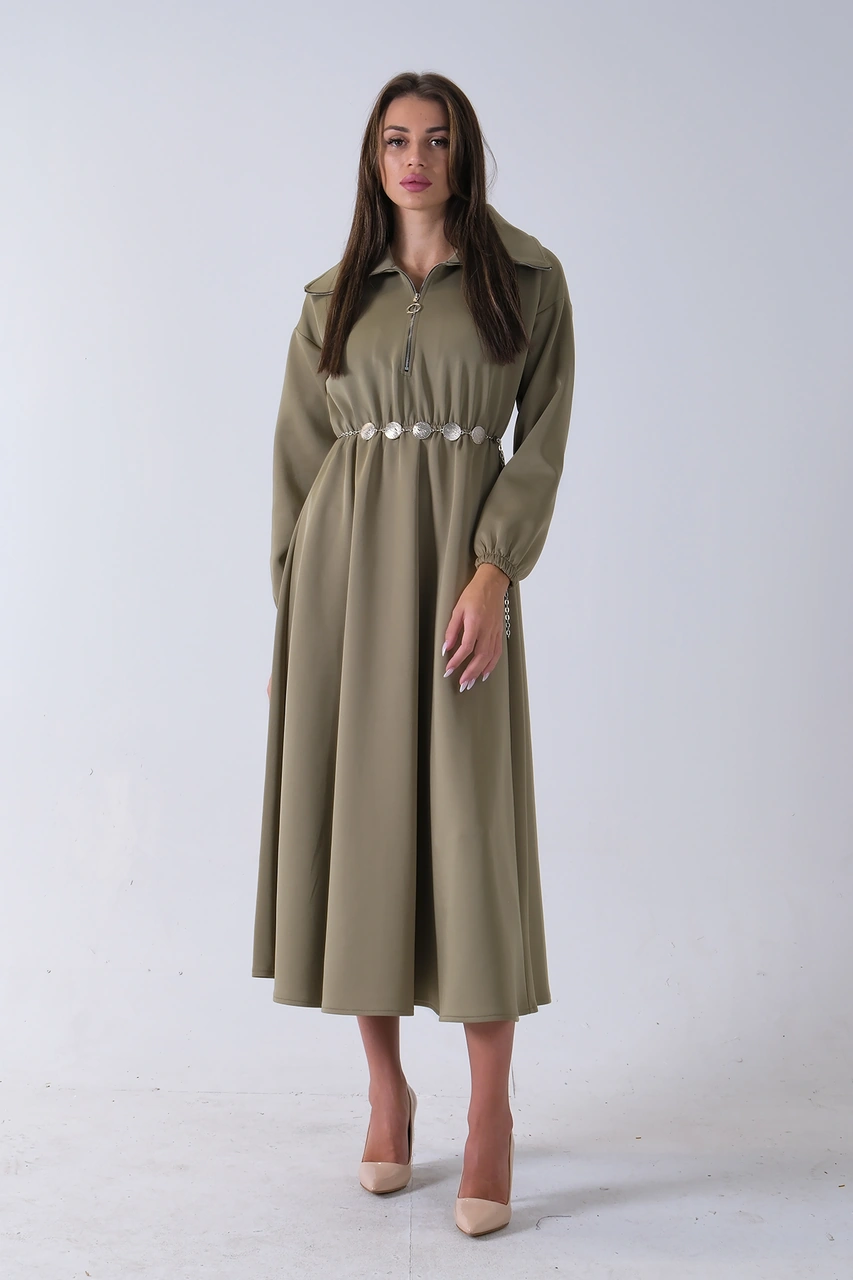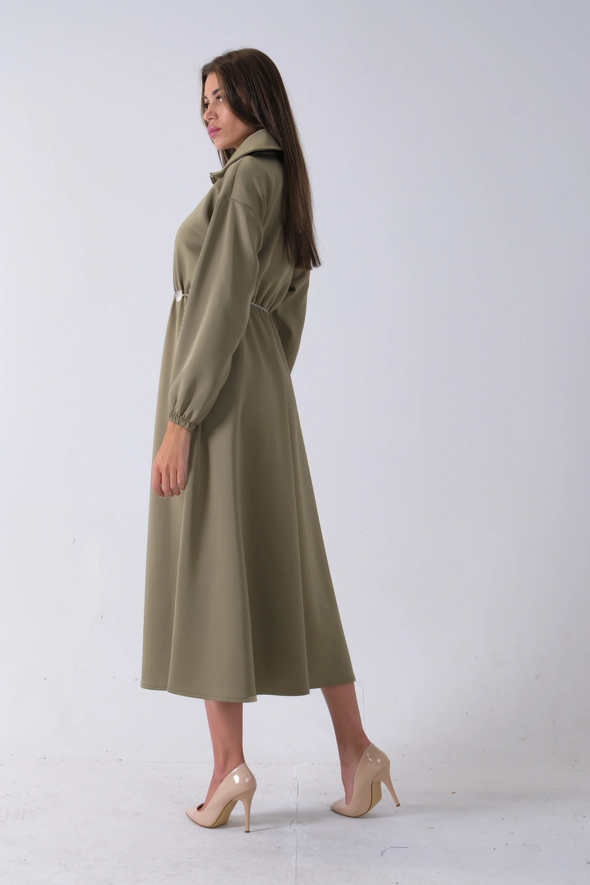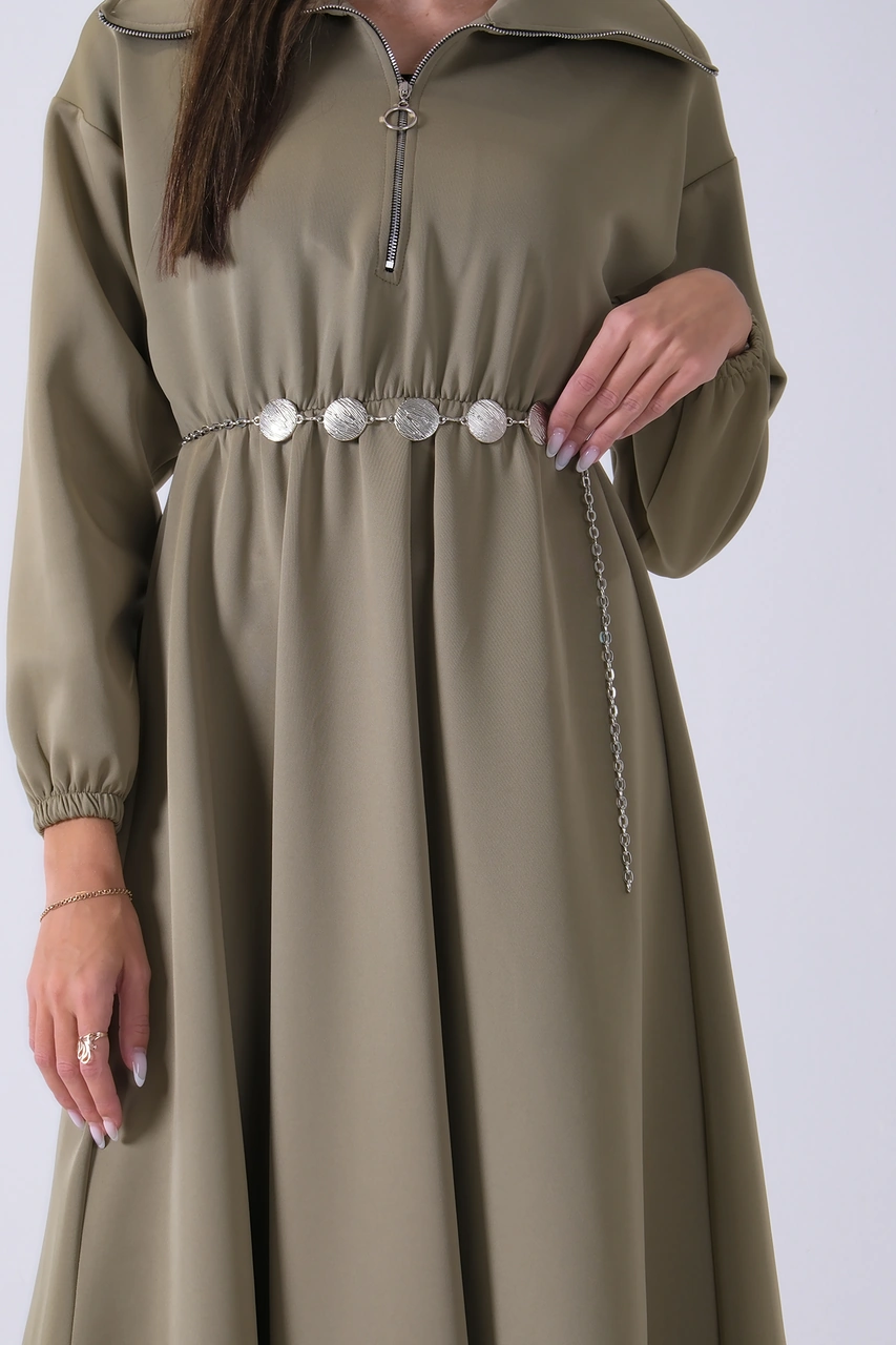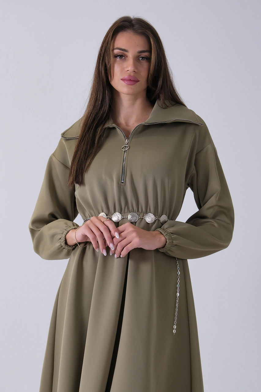 Feminist Haki Yaka Fermuar Detaylı Bel Ve Bileği Lastikli Kemerli Scuba Elbise 4593455.23 Haki