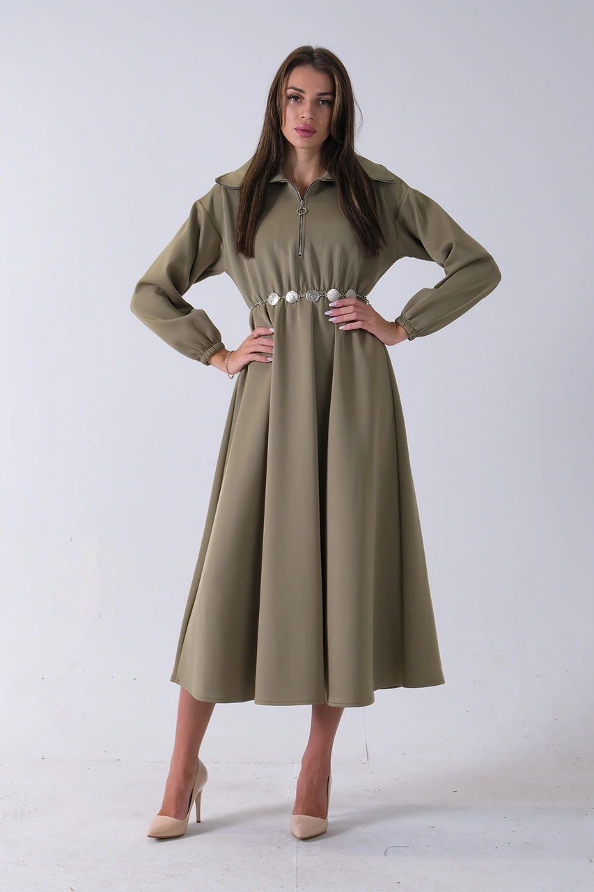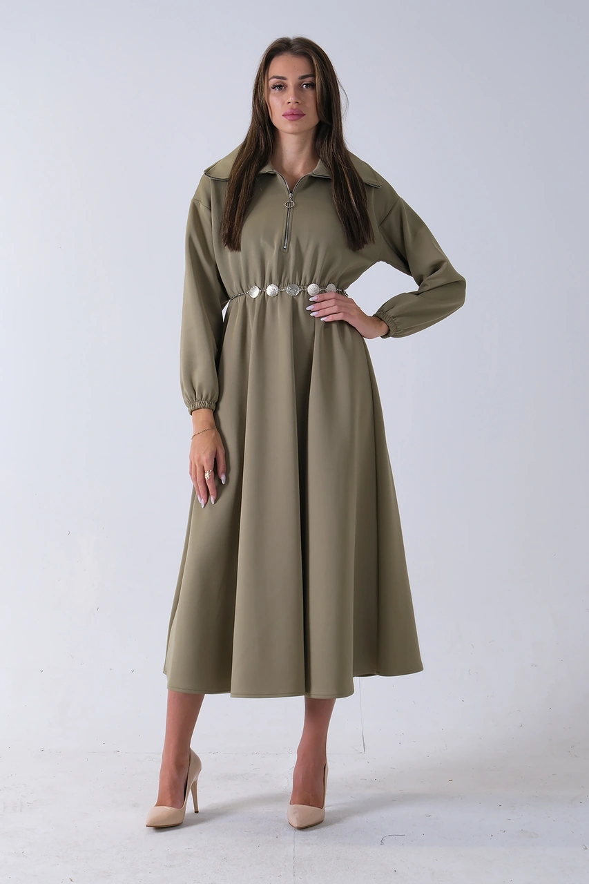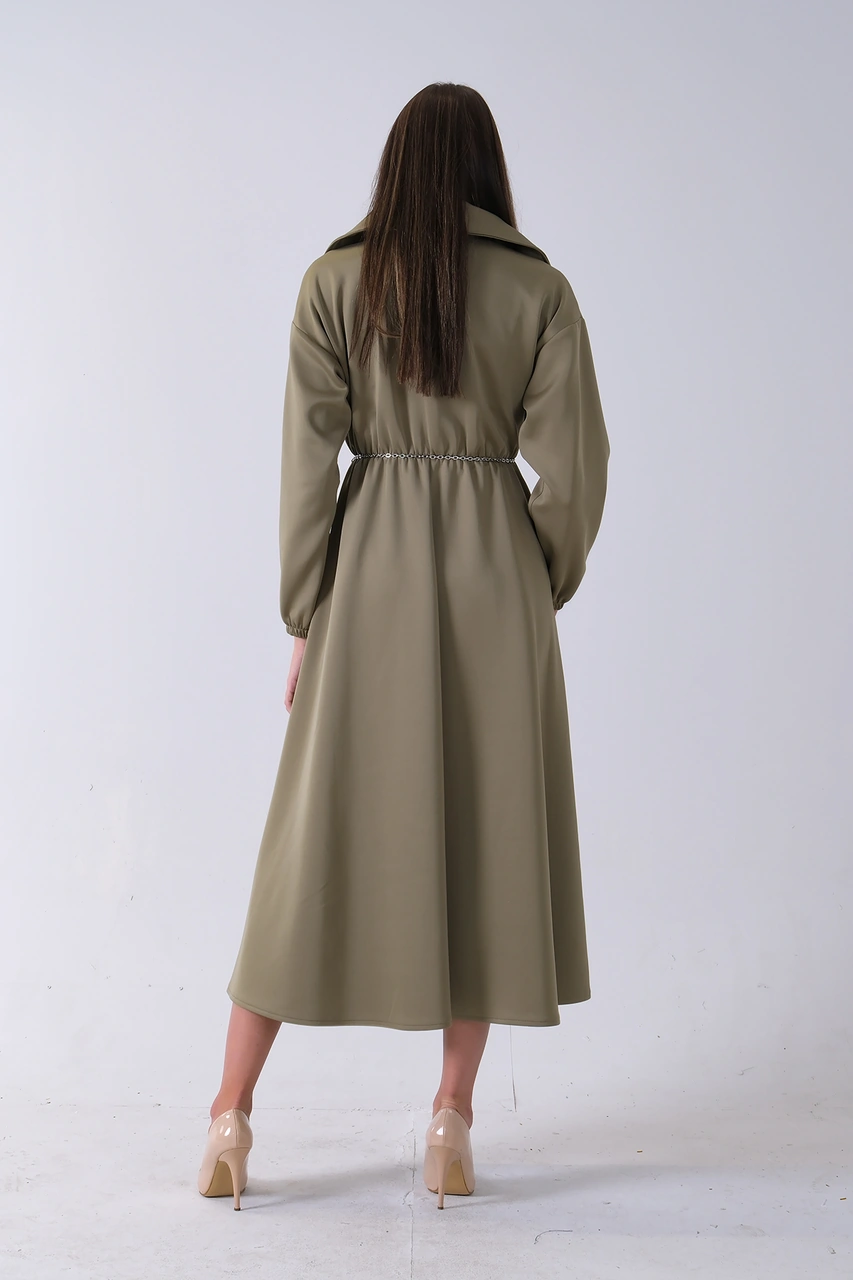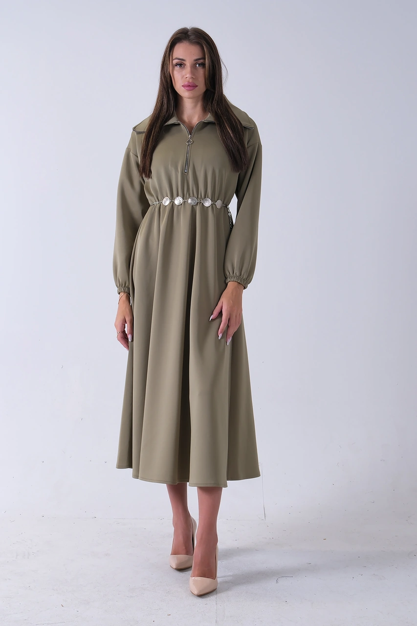 Feminist Haki Yaka Fermuar Detaylı Bel Ve Bileği Lastikli Kemerli Scuba Elbise 4593455.23 Haki