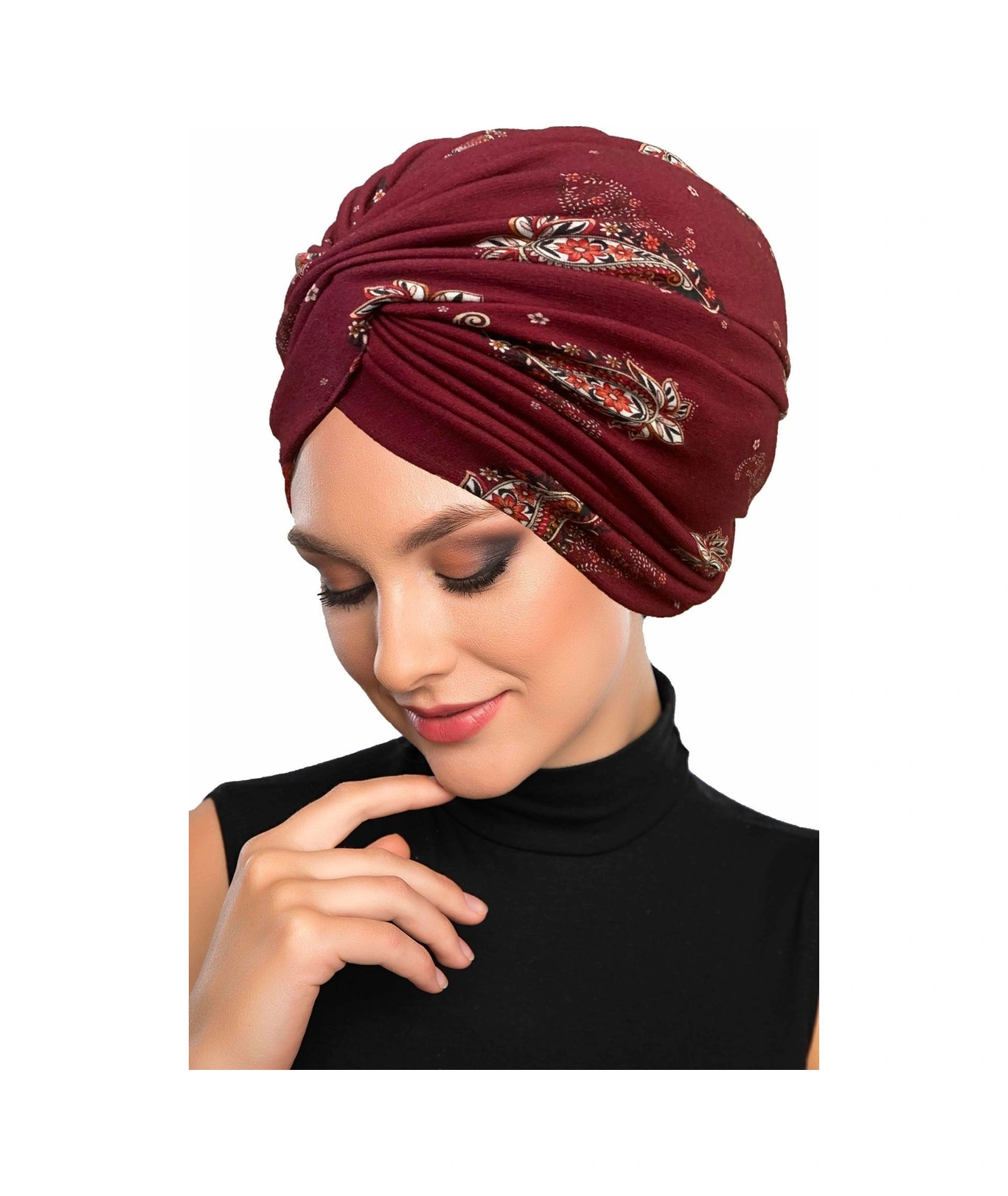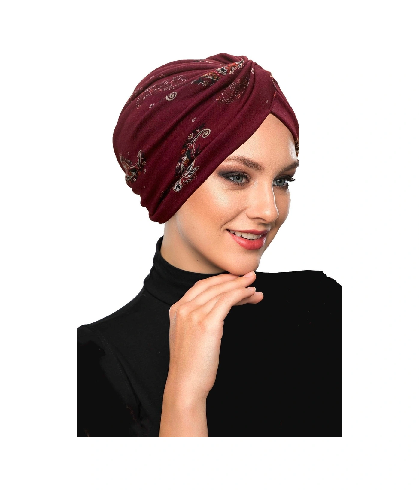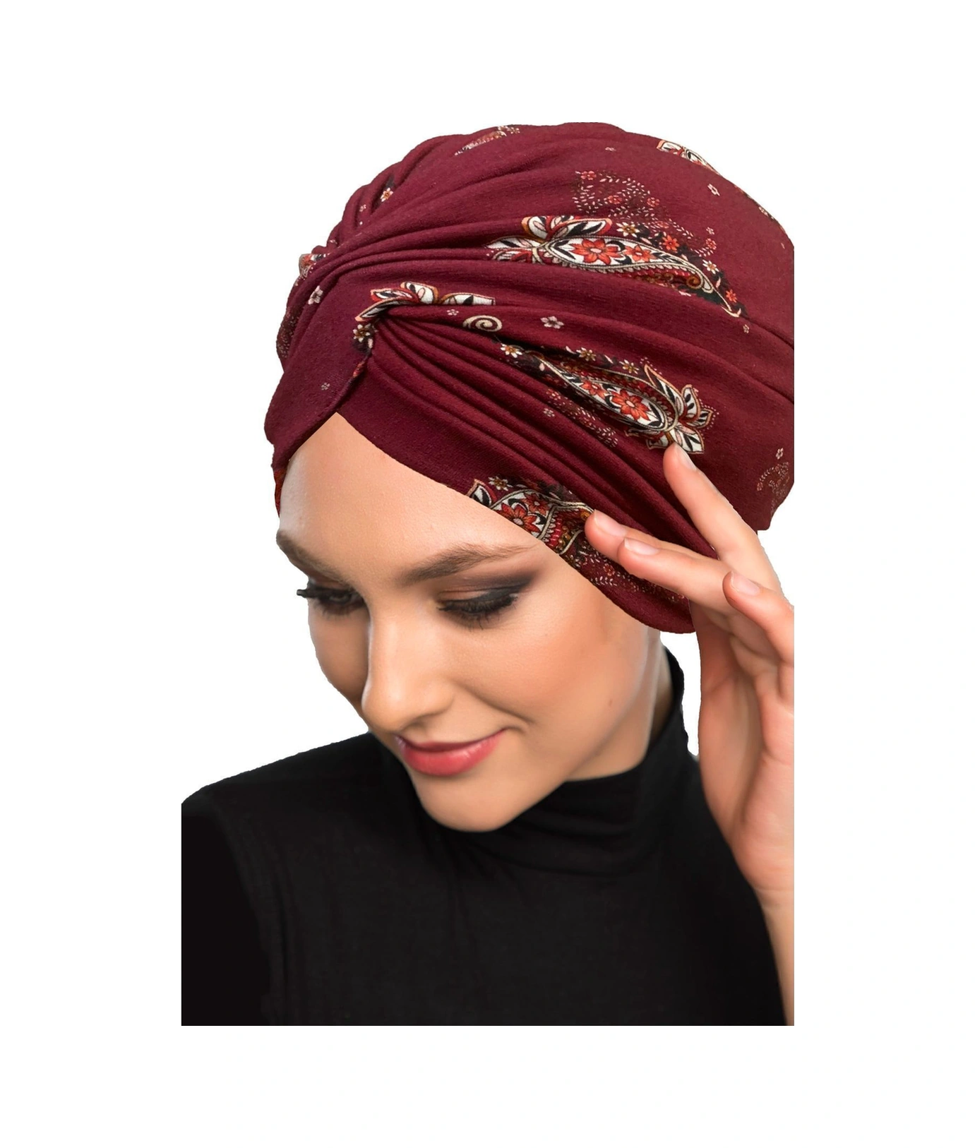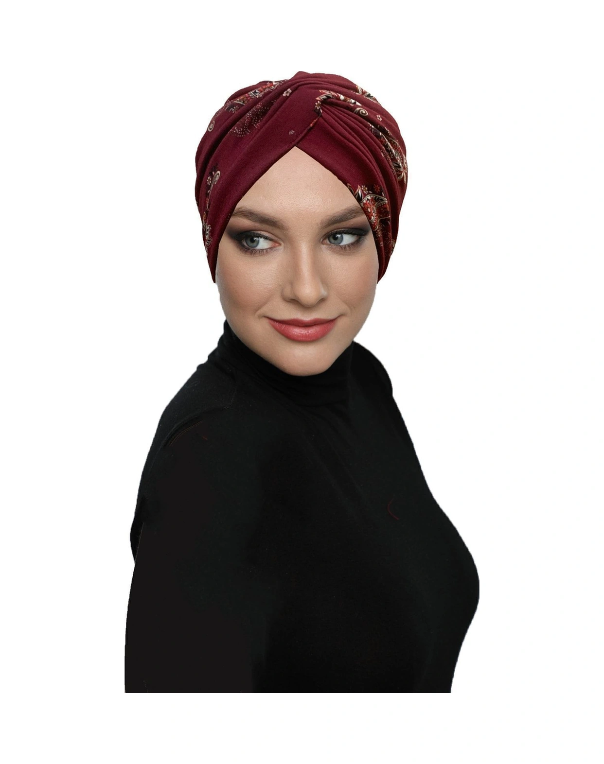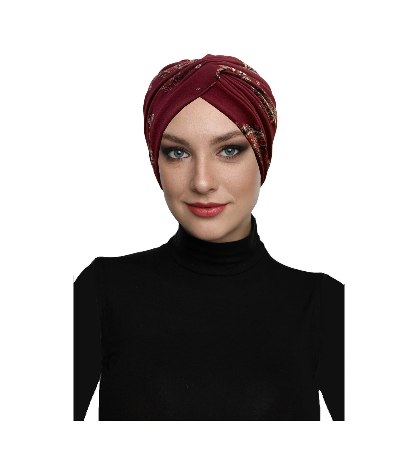 Fidan Desenli Çapraz Penye Bordo Yazma Desenli Hazır Türban Tesettür Havuz Bonesi Bordo-yazma
