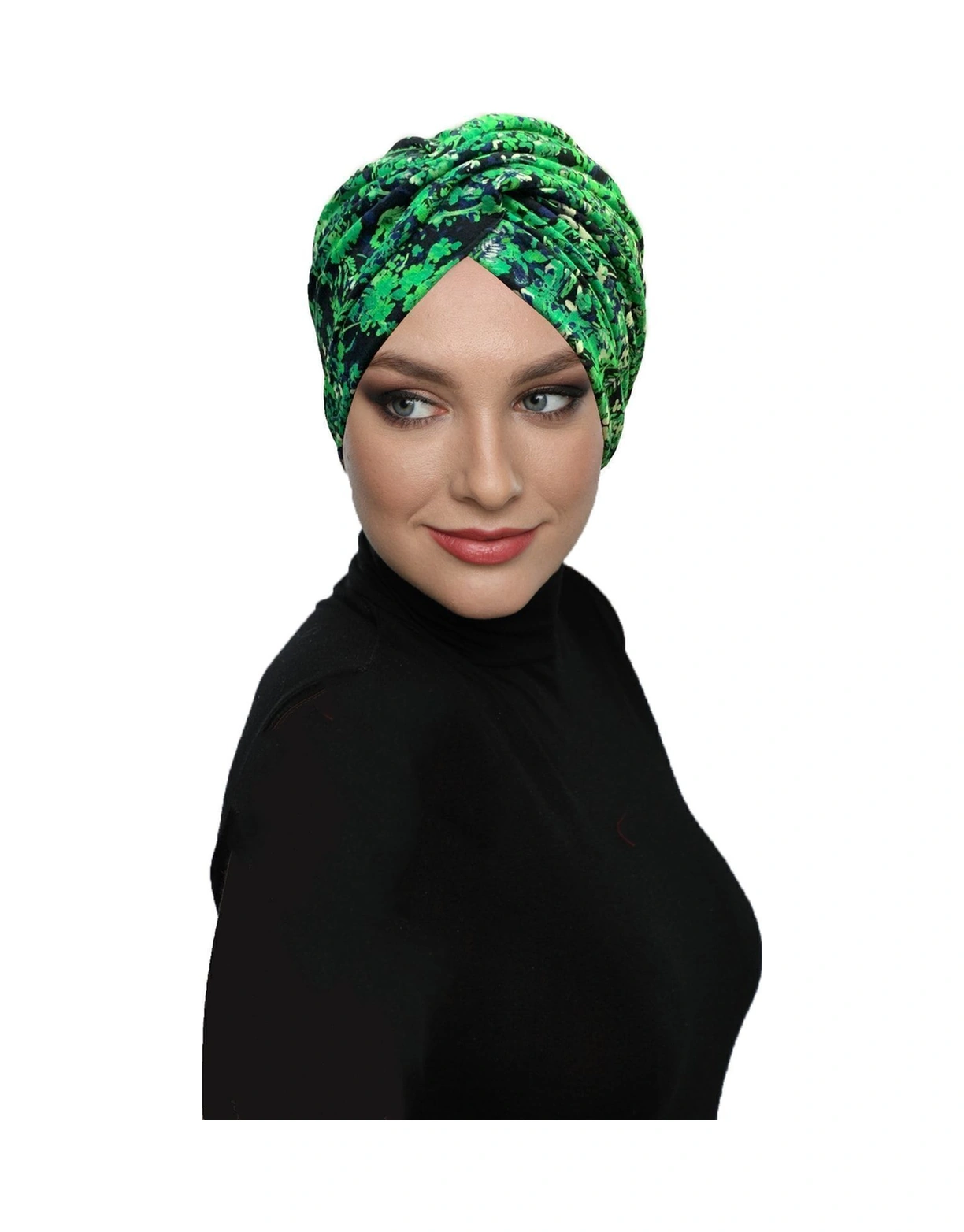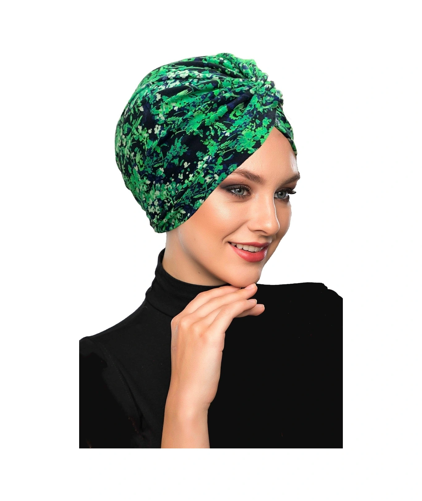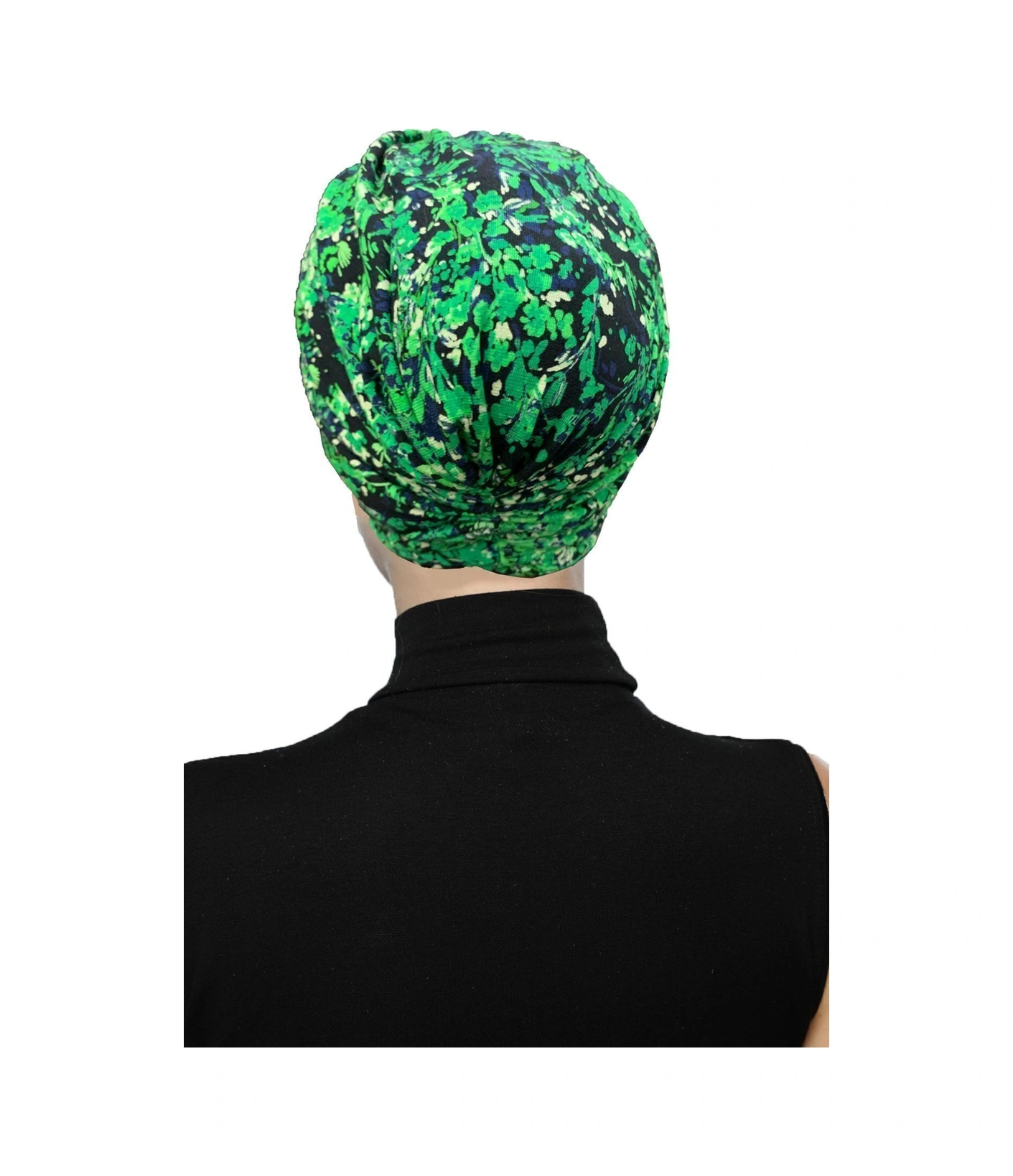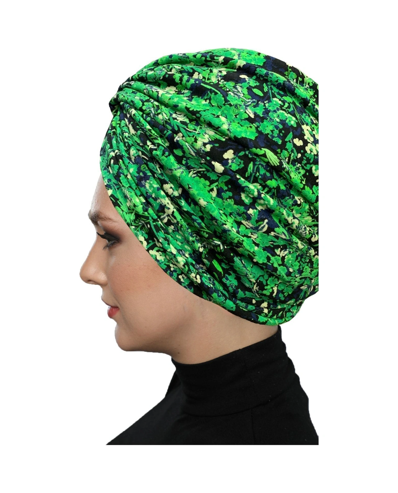 Fidan Desenli Çapraz Penye Yeşil Lacivert Çiçek Motifli Hazır Türban Tesettür Havuz Bonesi Yeşil Lacivert