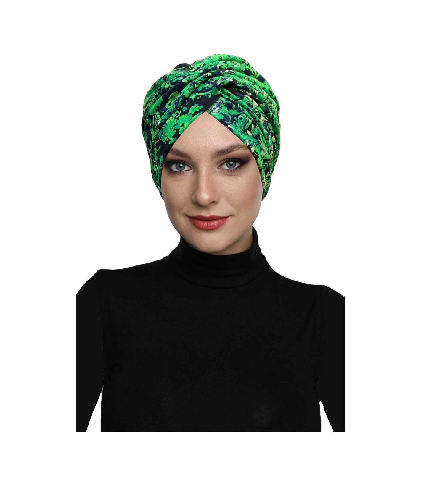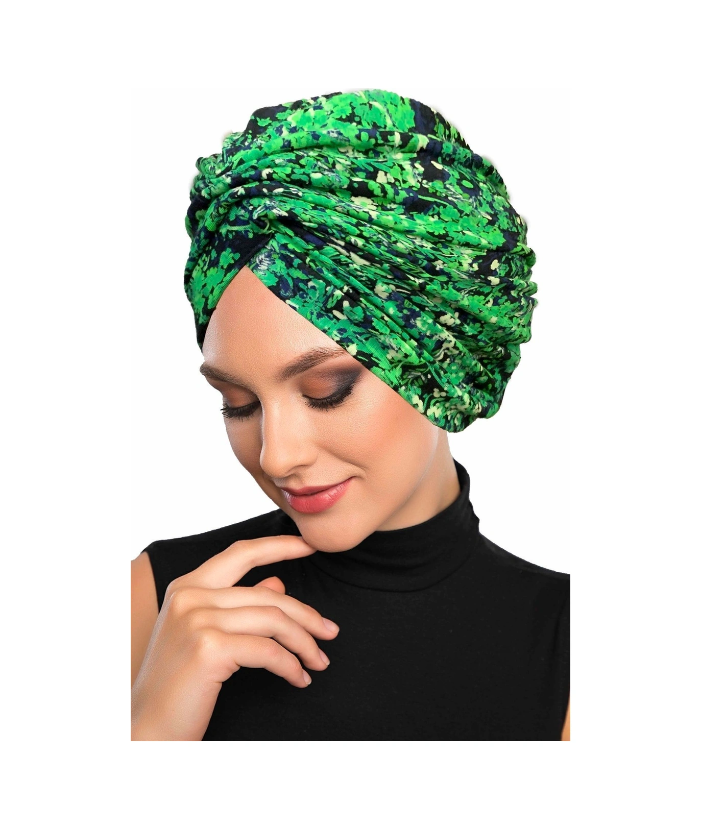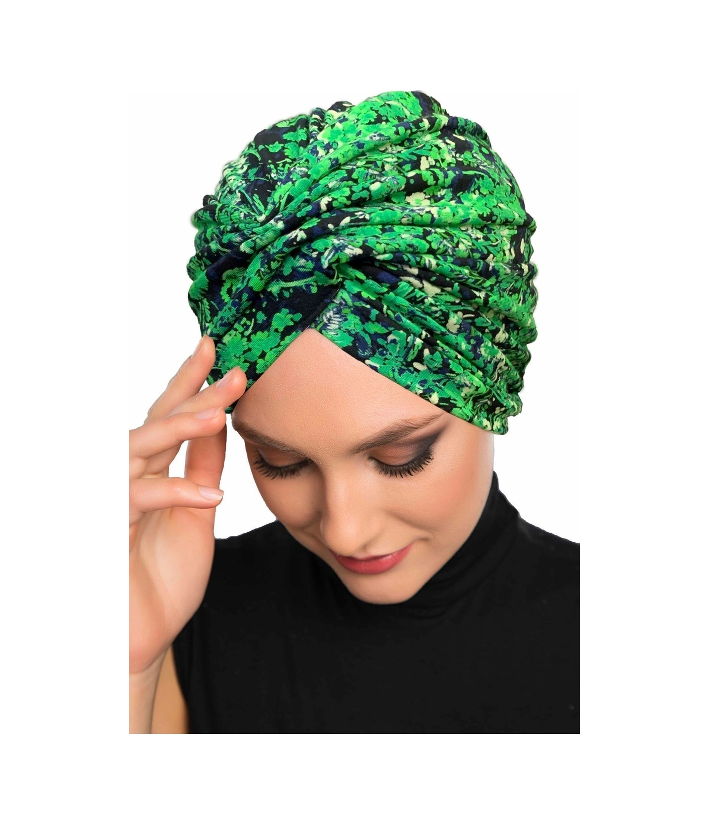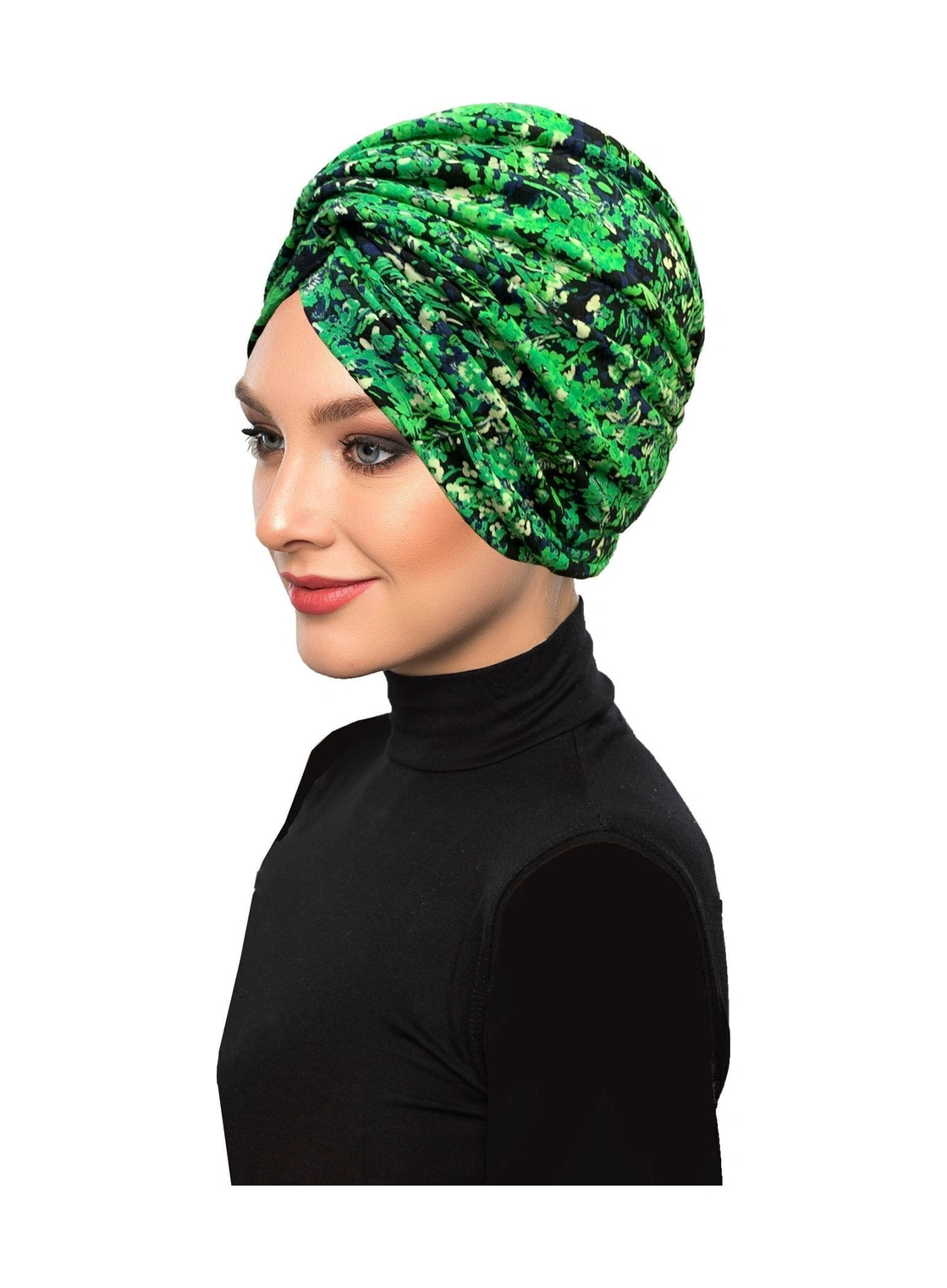 Fidan Desenli Çapraz Penye Yeşil Lacivert Çiçek Motifli Hazır Türban Tesettür Havuz Bonesi Yeşil Lacivert