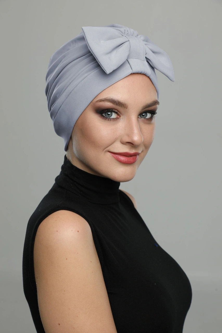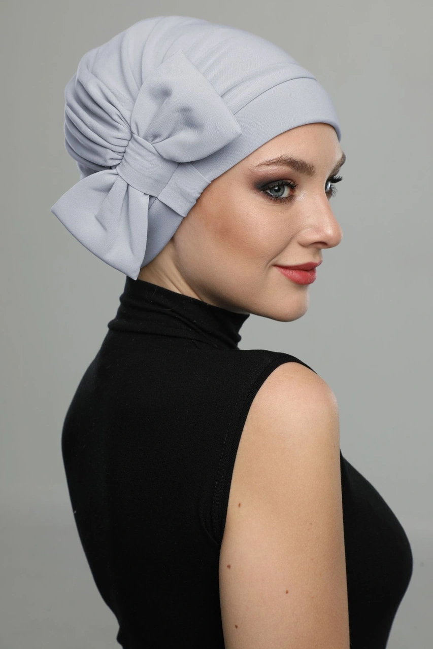 Fiyonklu Açık Gri Hazır Türban Tesettür Havuz Bonesi Açık Gri