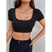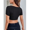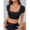 Geniş Yaka Siyah Renk Fitilli Kısa Kollu Crop Top Bluz