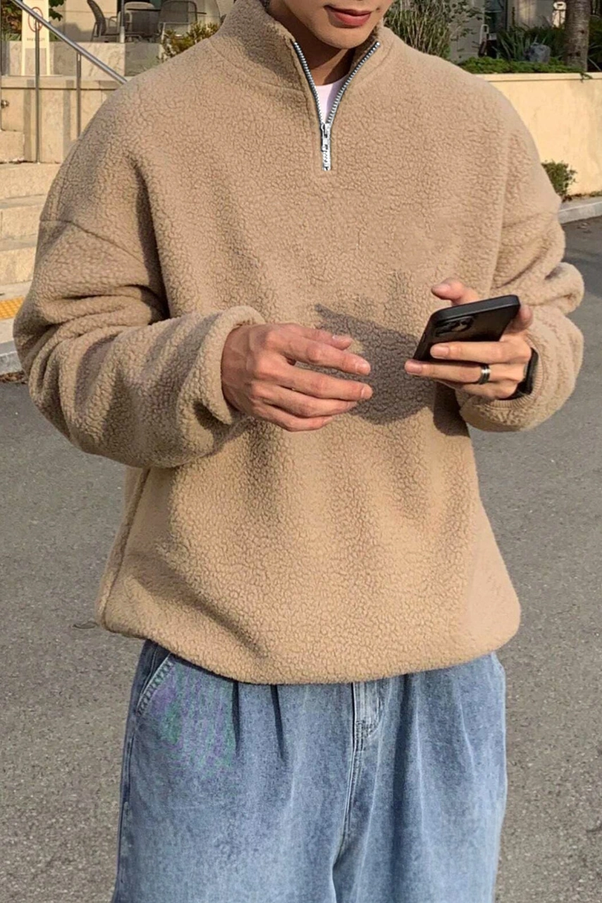 Ghassy Co. Erkek Ultra Isı Peluş Sherpa Oversize Yarım Metal Fermuar Lastik Ayarlı Polar Sweatshirt Bej