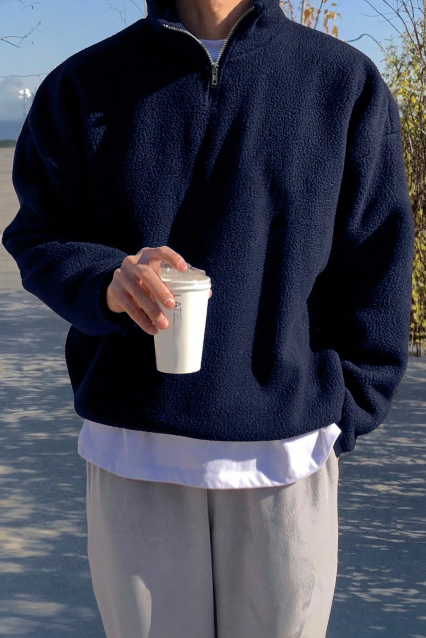 Ghassy Co. Erkek Ultra Isı Peluş Sherpa Oversize Yarım Metal Fermuar Lastik Ayarlı Polar Sweatshirt Lacivert