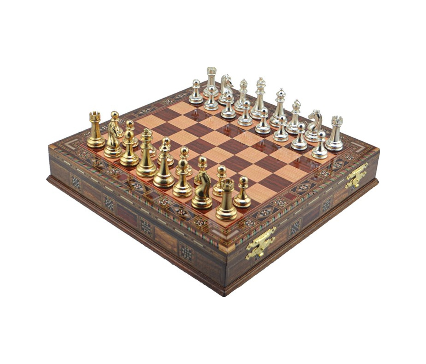 Metal Klasik Satranç Takımı Antik Ve El Yapımı Masif Ahşap Sandık