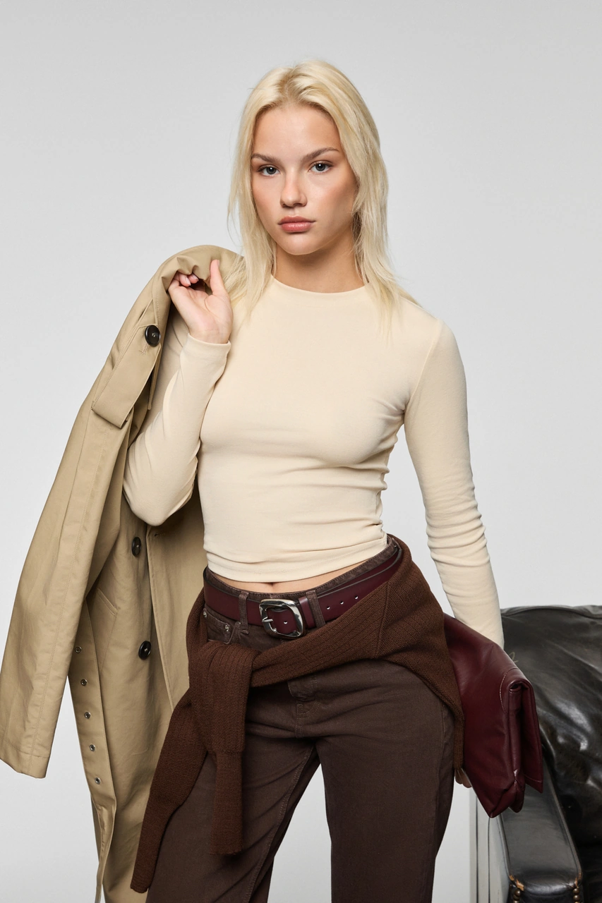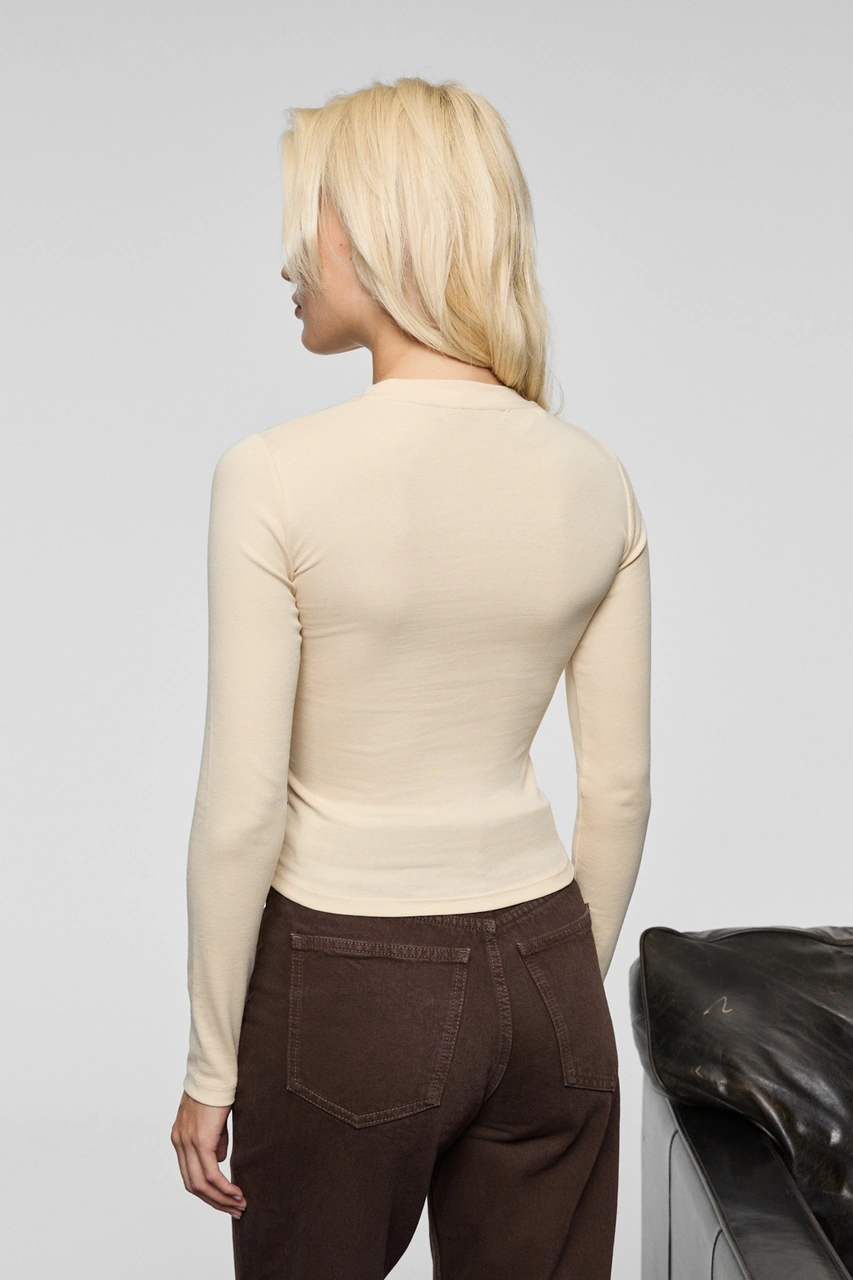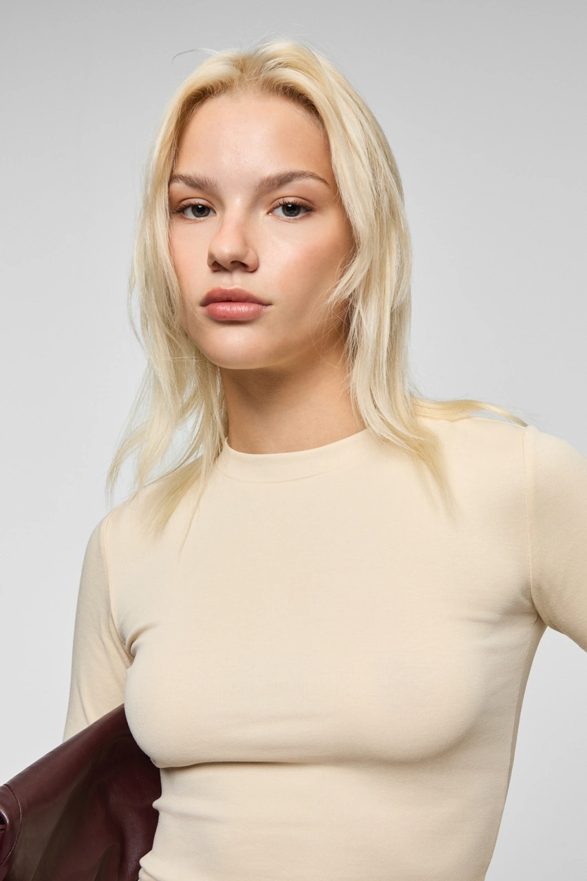 Grımelange Grıgros Kadın Esnek Kumaşlı Vücuda Oturan Slim Fit Uzun Kollu Bej T-shirt Bej