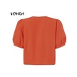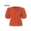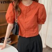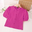 Gül Vonda Kadın Yaz Yuvarlak Yaka Puf Kısa Kollu Düğmeli Düz Renk Bol Bluz Gül