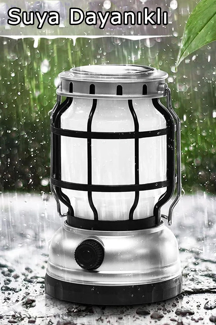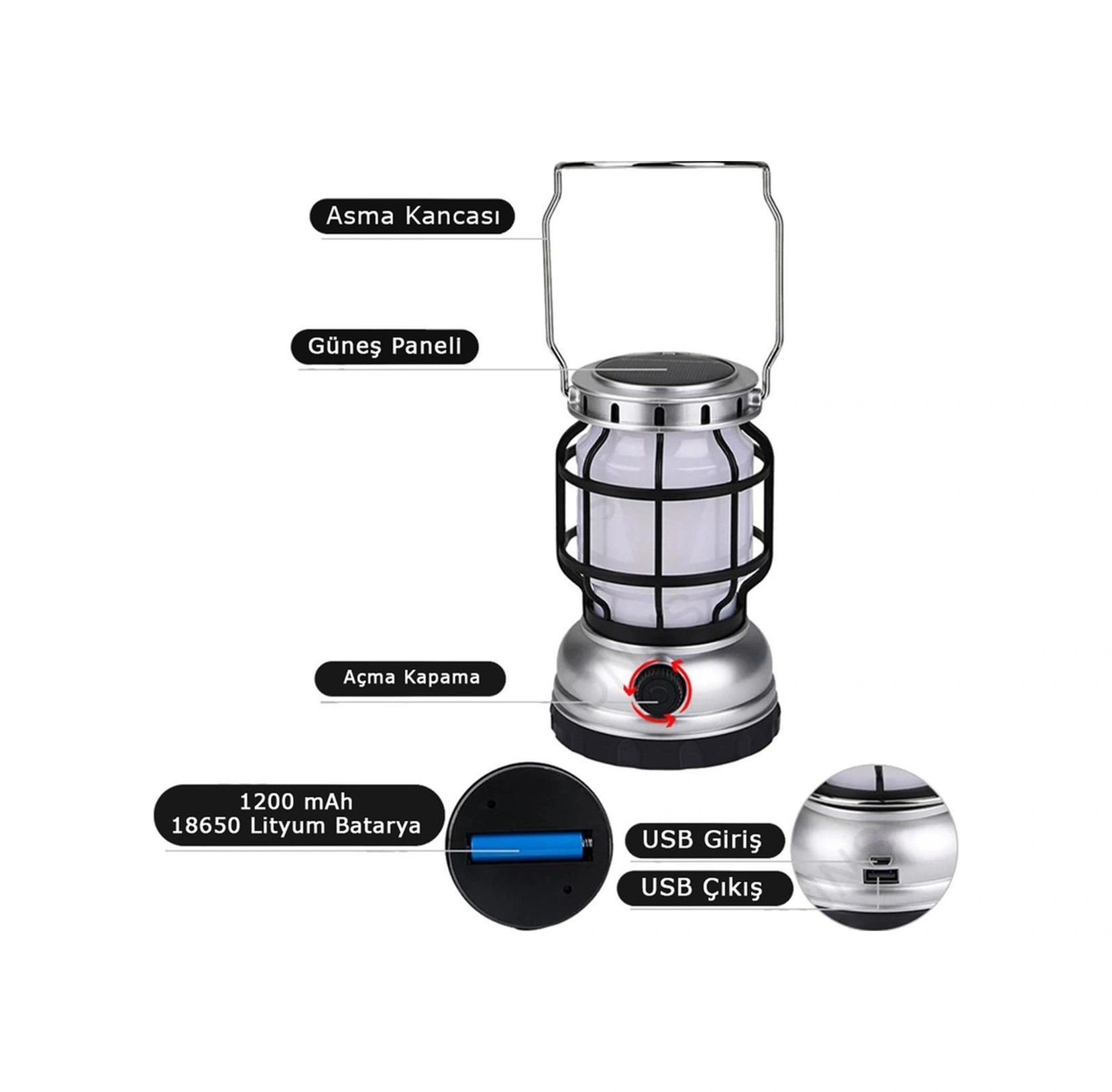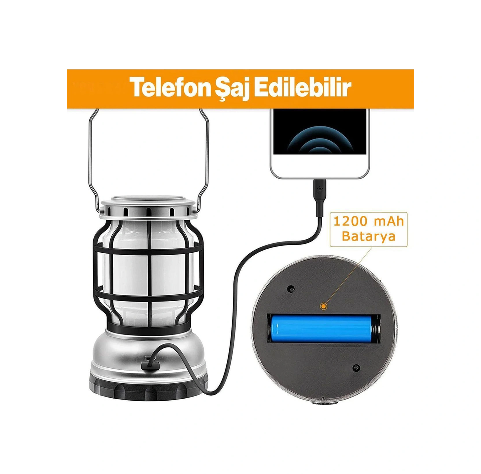 Güneş Enerjili Şarjlı Solar Kamp Lambası Ledli Su Geçirmez Asılabilir El Feneri Powerbank 1200 Mah