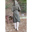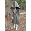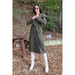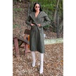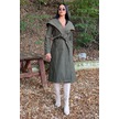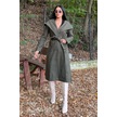 Haki Kruvaze Yaka, Kapüşonlu, Çift Cepli, Beli Kemerli, Uzun Kaşe Kaban Astarsız Haki