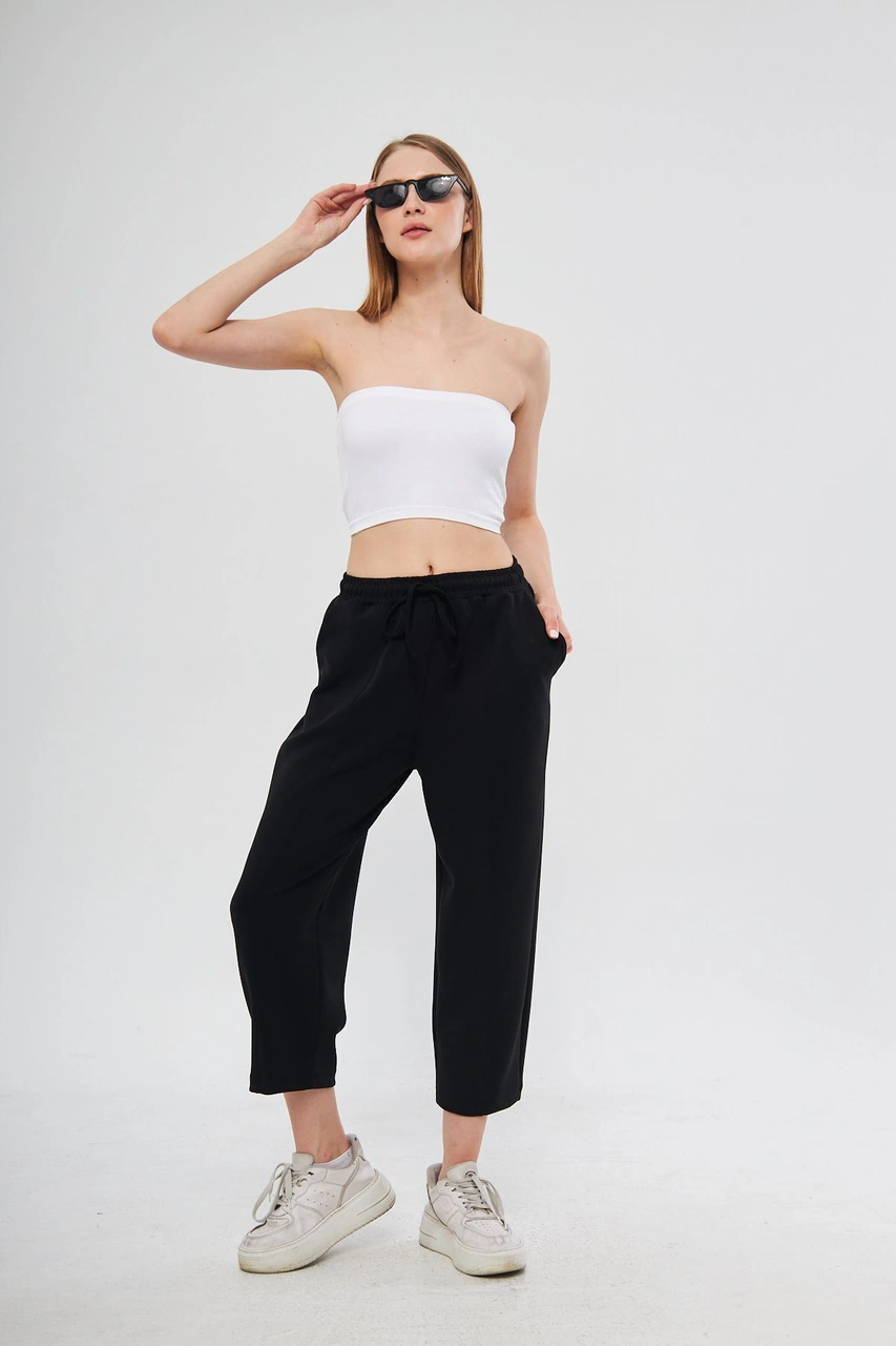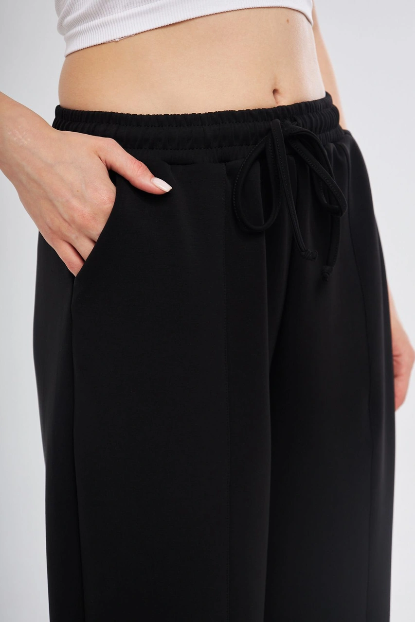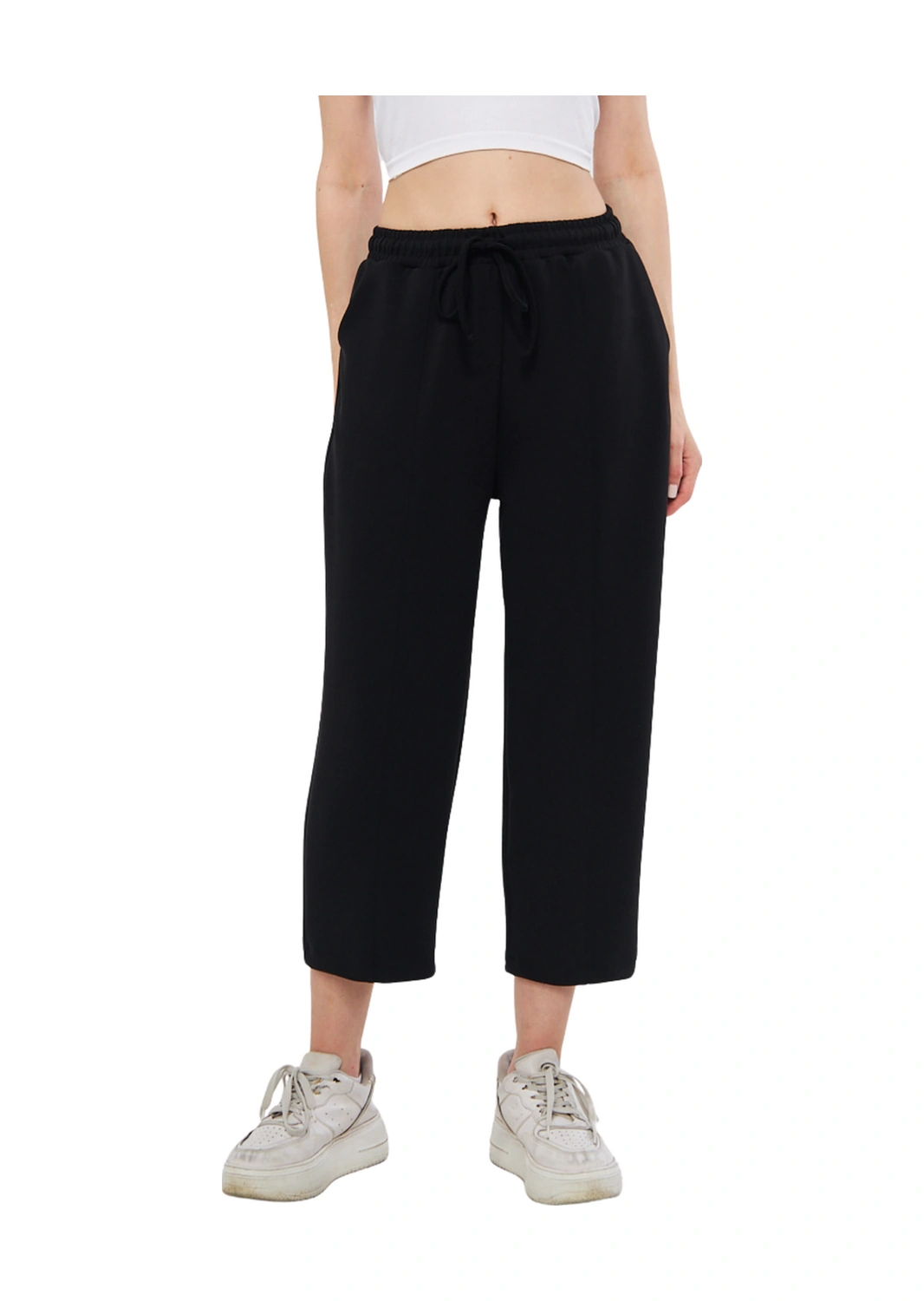 Haki Ultra Yumuşak, Dikiş Detaylı Havuç Kesim Bağcıklı Lastikli Bilek Boy Kadın Modal Pantolon Siyah