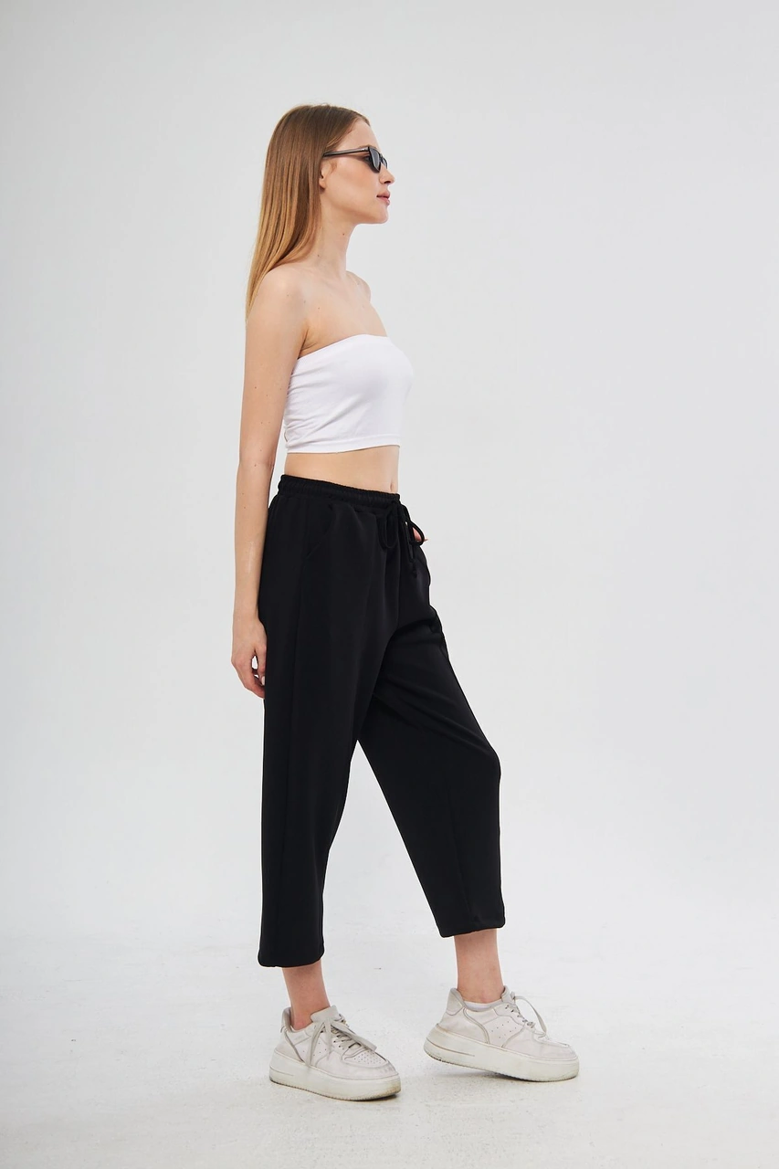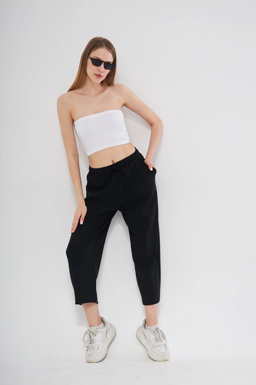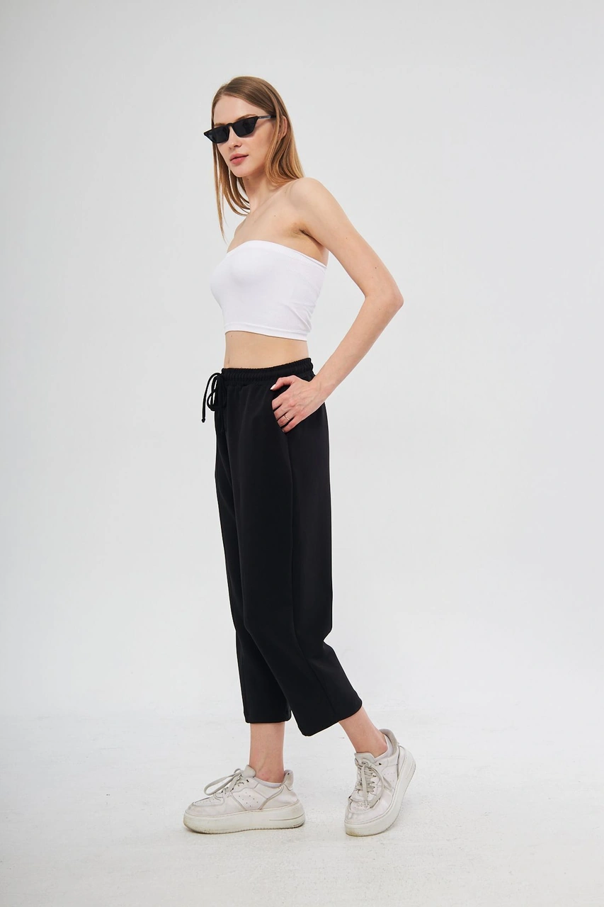 Haki Ultra Yumuşak, Dikiş Detaylı Havuç Kesim Bağcıklı Lastikli Bilek Boy Kadın Modal Pantolon Siyah