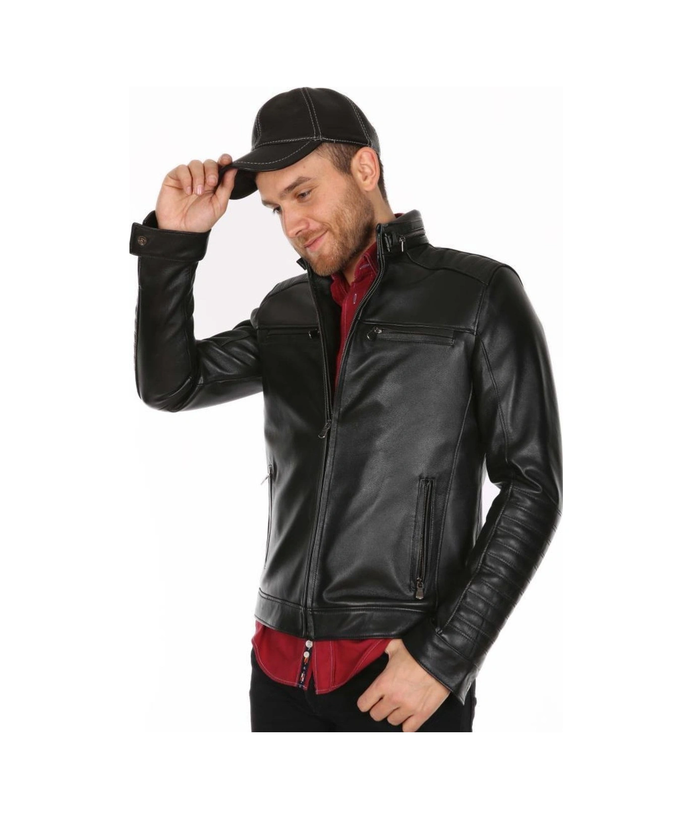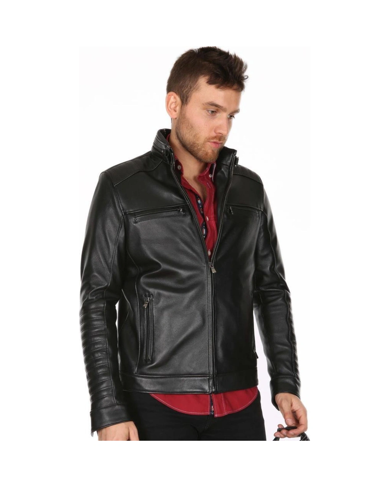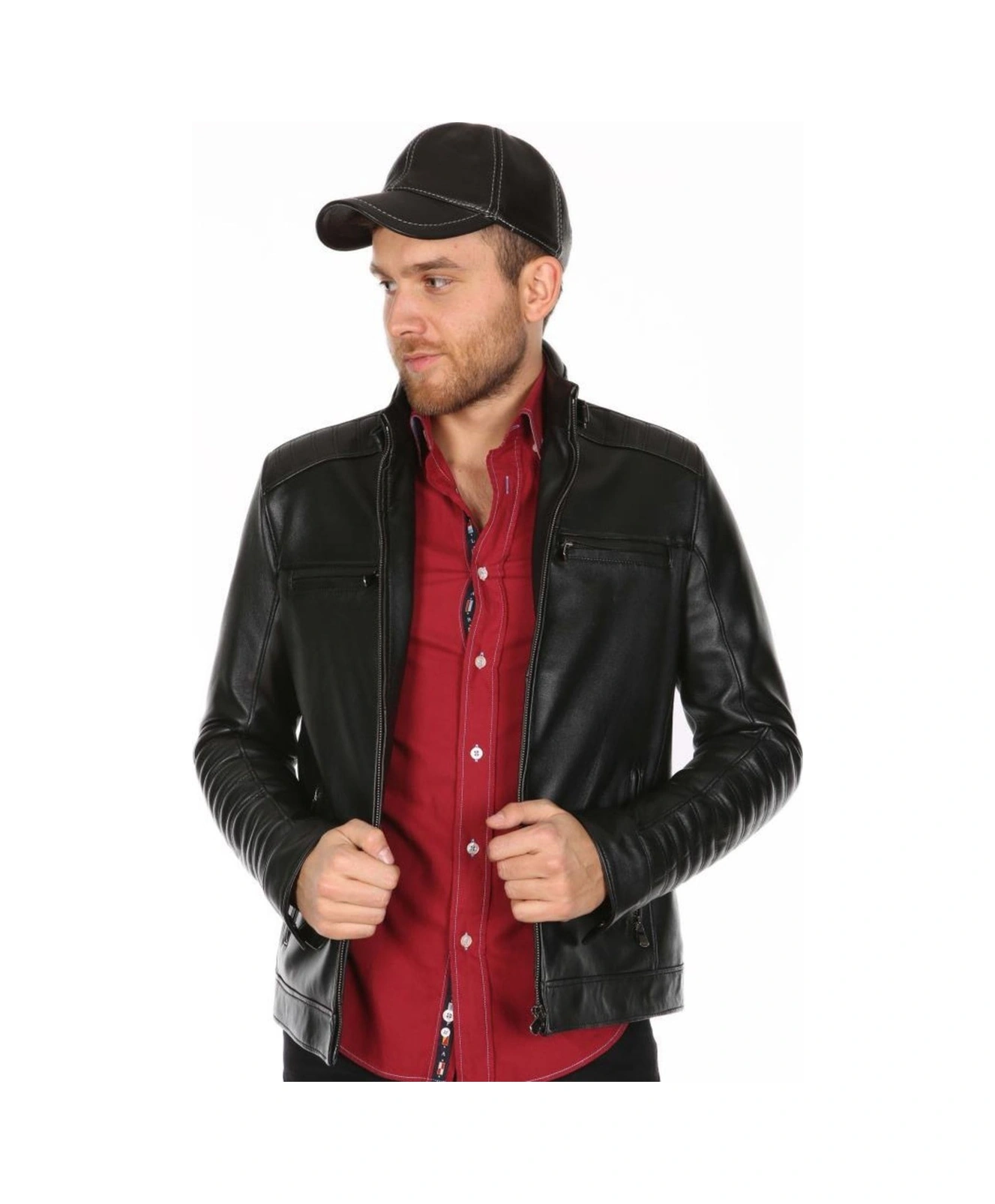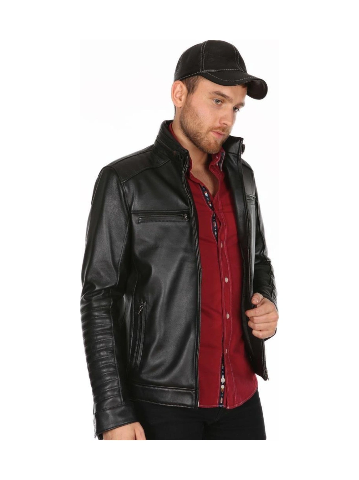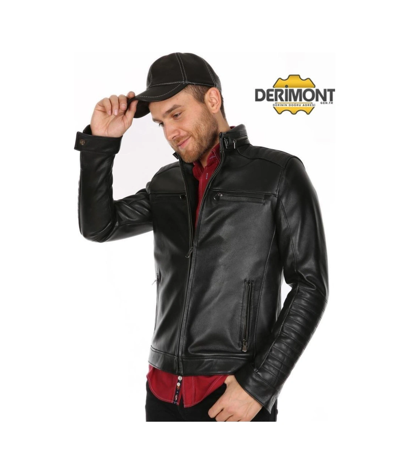 Hakiki Deri Siyah Kol Omuz Işlemeli Erkek Deri Ceket Siyah