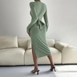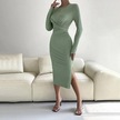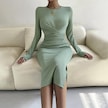 Hnxc Kadın Moda Yaz Bahar Düz Renk Baskı Uzun Kollu O-boyun Yüksek Bel Günlük Elbiseler Açık Yeşil