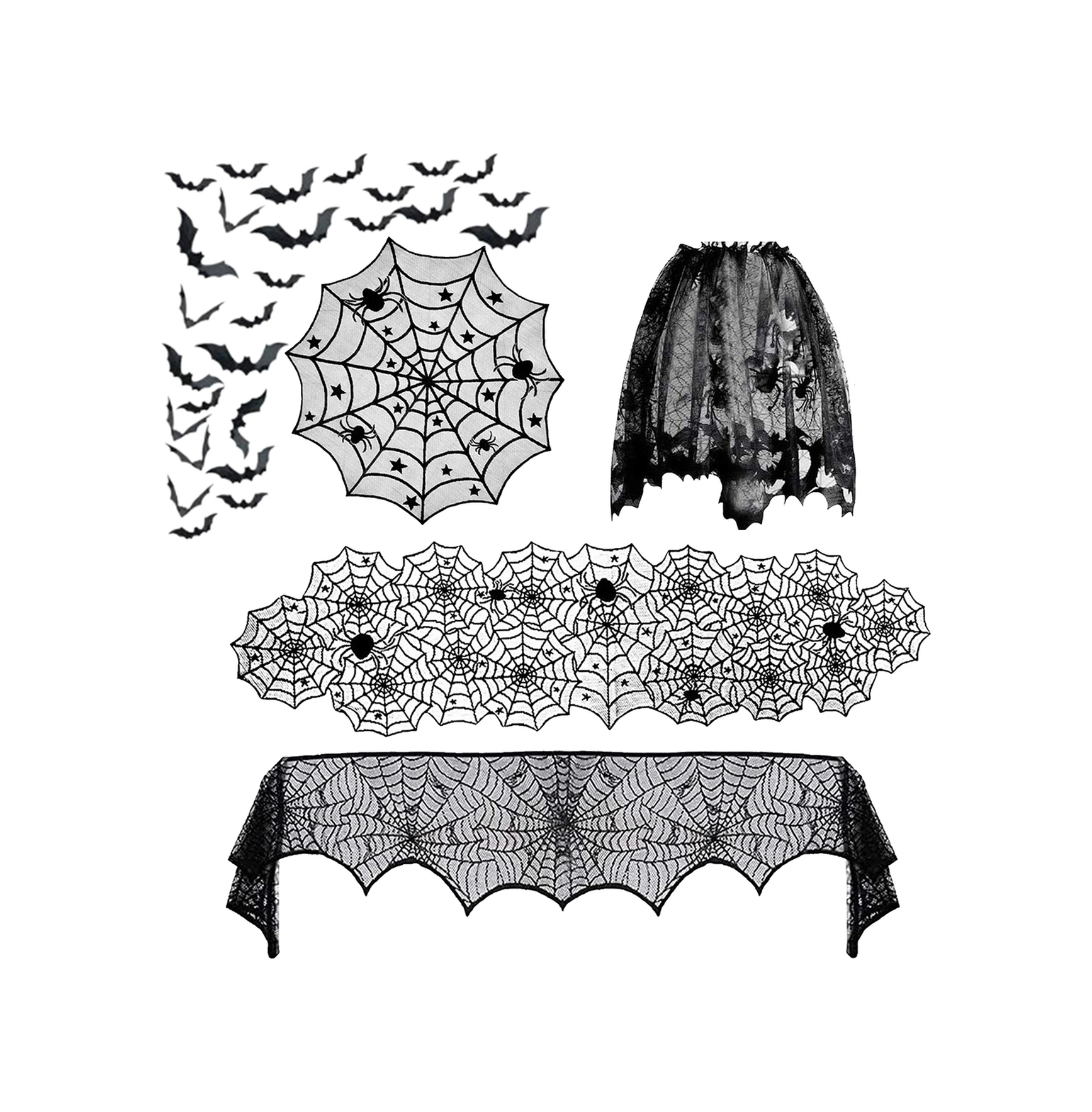 Hombey Halloween Ev Dekorasyon Seti: Örümcek Ağı Masa Örtüsü, Masa Runner, Fenerlik, Kamin Örtüsü Ve 36 Adet Yarasa Duvar Sticker'ı - Korkunç Parti Atmosferi İçin 5 Parça Tam Set Siyah