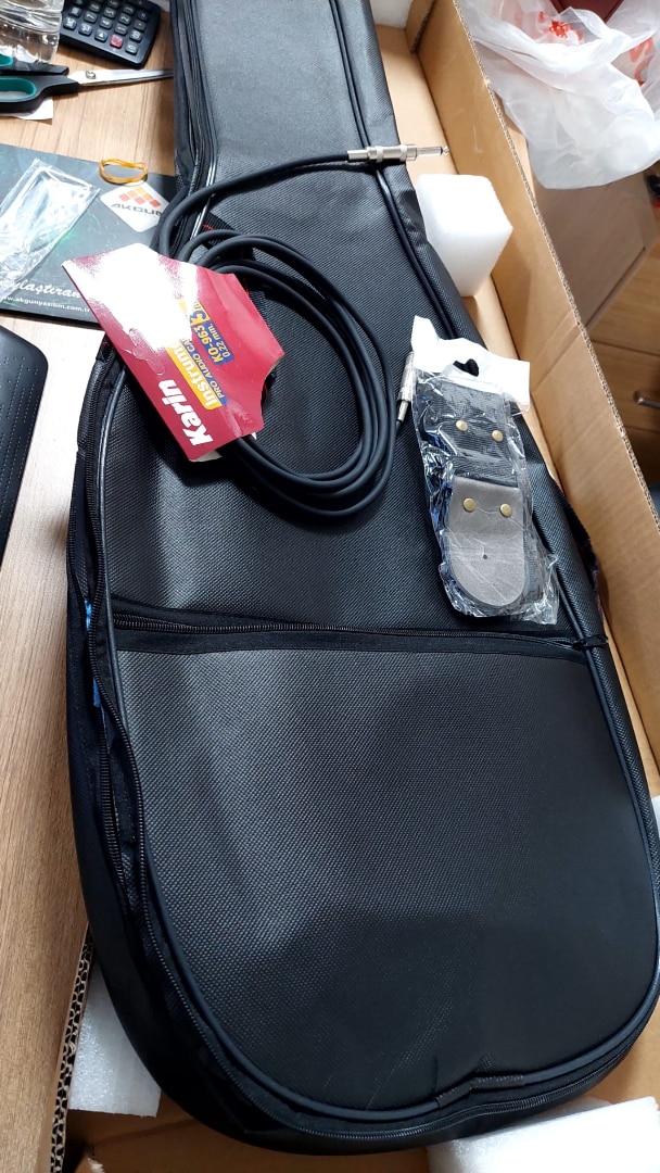 Ayni gun kargoya verildi, patpata defaten sarılmış, kendi karton kutusu icerisinde çizilmeden, kirilmadan geldi. kizim yeni basladi, iyi bir baslangic gitari dediler. magazadan memnunum. kablo, kilif, pena hediye. gitar uzerindeki bulutlar yesile caliyor fotograf yaniltiyor