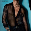 İncerun Yaz Erkek Uzun Kollu Gömlek İnce Düğme Clubwear Parti Siyah Üstler Siyah