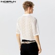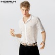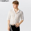 Incerun Yaz Erkek Yarım Kol Şeffaf Fileli İplik Dantel Gömlekler Beyaz
