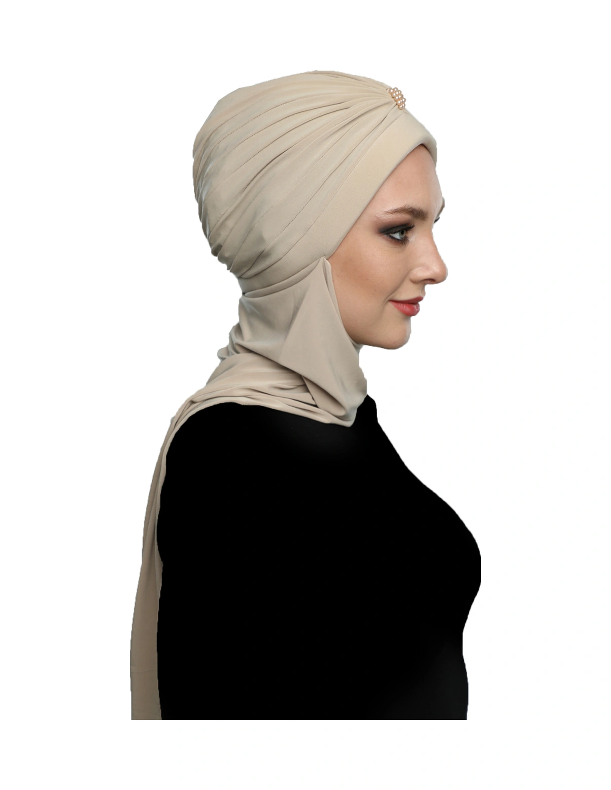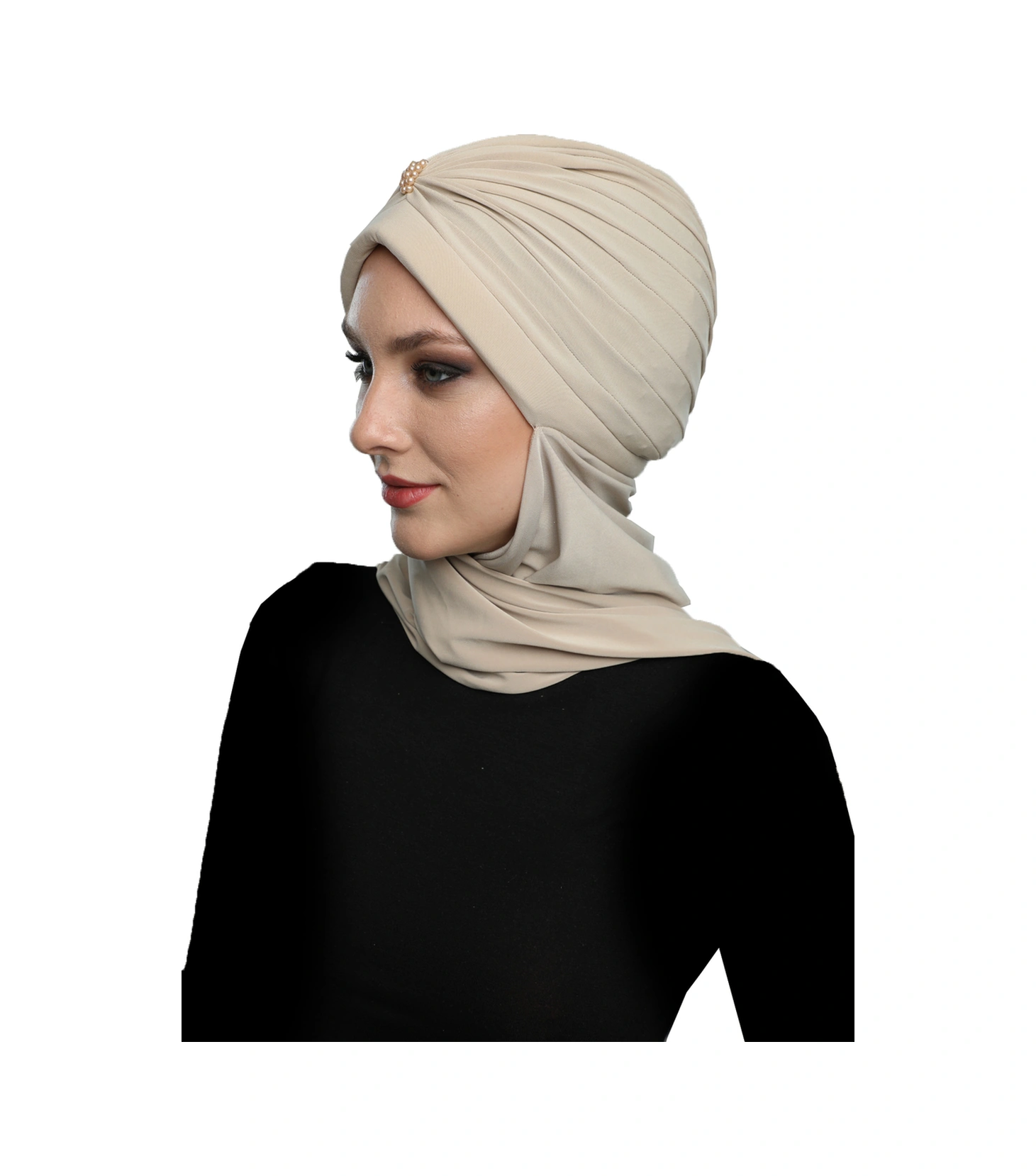 Incili Atkılı El Işi Inci Işlemeli Bej Hazır Türban Tesettür Bone Bej