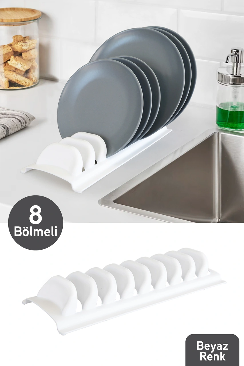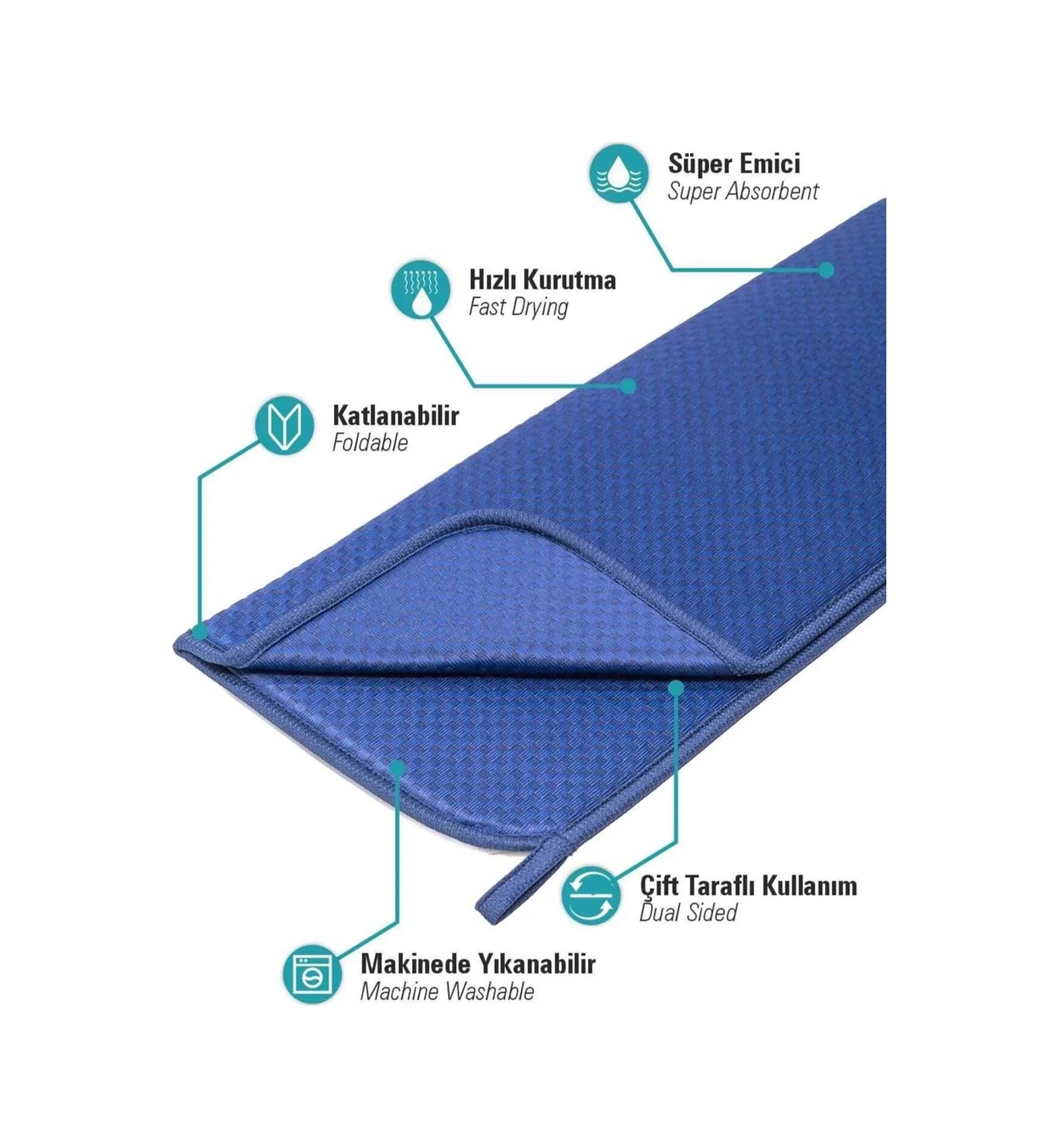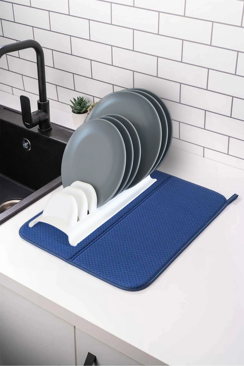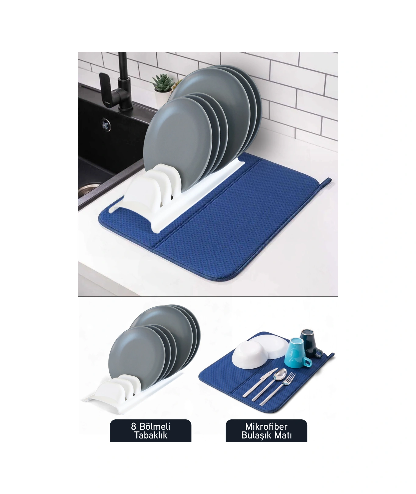 İronika Mikrofiber Bulaşık Kurutma Matı Ve 8 Bölmeli Tabaklık Bulaşıklık Set Beyaz - Mavi