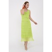 Italyan 2 Beden İnce Gösteren Kat Kat Kolsuz Ipek Elbise Neon Yeşil