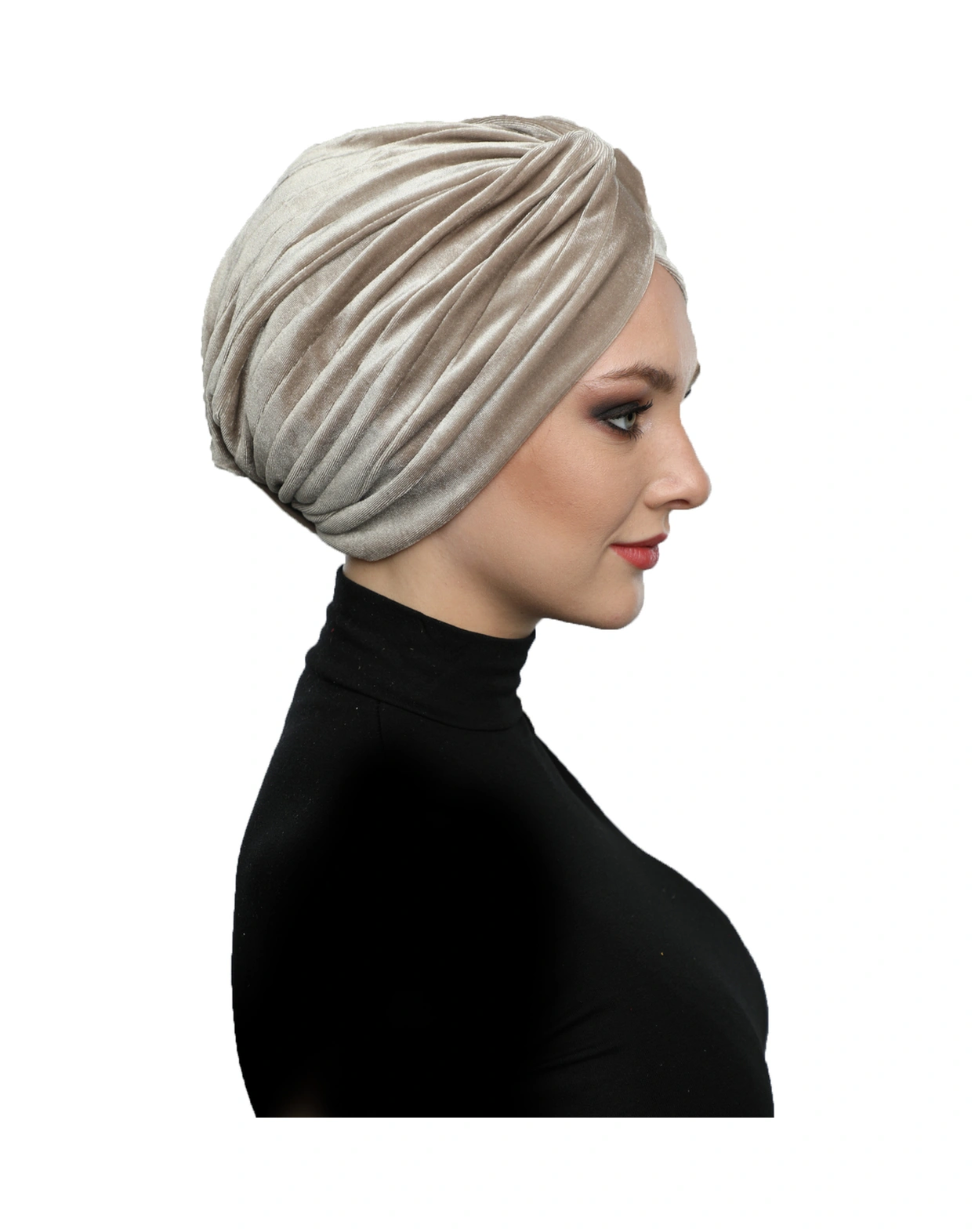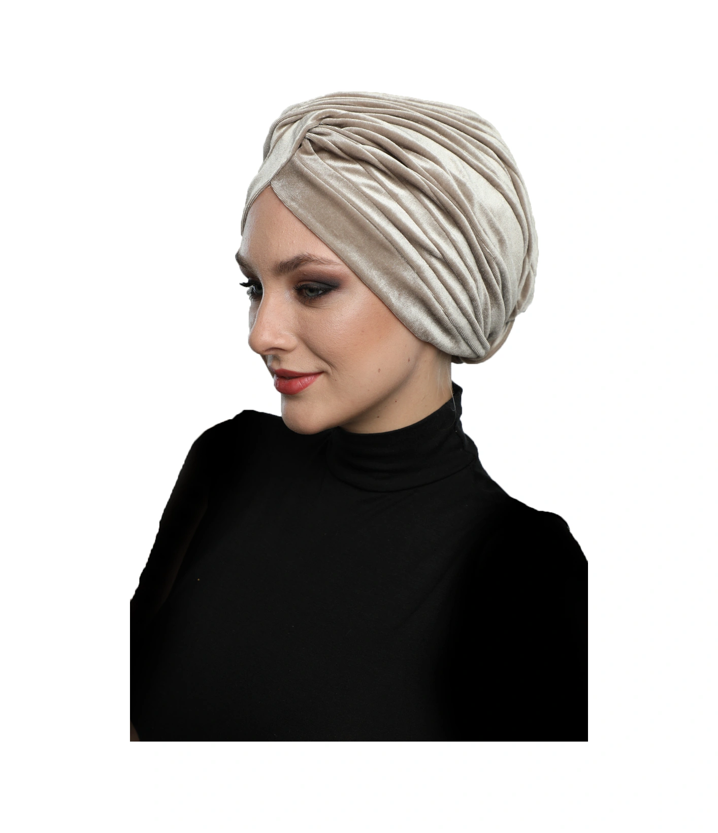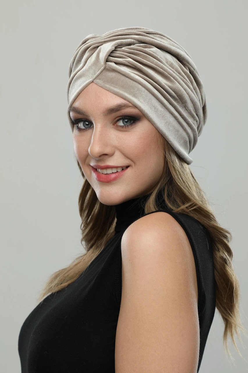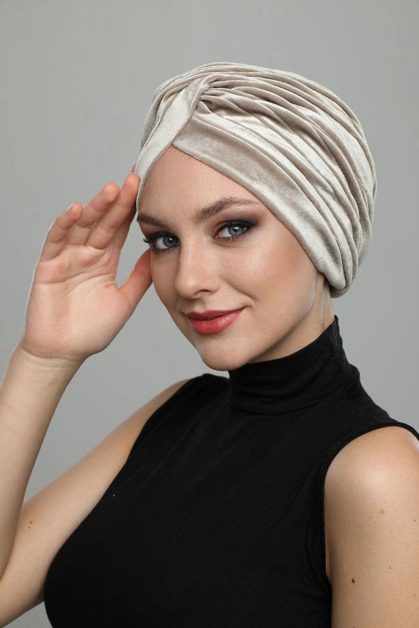 Kadife Çapraz Bej Hazır Türban Tesettür Bone Bej