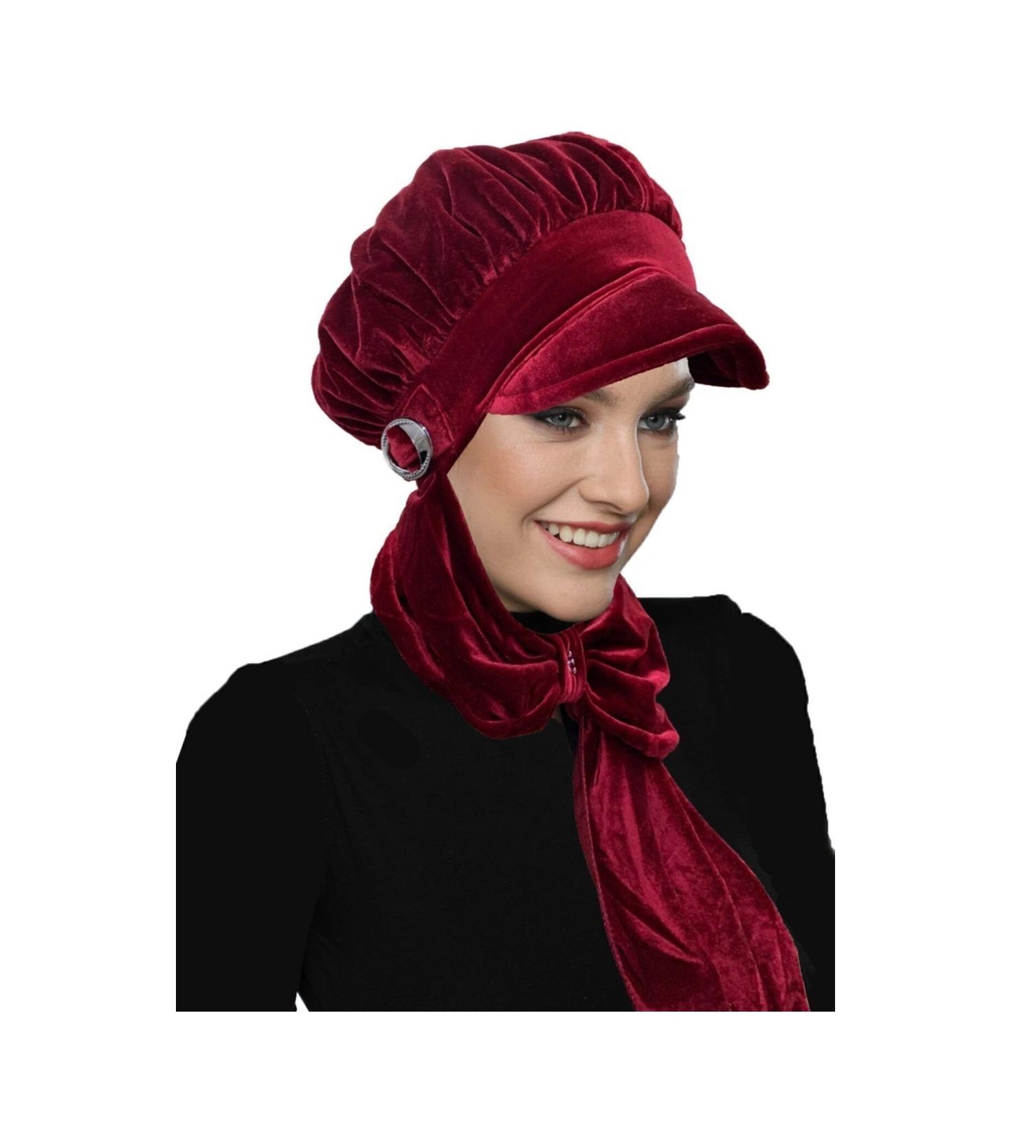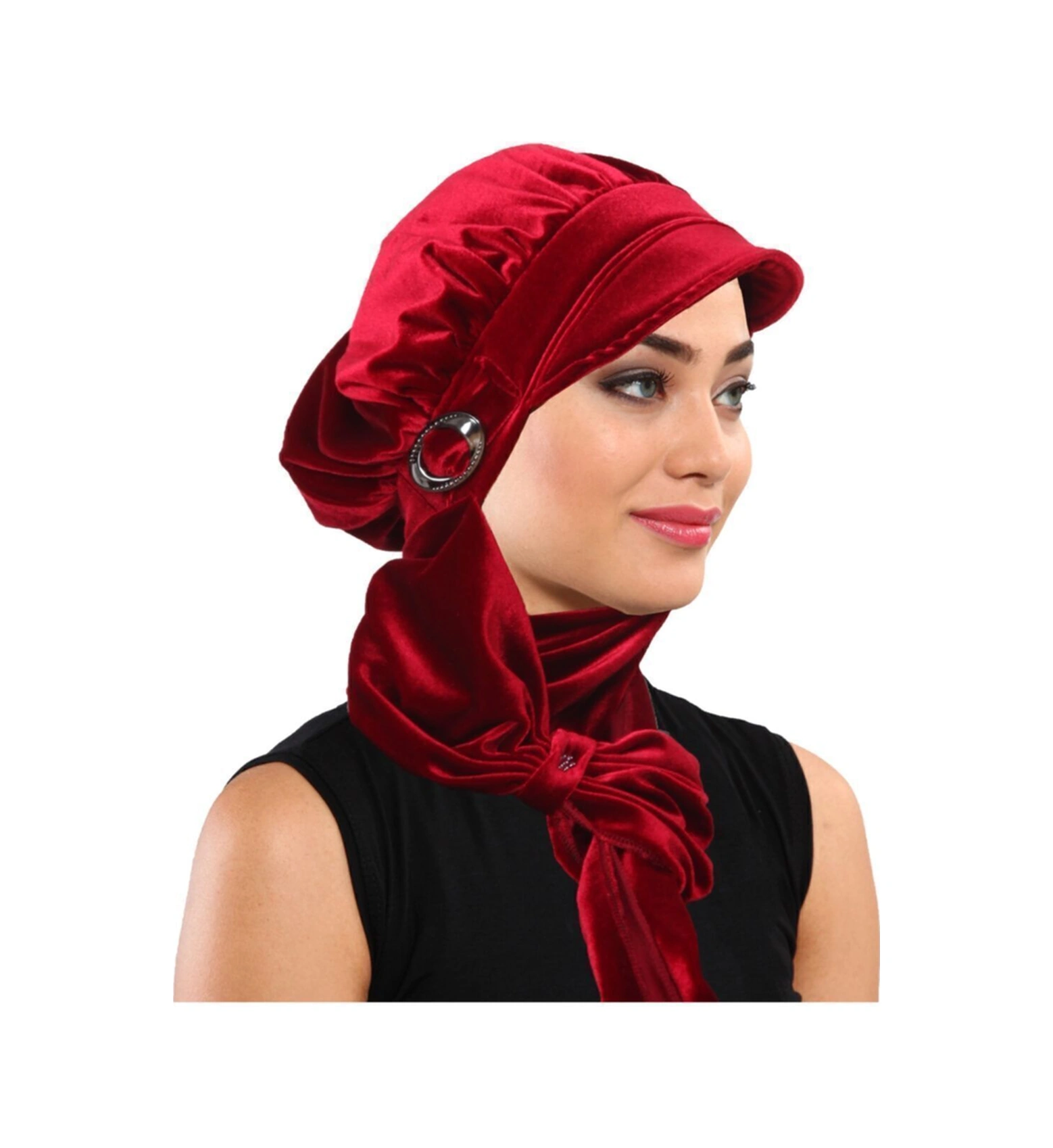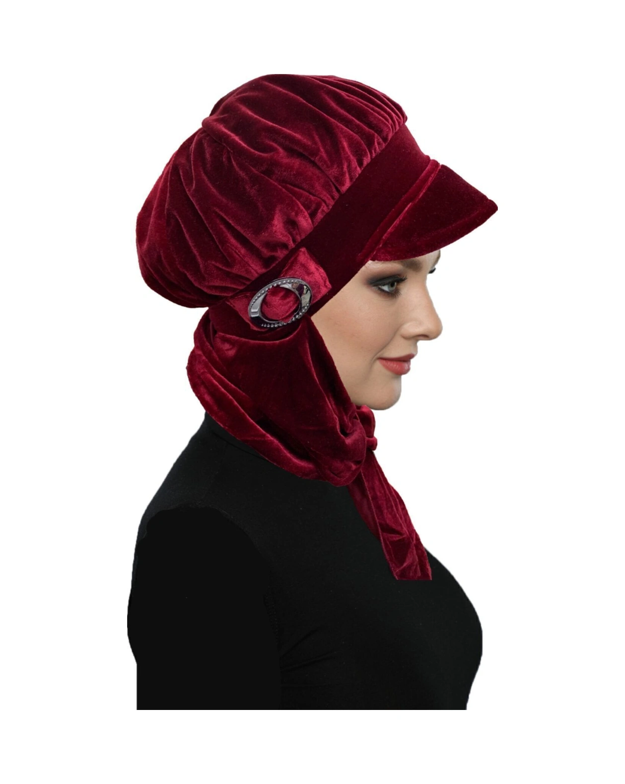 Kadife Şapka Atkılı Toka Detaylı Bordo Hazır Türban Tesettür Bone Bordo