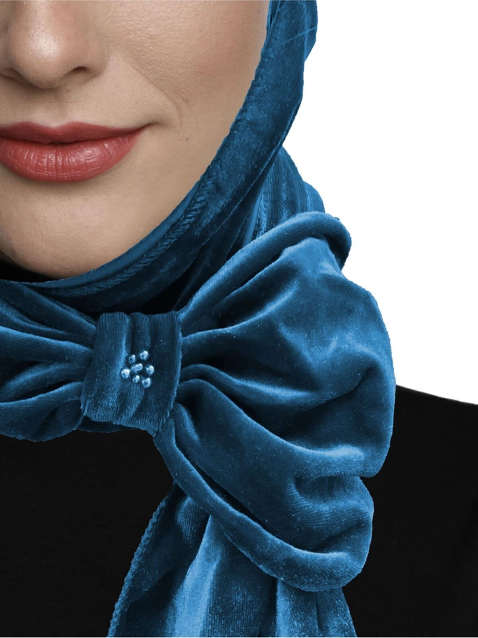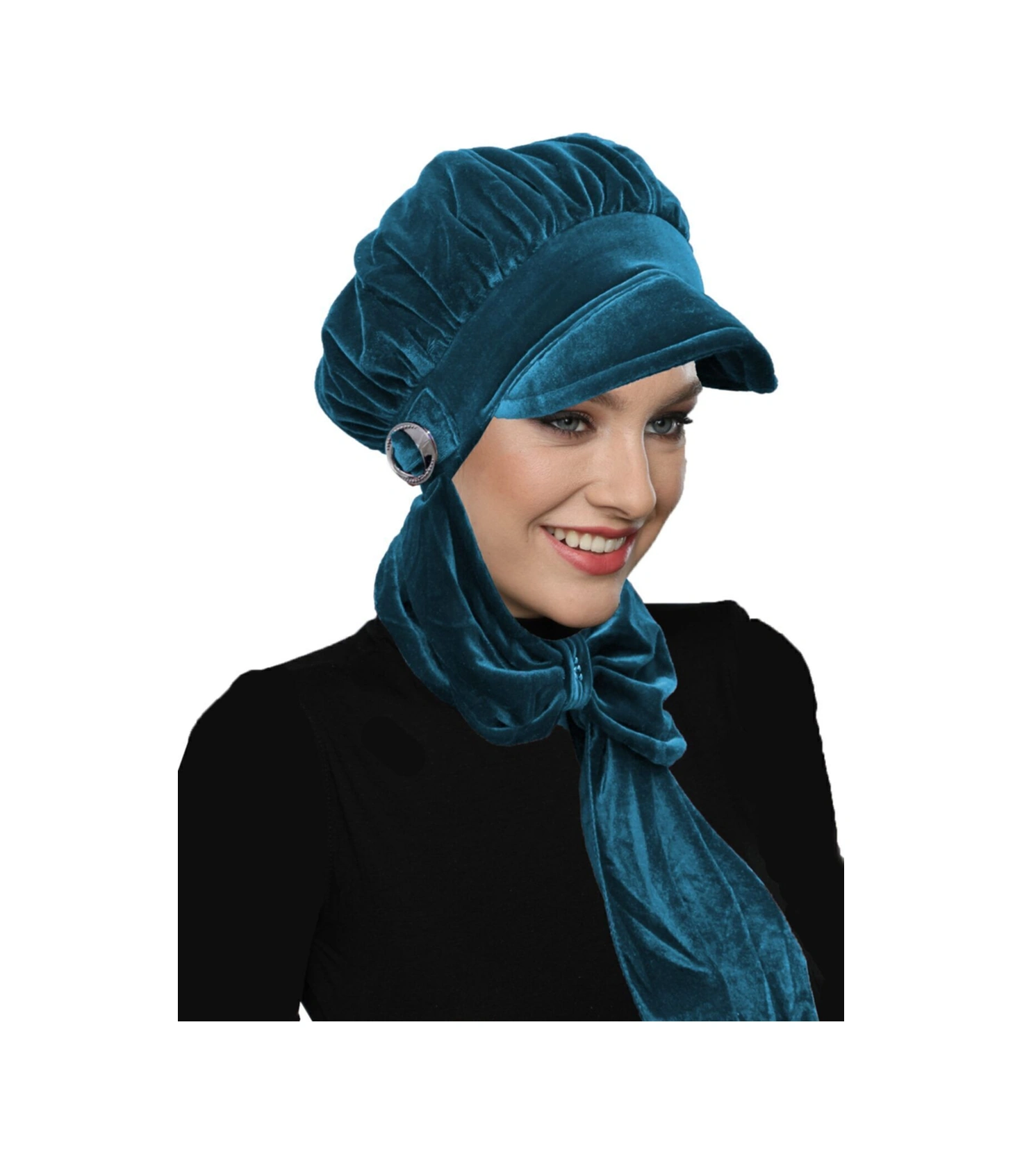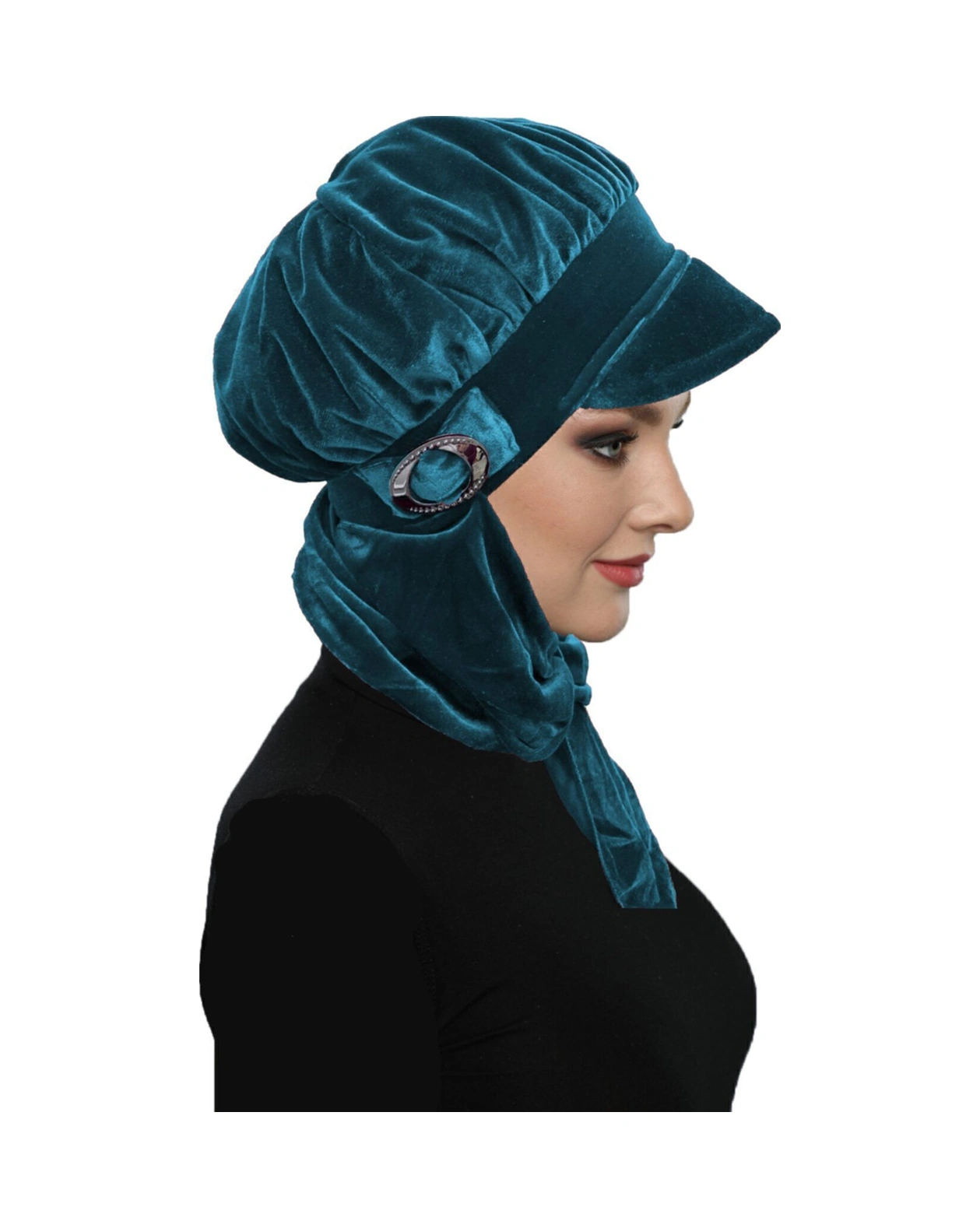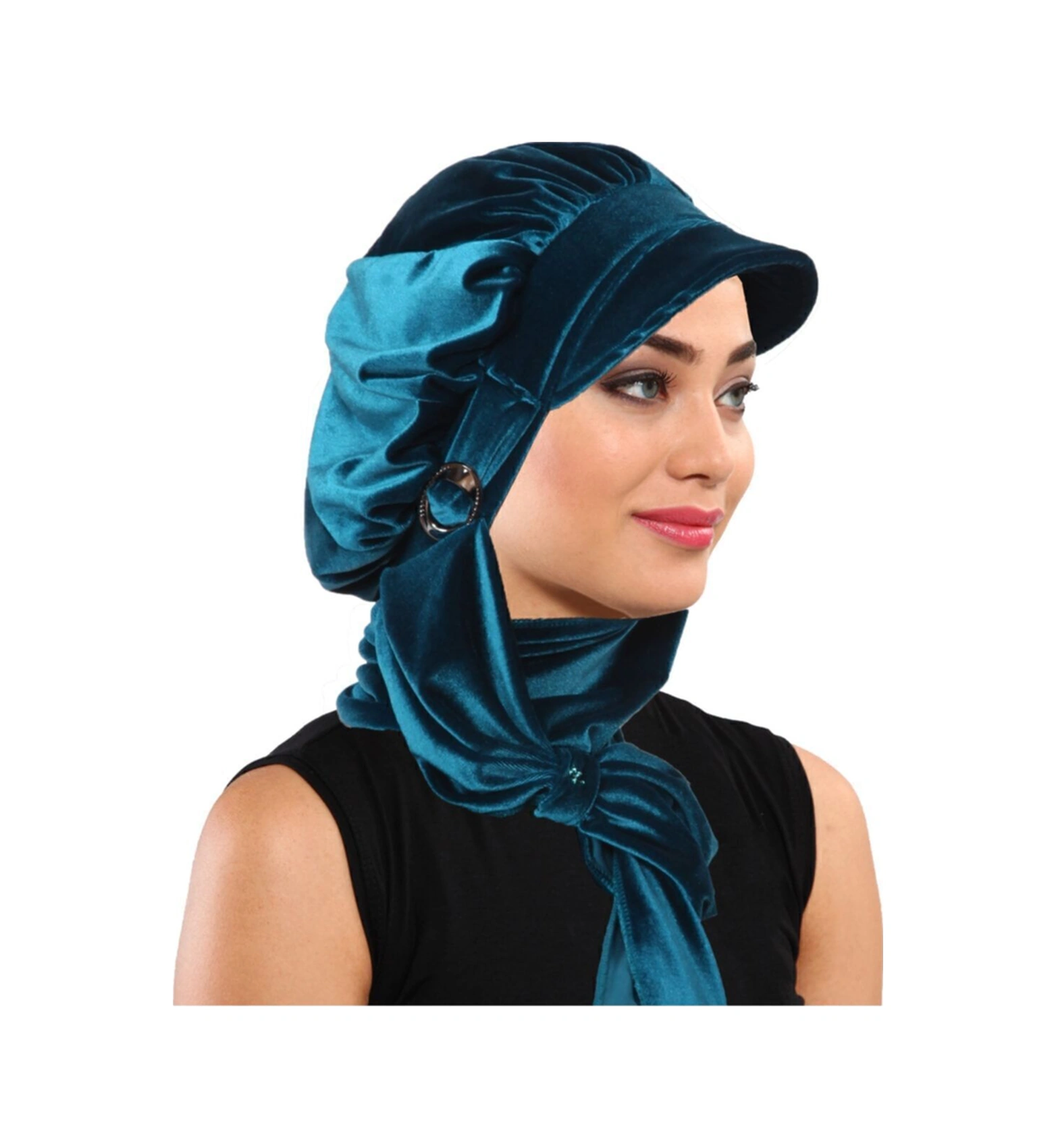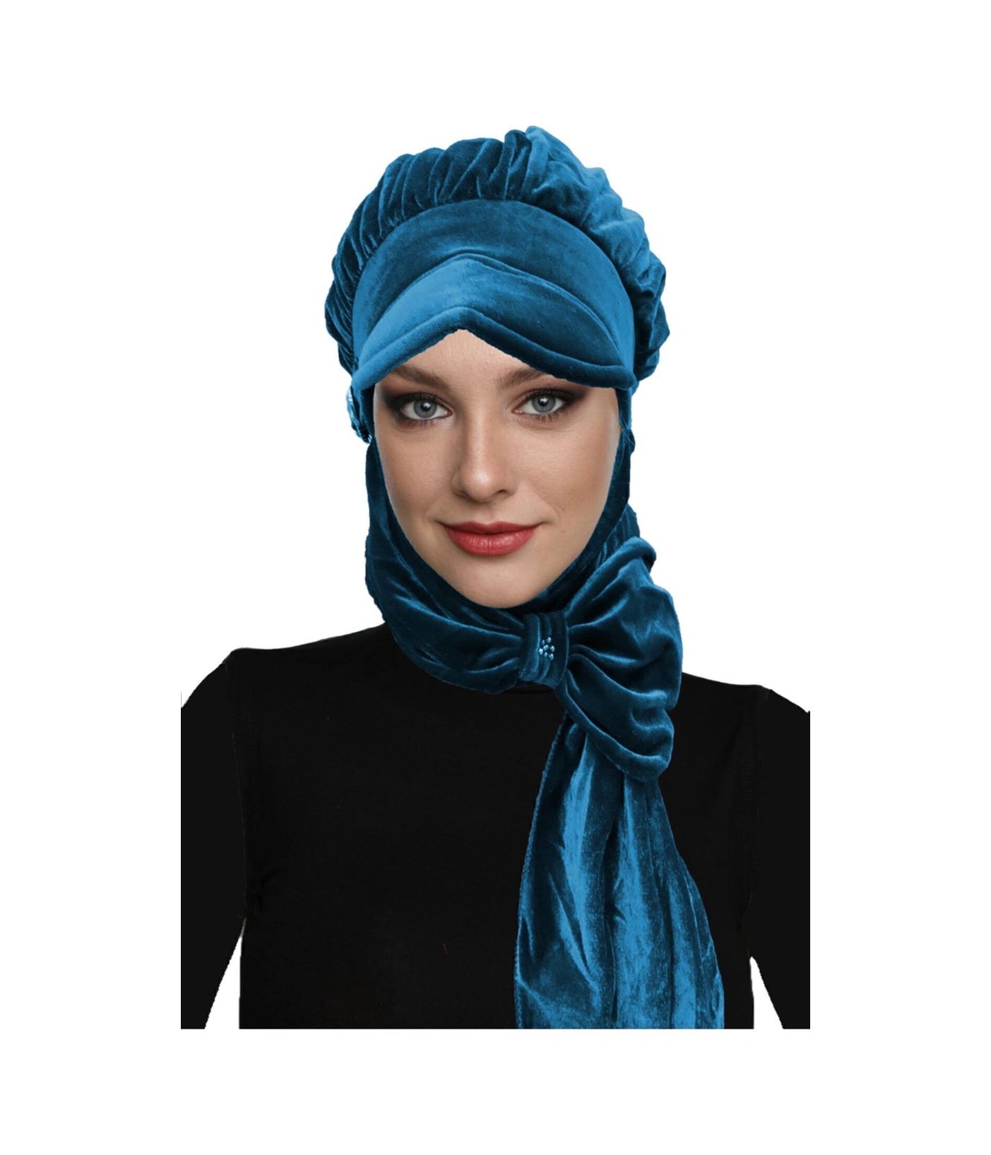 Kadife Şapka Atkılı Toka Detaylı Petrol Hazır Türban Tesettür Bone Petrol