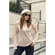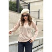 Kadın Bej Basic Stil Polo Yaka Uzun Kollu Keten Bluz Sweatshirt Bej