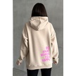 Kadın Bej Do What Makes You Happy Baskılı Oversize Kapüşonlu Sweatshirt Bej