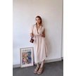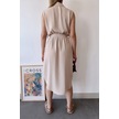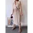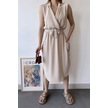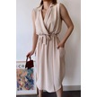 Kadın Bej Kalın Askılı, Kruvaze Yaka, Düz Desen, Aerobin Yırtmaçlı, Kemerli Midi Elbise Bej
