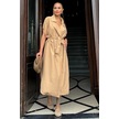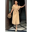 Kadın Bej Kruvaze Yaka, Kısa Kollu, Kemer Detaylı, Rahat Kesim, Midi Keten Elbise Bej