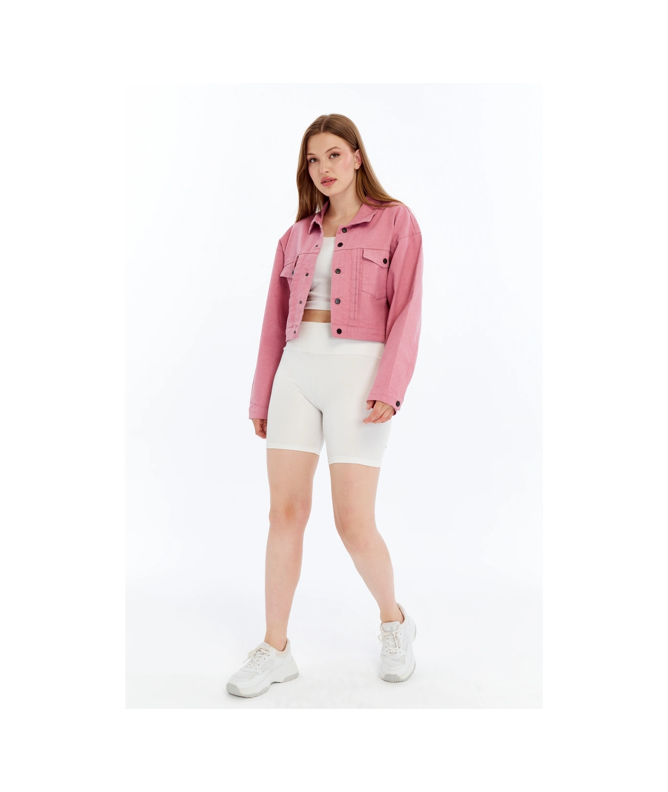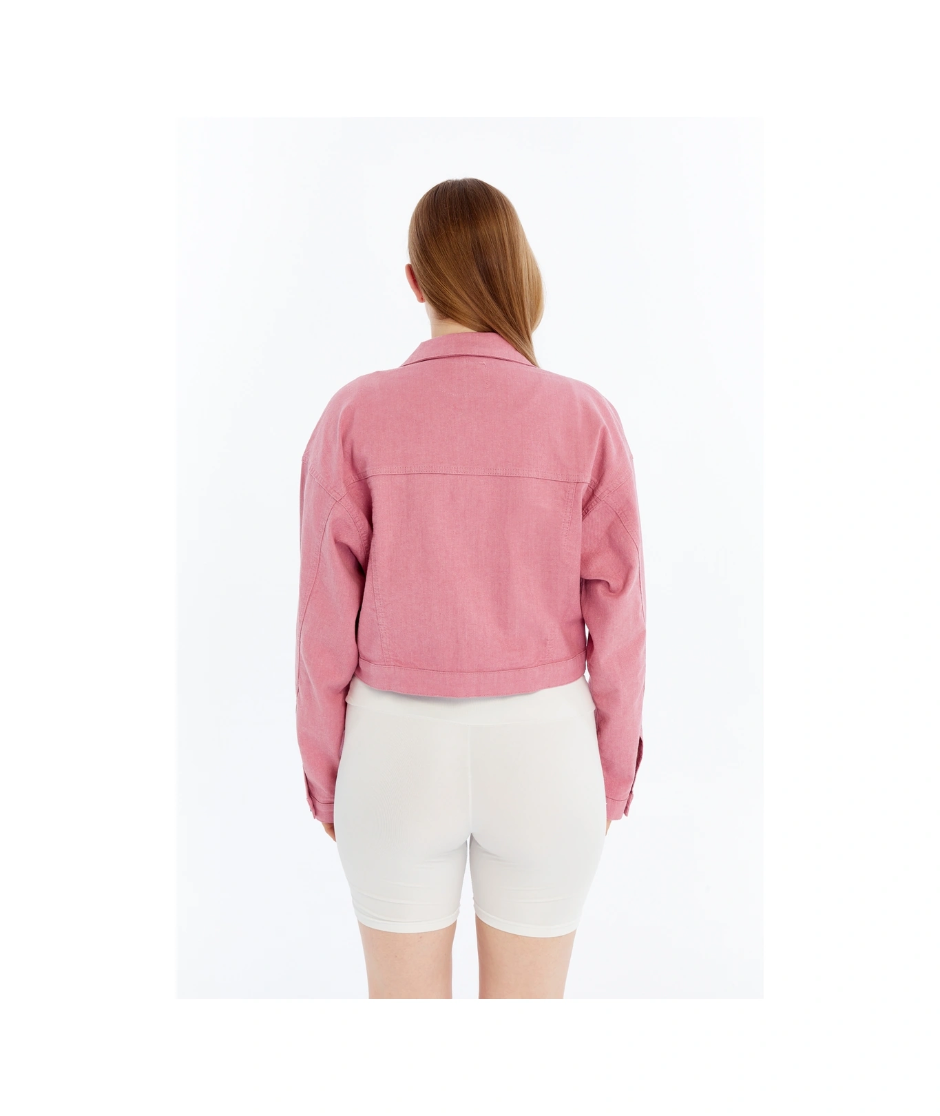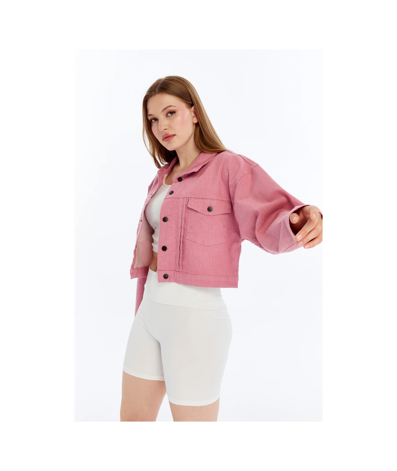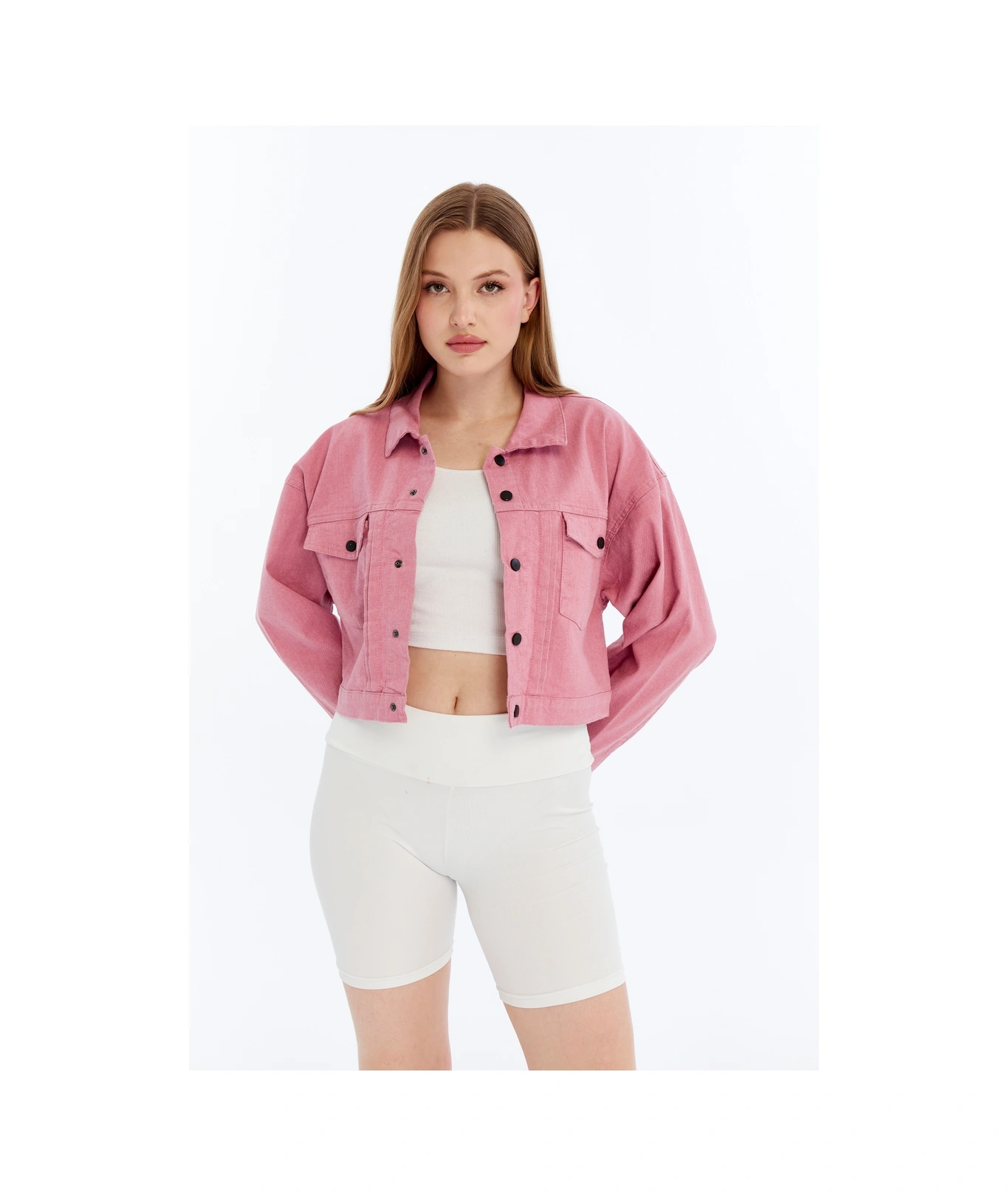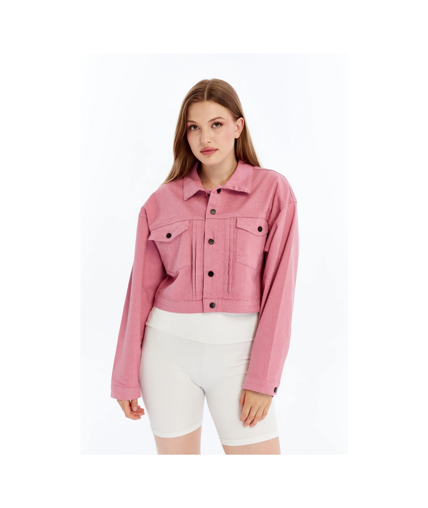 Kadın Bomber Gabardin Ceket Çıt Çıt Düğmeli Kolej Kot Ceket Cepli Renkli Kolay Kombinlenebilen Ceket Pembe