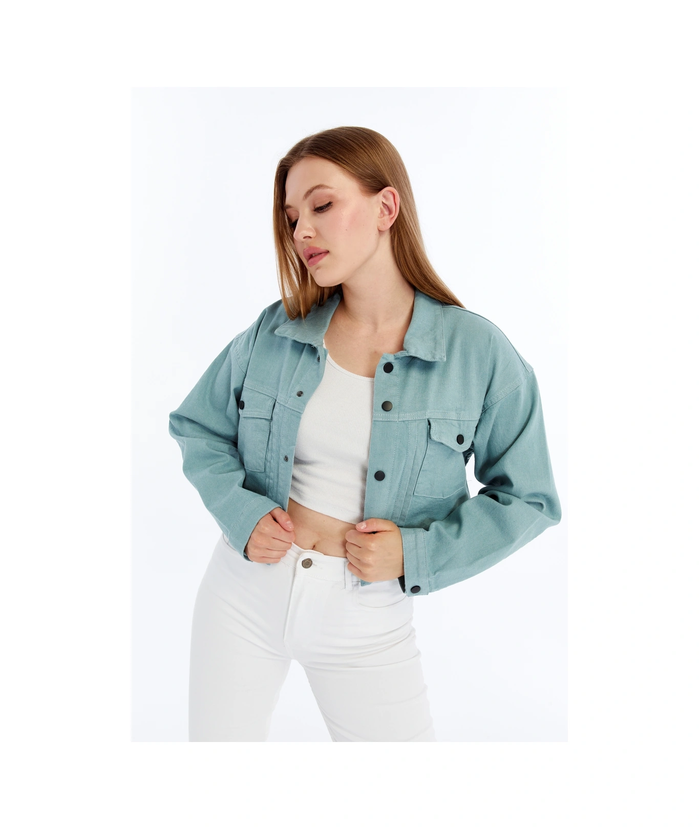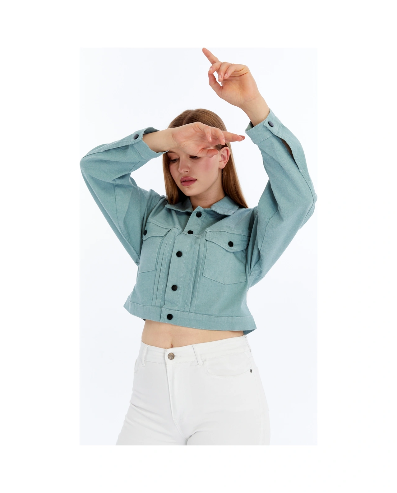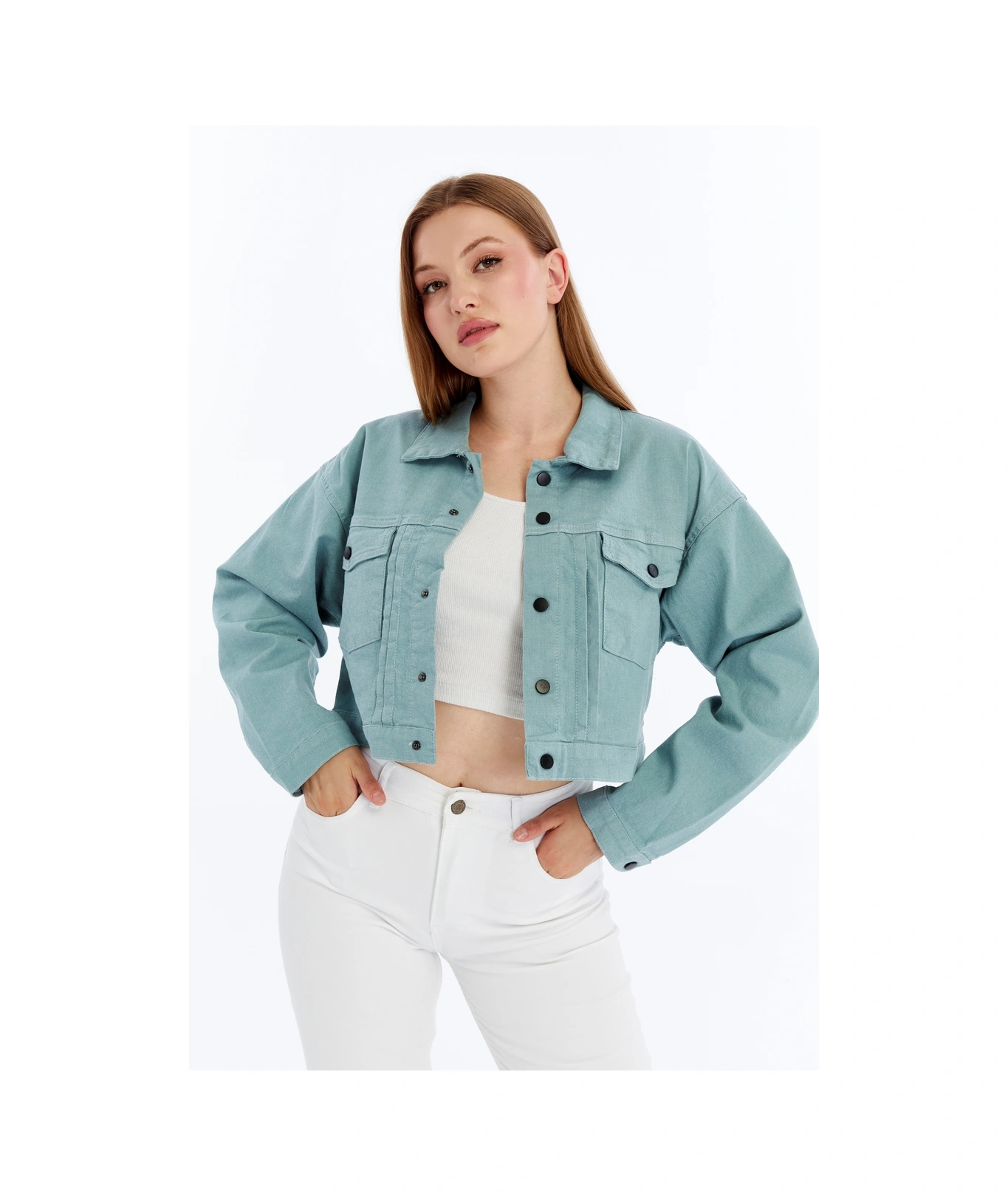 Kadın Bomber Gabardin Ceket Çıt Çıt Düğmeli Kolej Kot Ceket Cepli Renkli Kolay Kombinlenebilen Ceket Yeşil