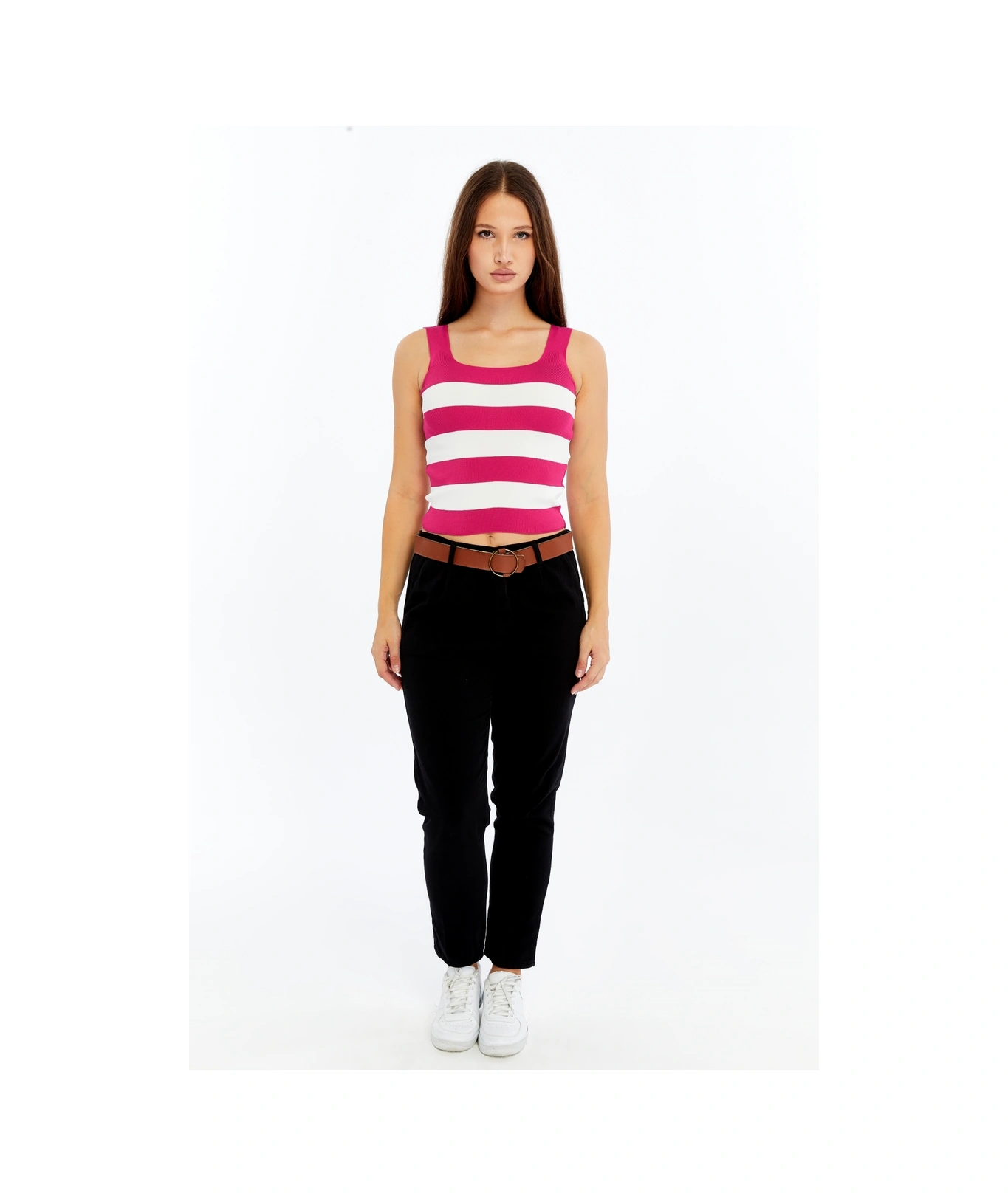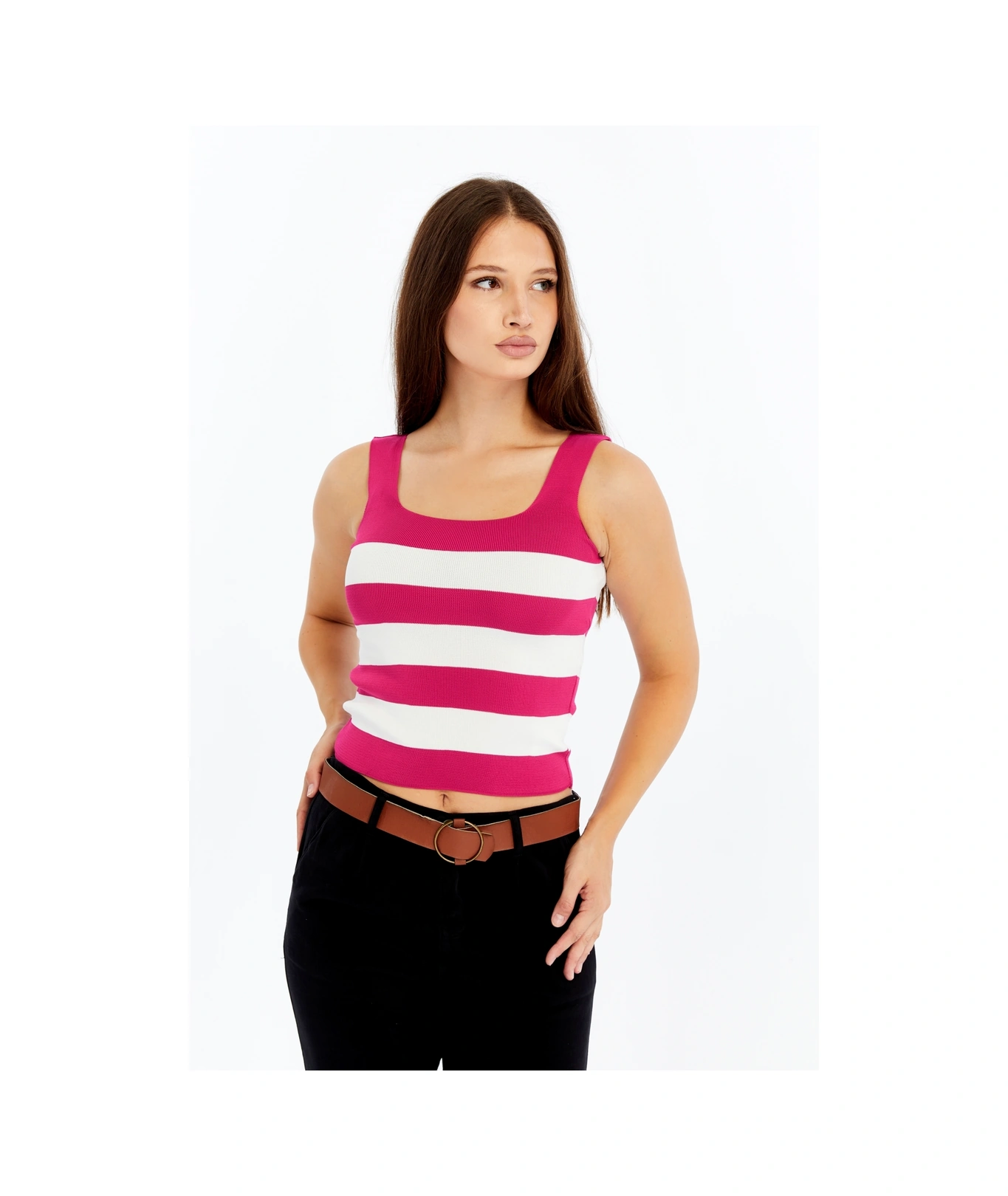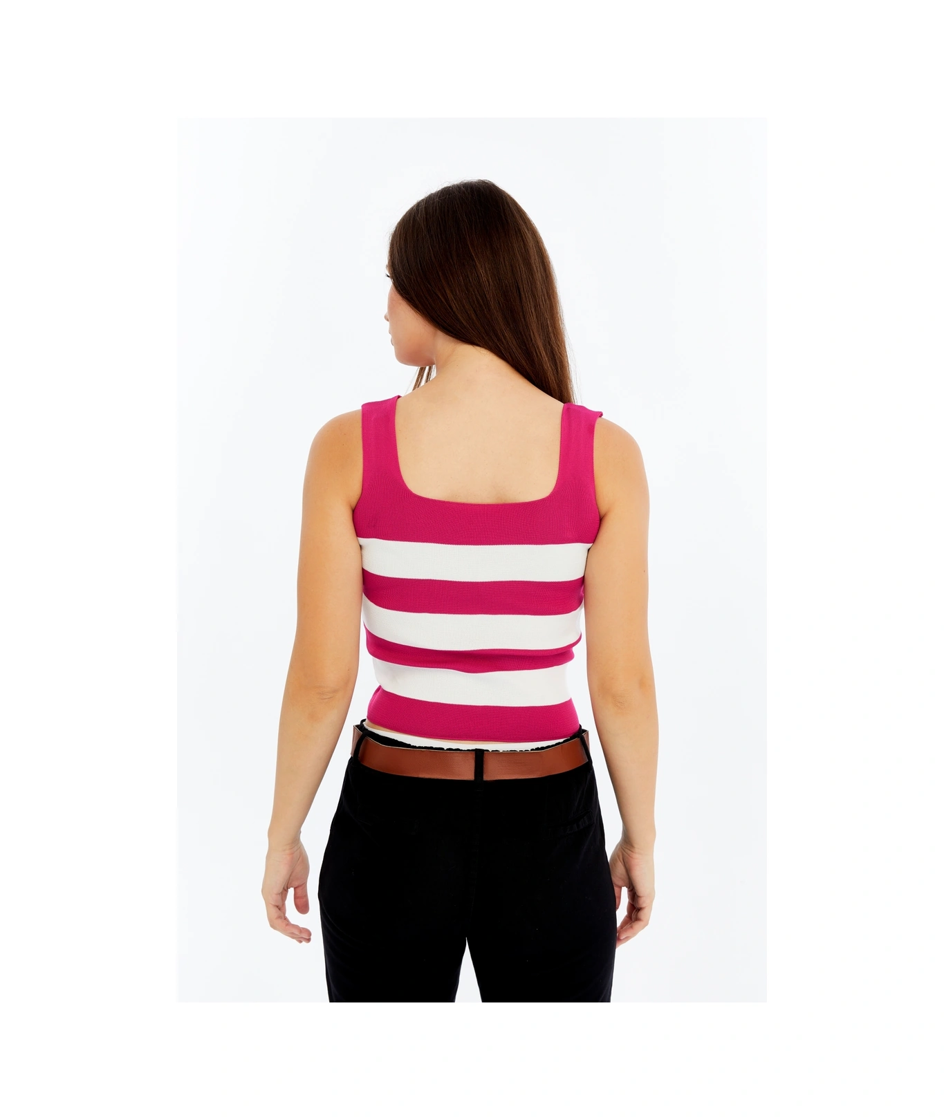 Kadın Çizgili Triko Kare Yaka Crop Atlet Fuşya Beyaz Askılı Bluz FUŞYA