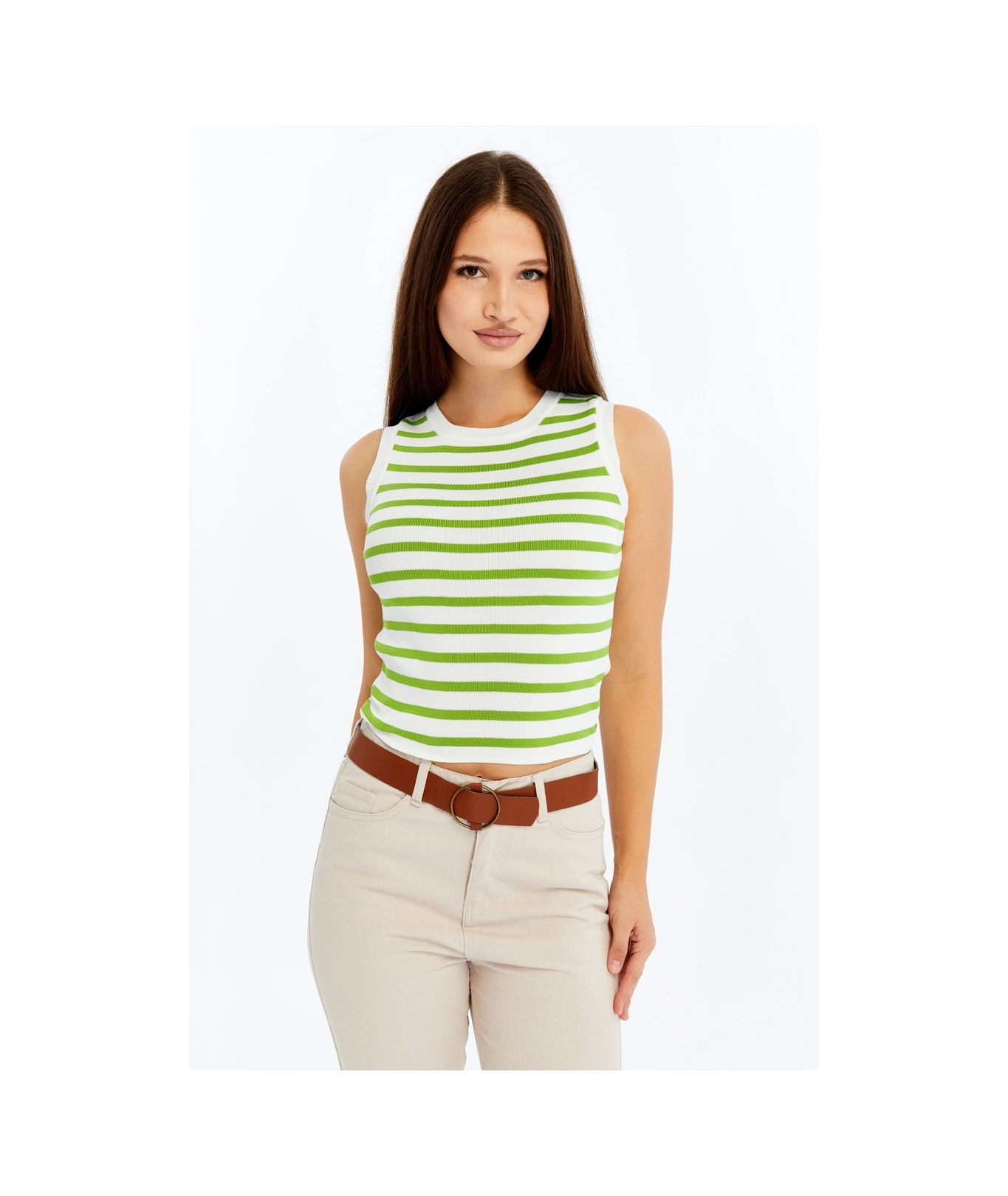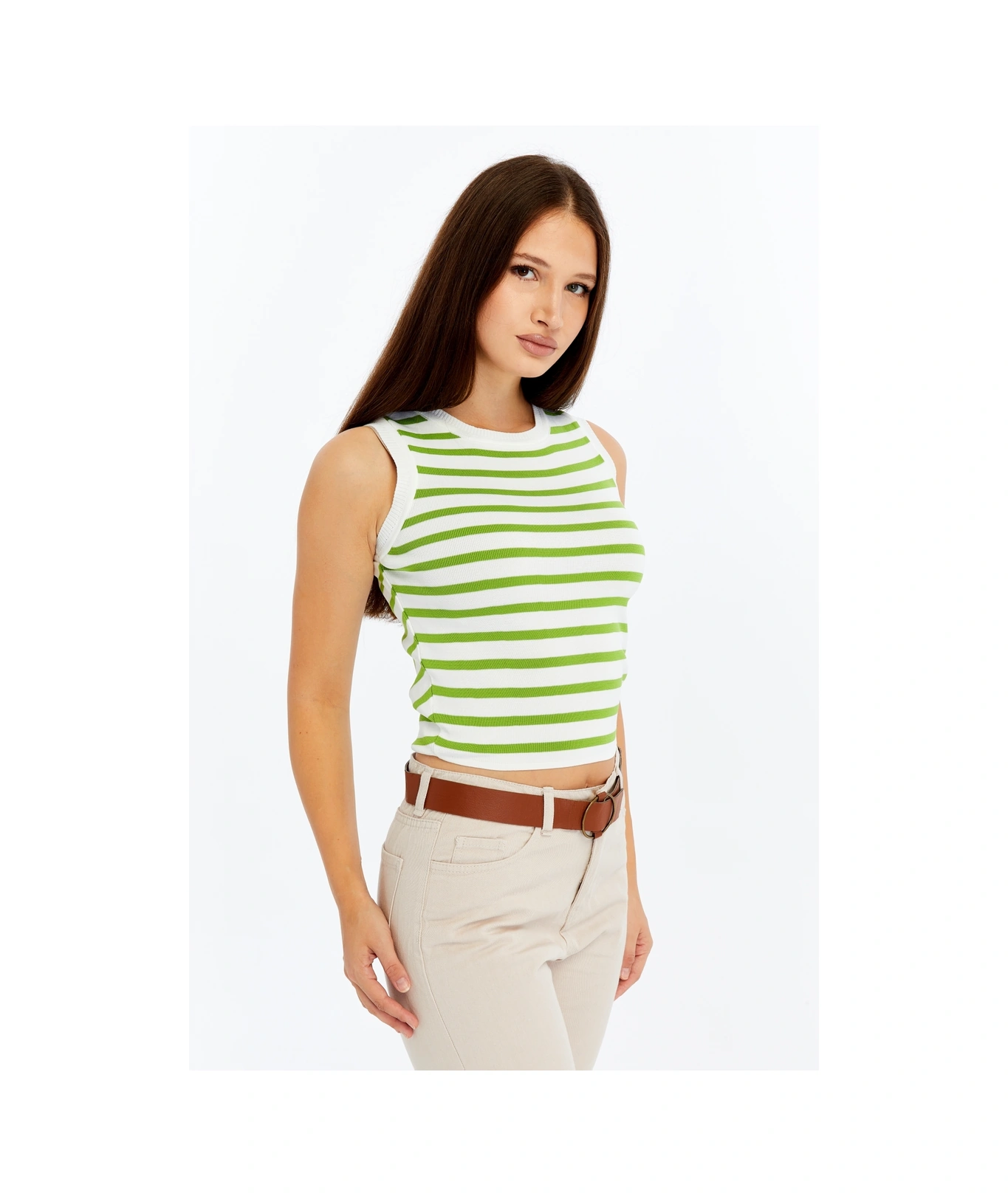 Kadın Çizgili Triko Kare Yaka Crop Atlet Yeşil Beyaz Askılı Bluz Yeşil