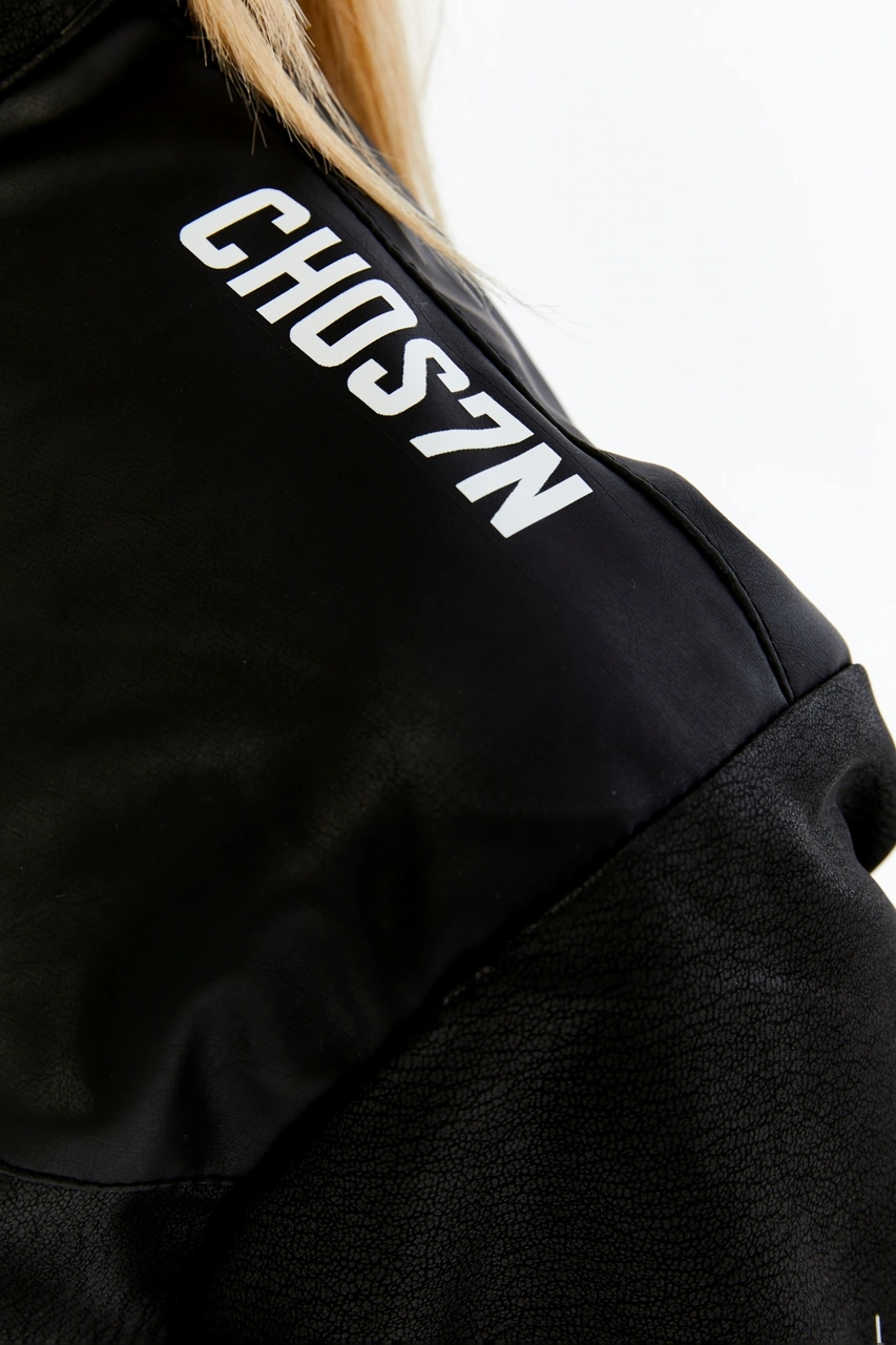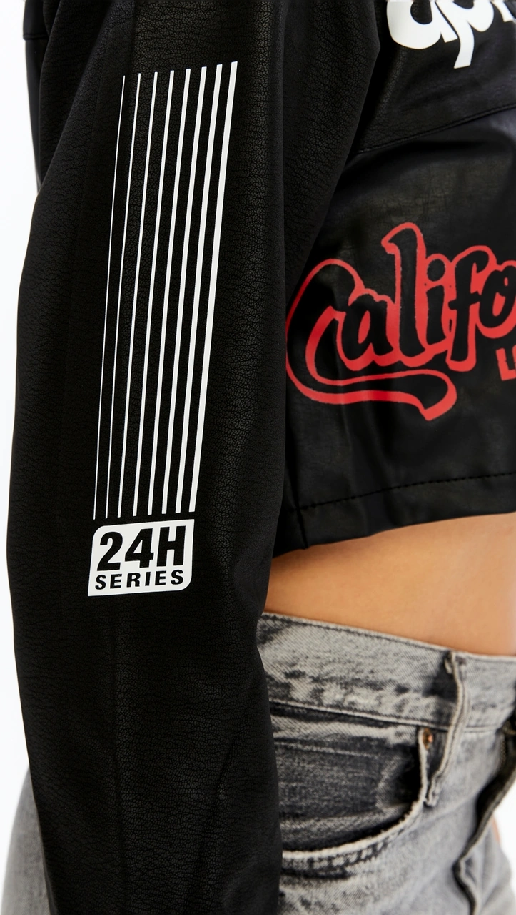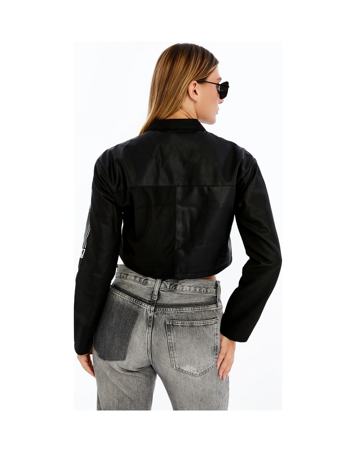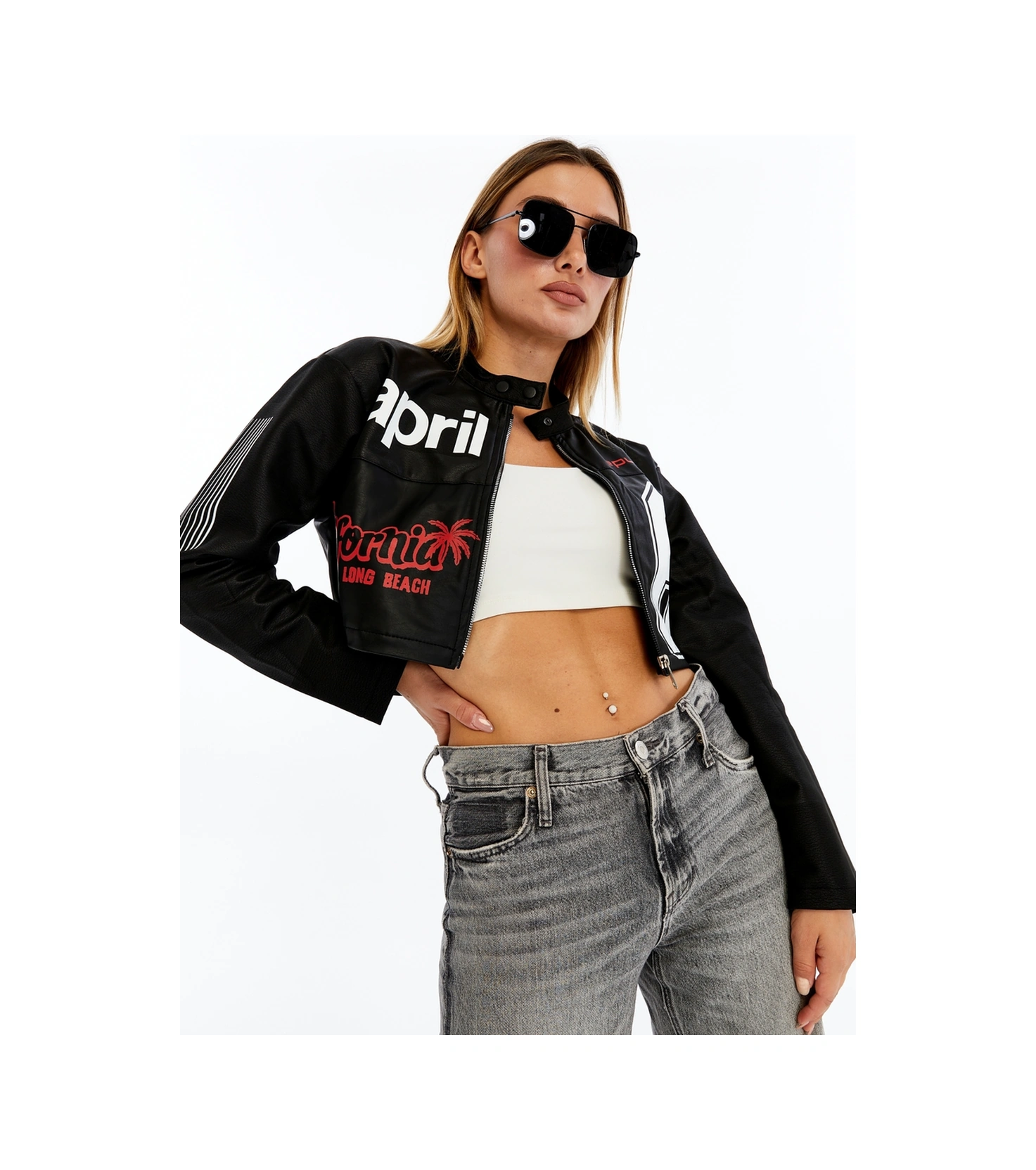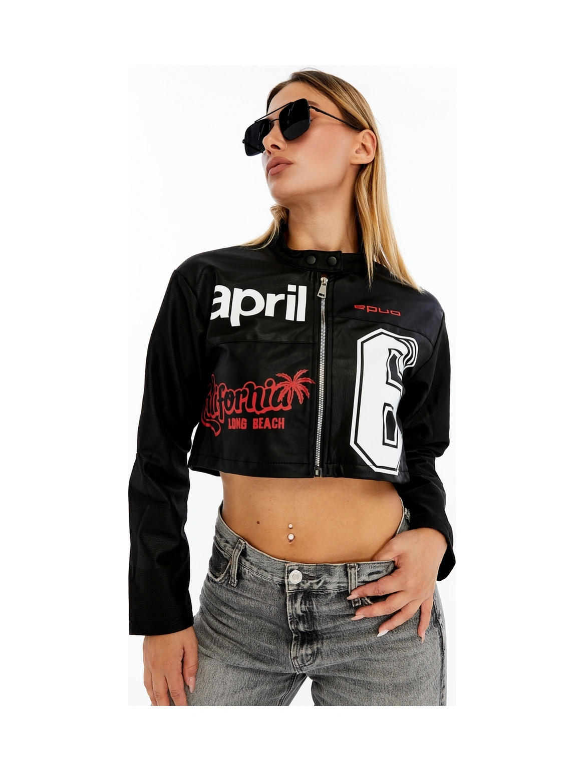 Kadın Crop Deri Ceket Renkli Baskılı Motorcu Stil Mont - Kısa Ceket Çok Renkli Mont - Hakim Yaka Siyah