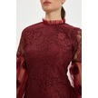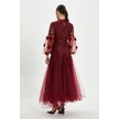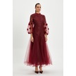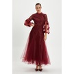 Kadın Dantelli Ve Tül Detaylı Uzun Elbise - Çiçek Aplikeli Kol Tasarımı - Özel Günlerin Zarif Şıklığı Bordo