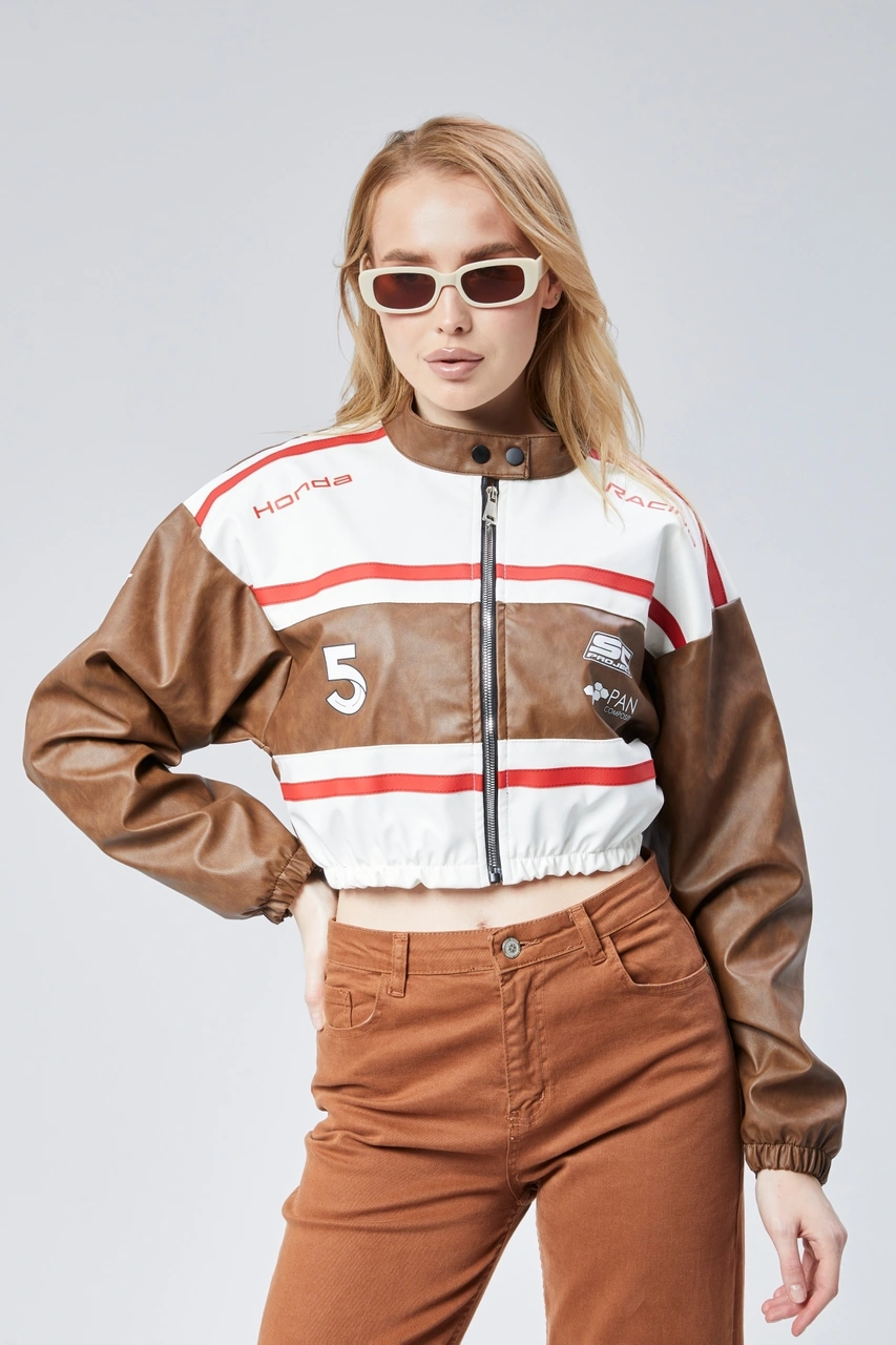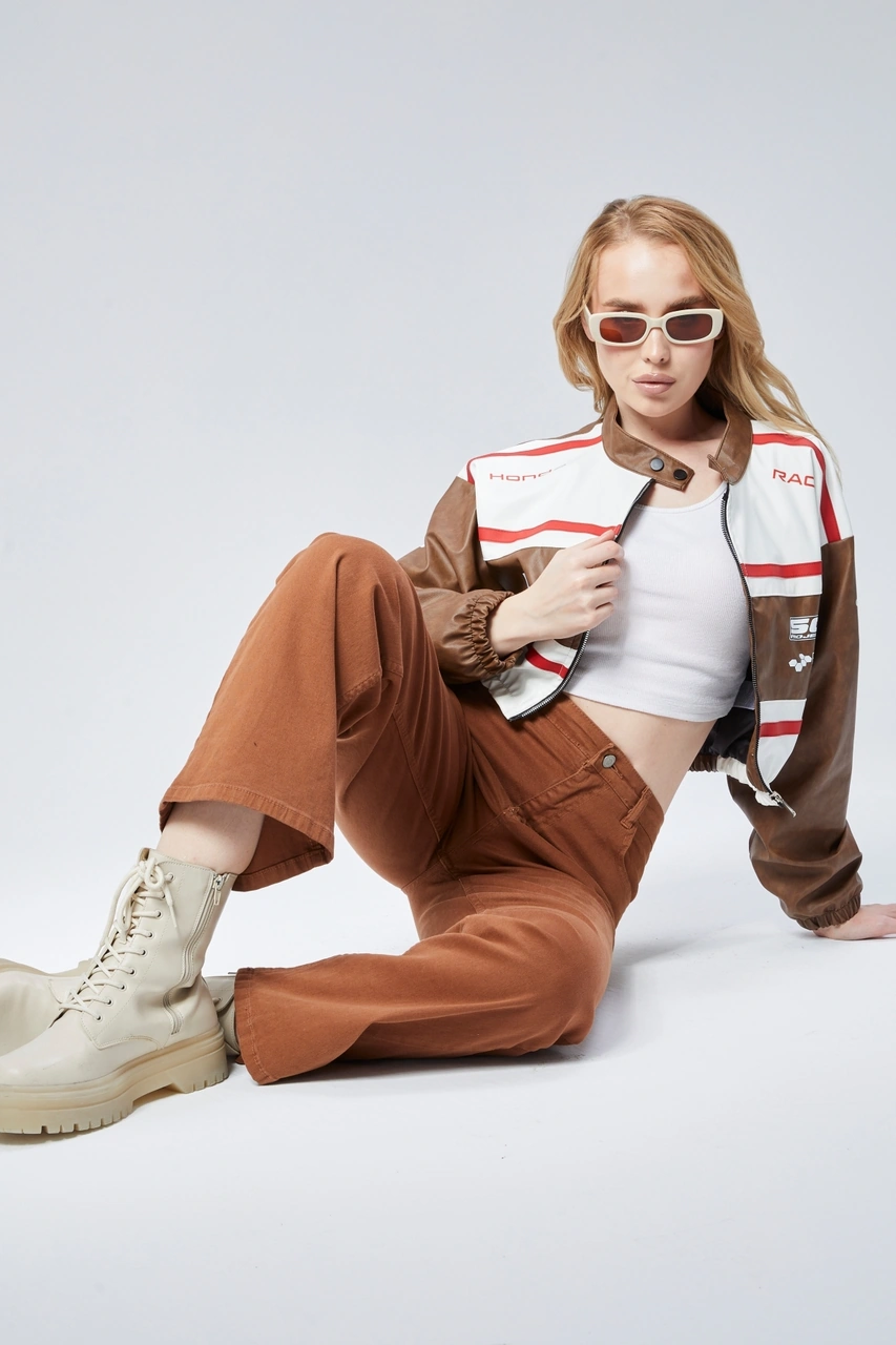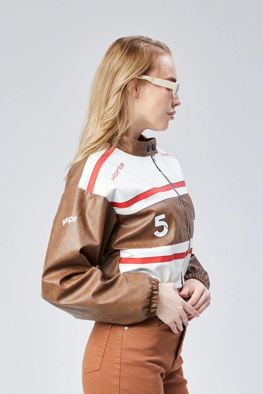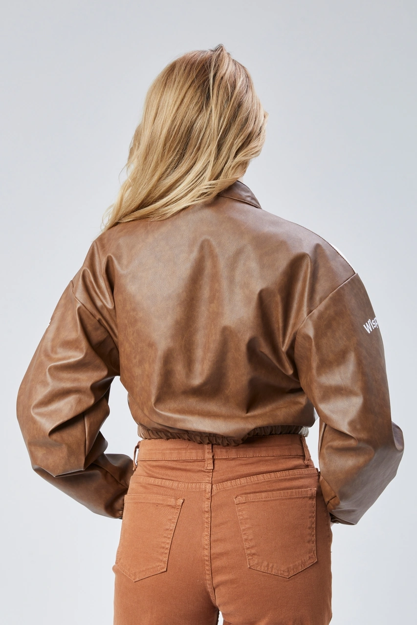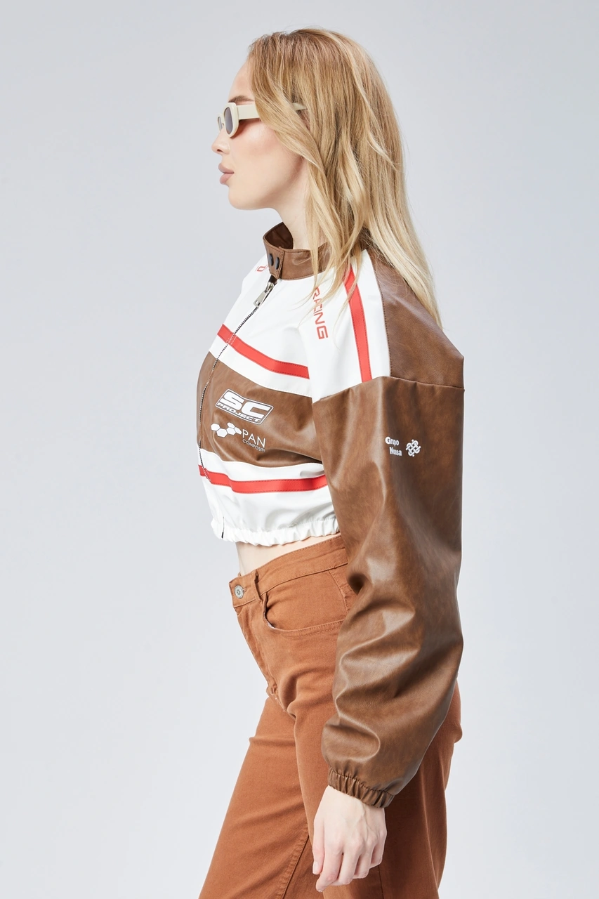 Kadın Deri Baskılı Şeritli Ceket Beli Ve Kolu Lastikli Kolej Hakim Yaka Bomber Yarışçı Motorcu Mont Kahverengi