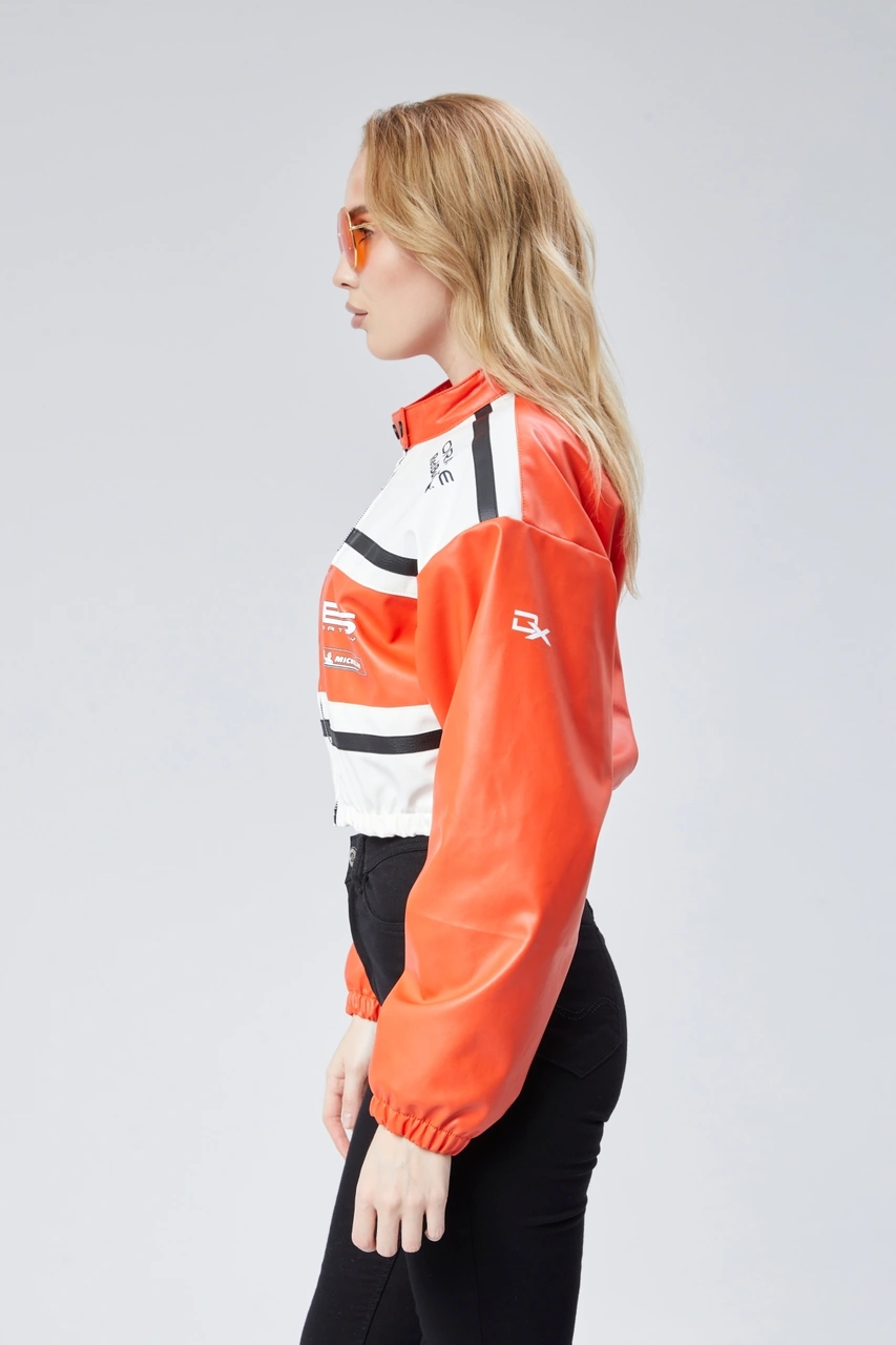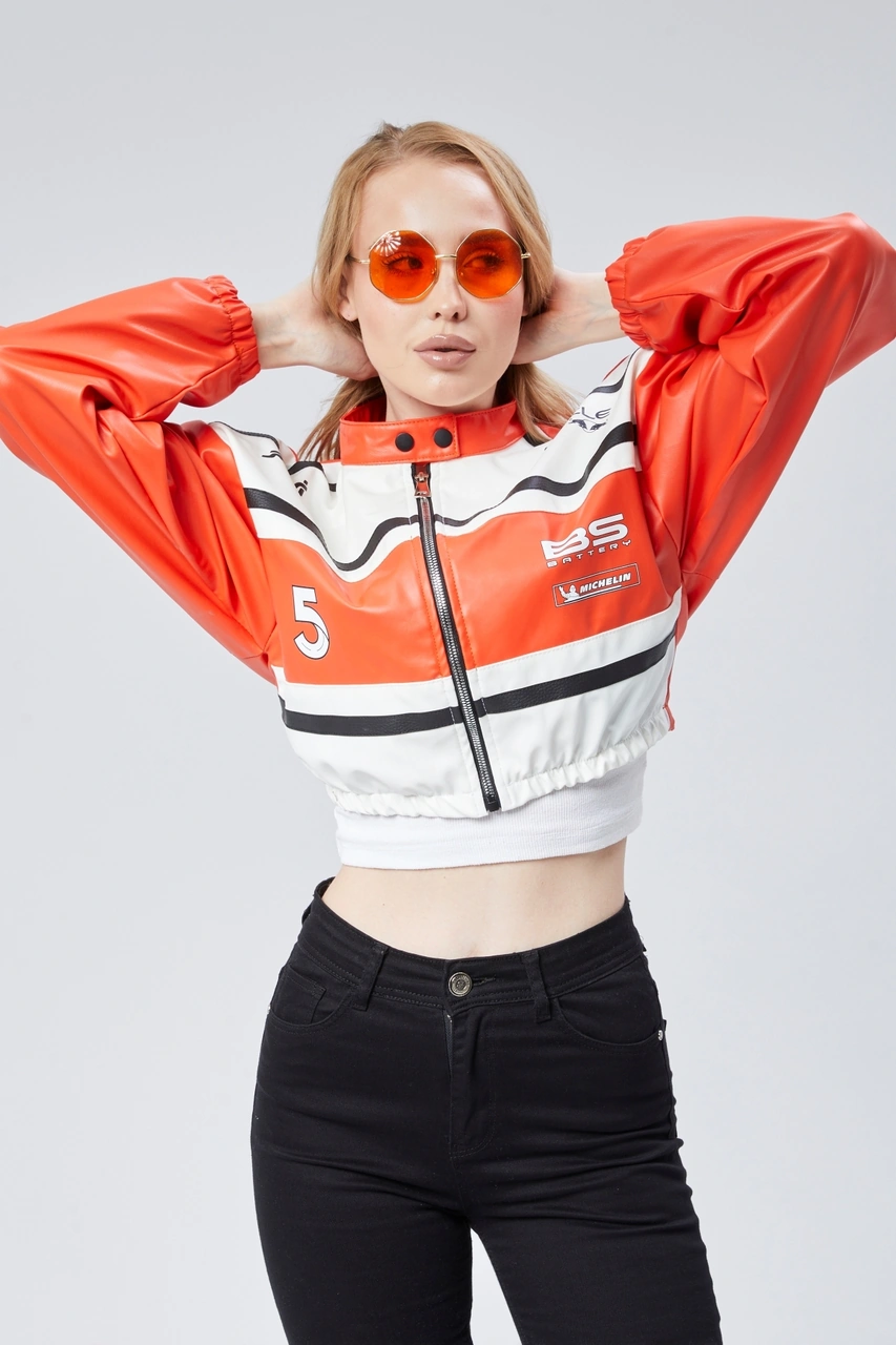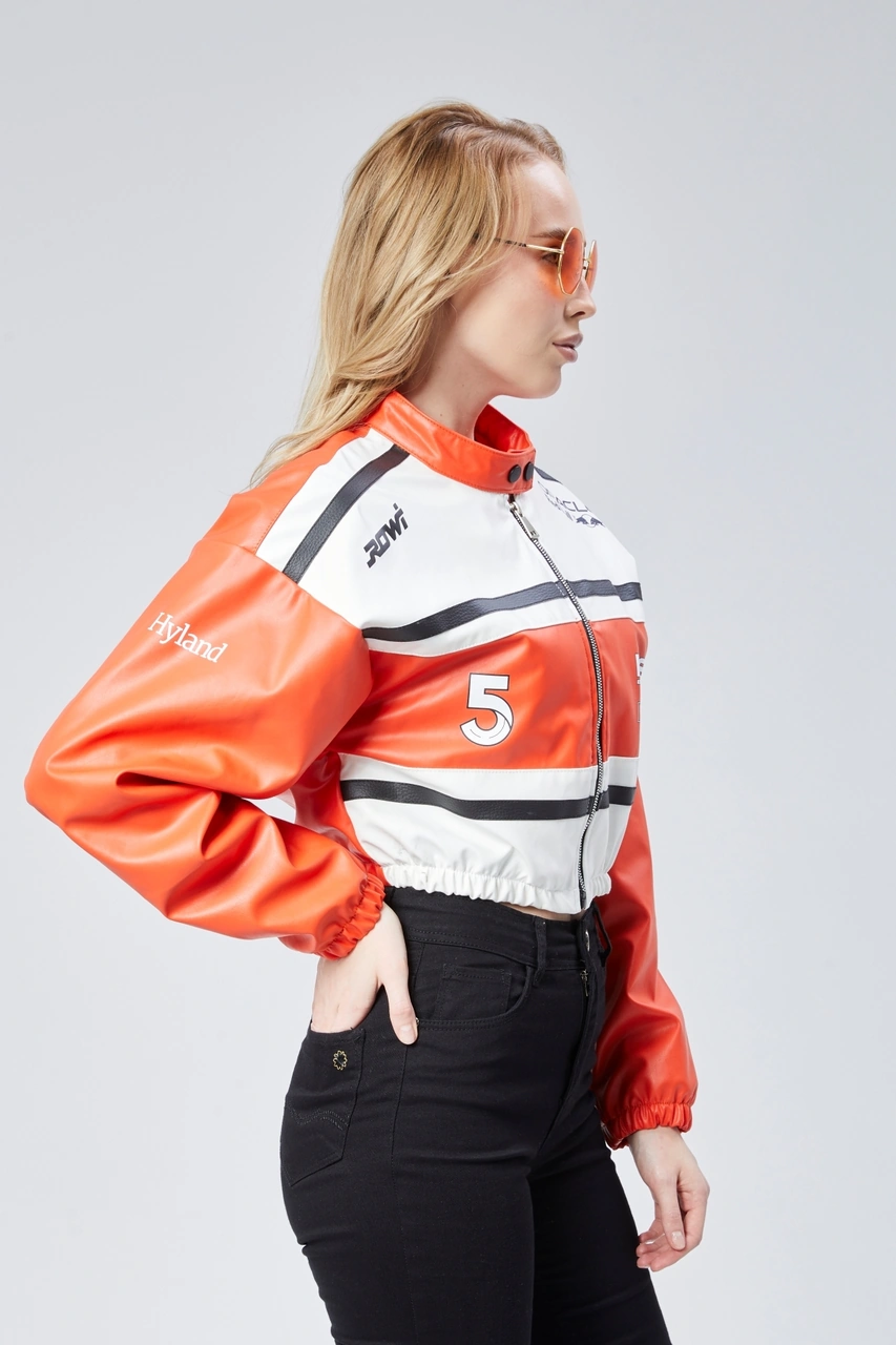 Kadın Deri Baskılı Şeritli Ceket Beli Ve Kolu Lastikli Kolej Hakim Yaka Bomber Yarışçı Motorcu Mont Oranj