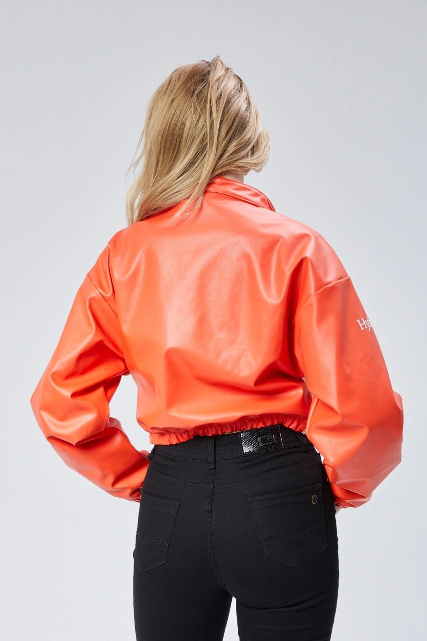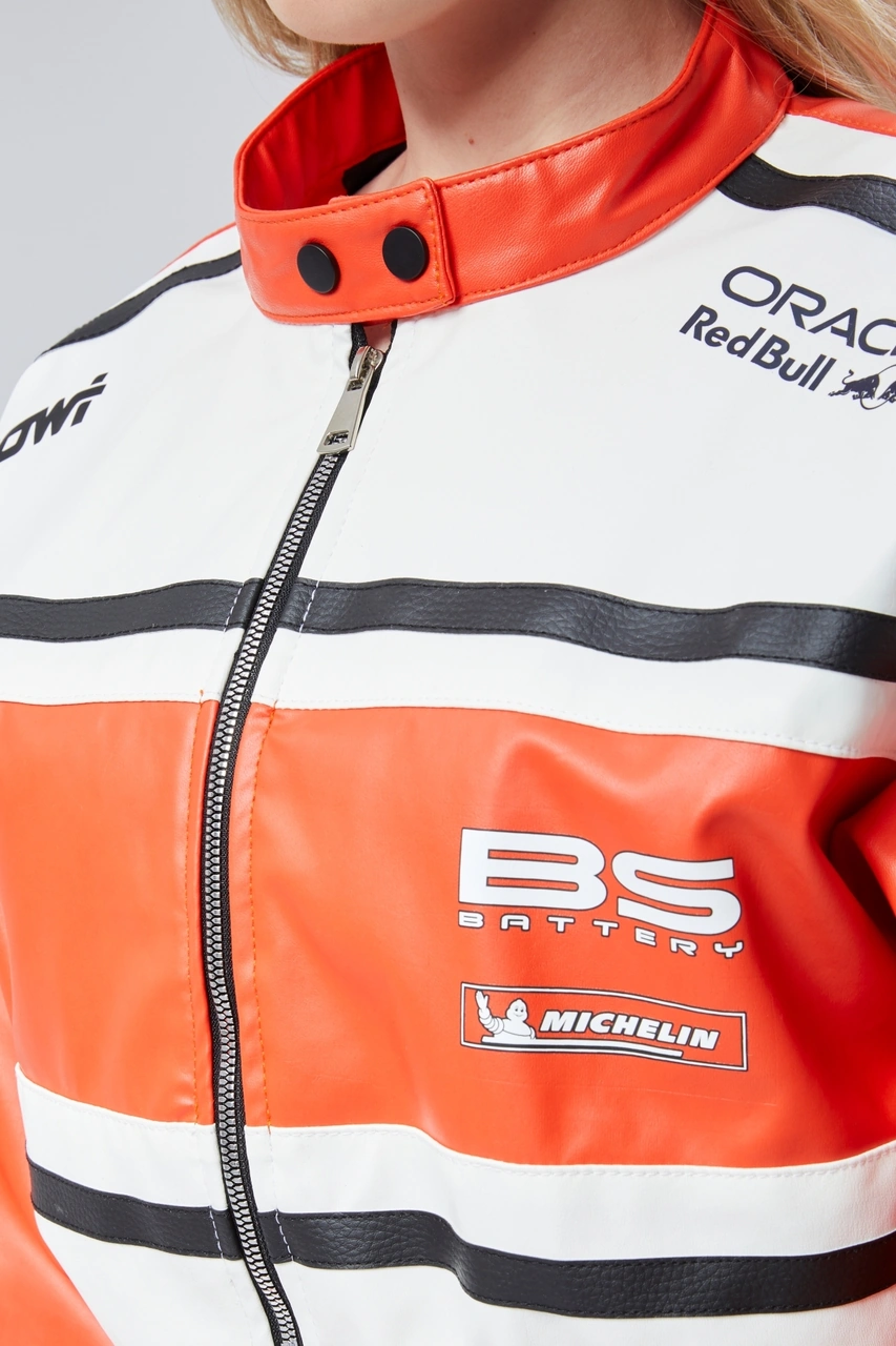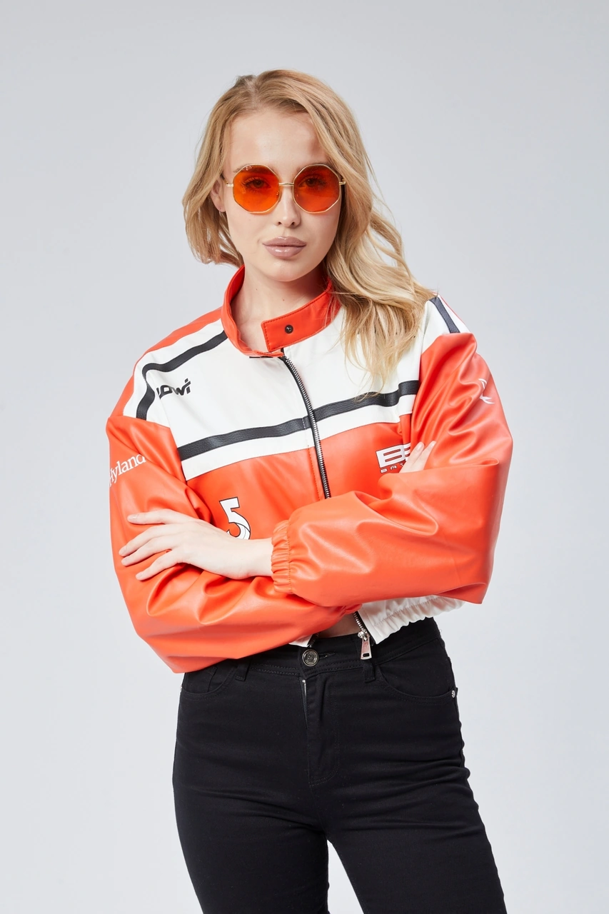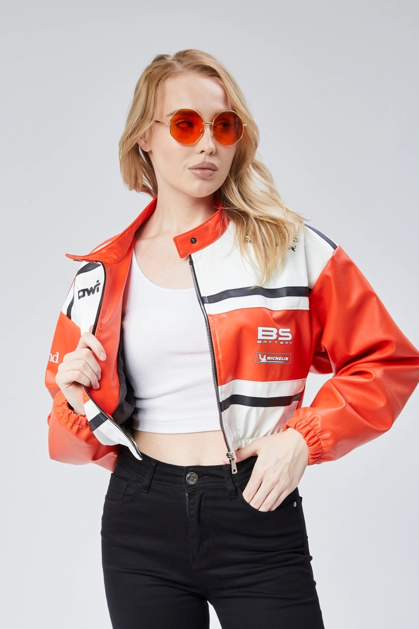 Kadın Deri Baskılı Şeritli Ceket Beli Ve Kolu Lastikli Kolej Hakim Yaka Bomber Yarışçı Motorcu Mont Oranj