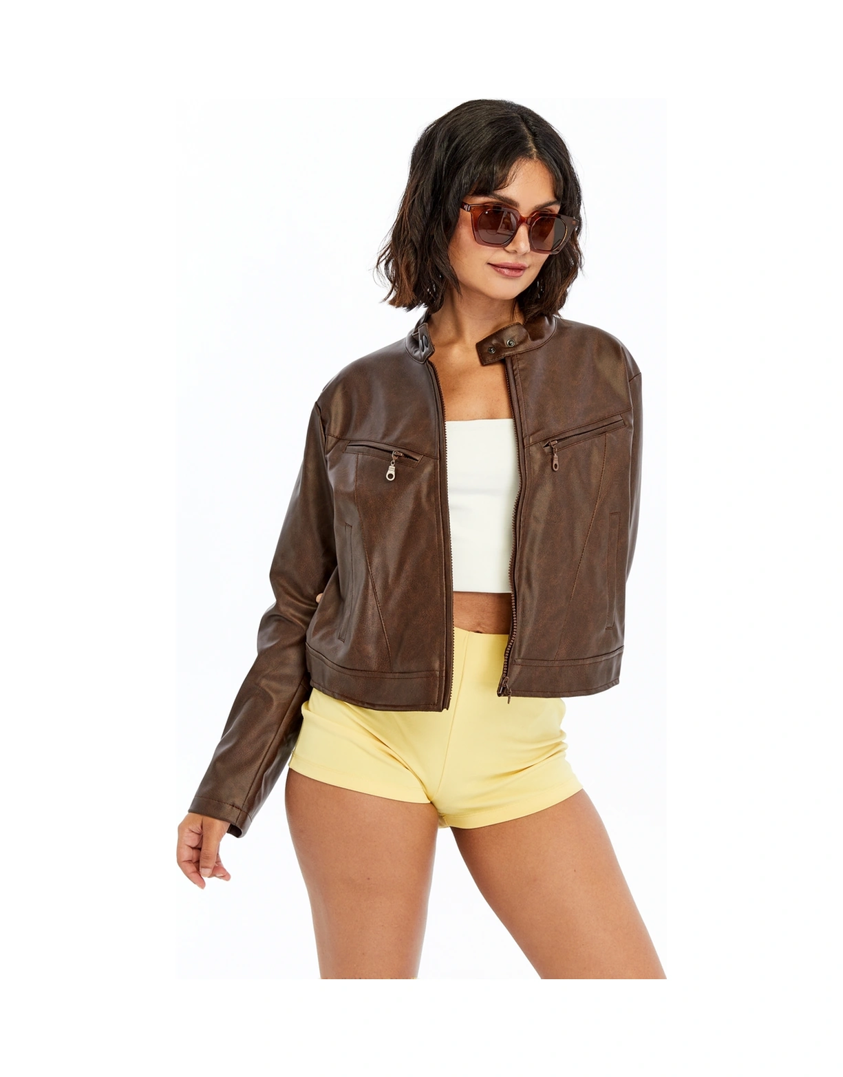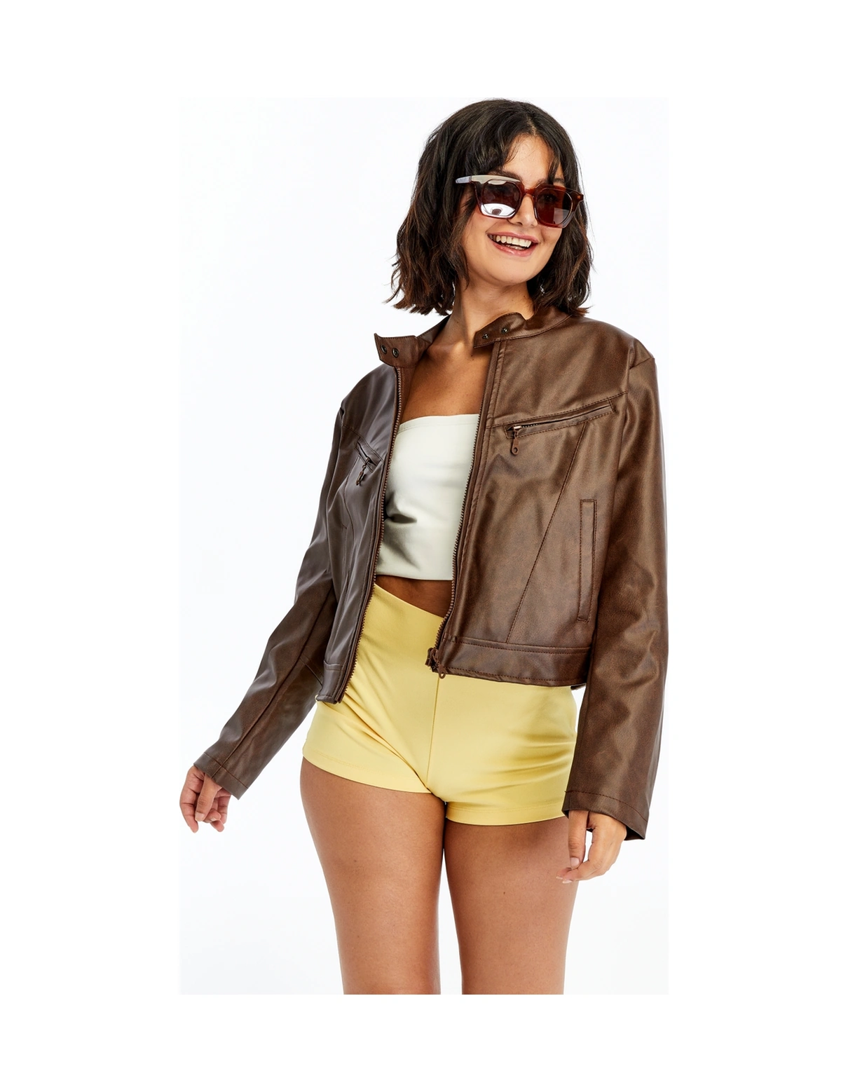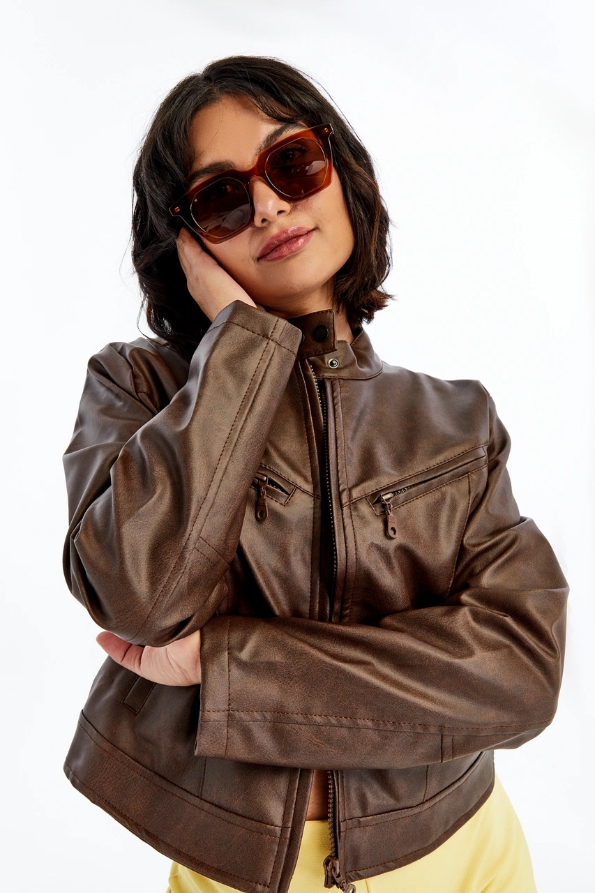 Kadın Deri Ceket Niş Kompakt Tasarım Mont Günlük Kullanım Fermuar Hakim Yaka Şık Ceket Kahverengi