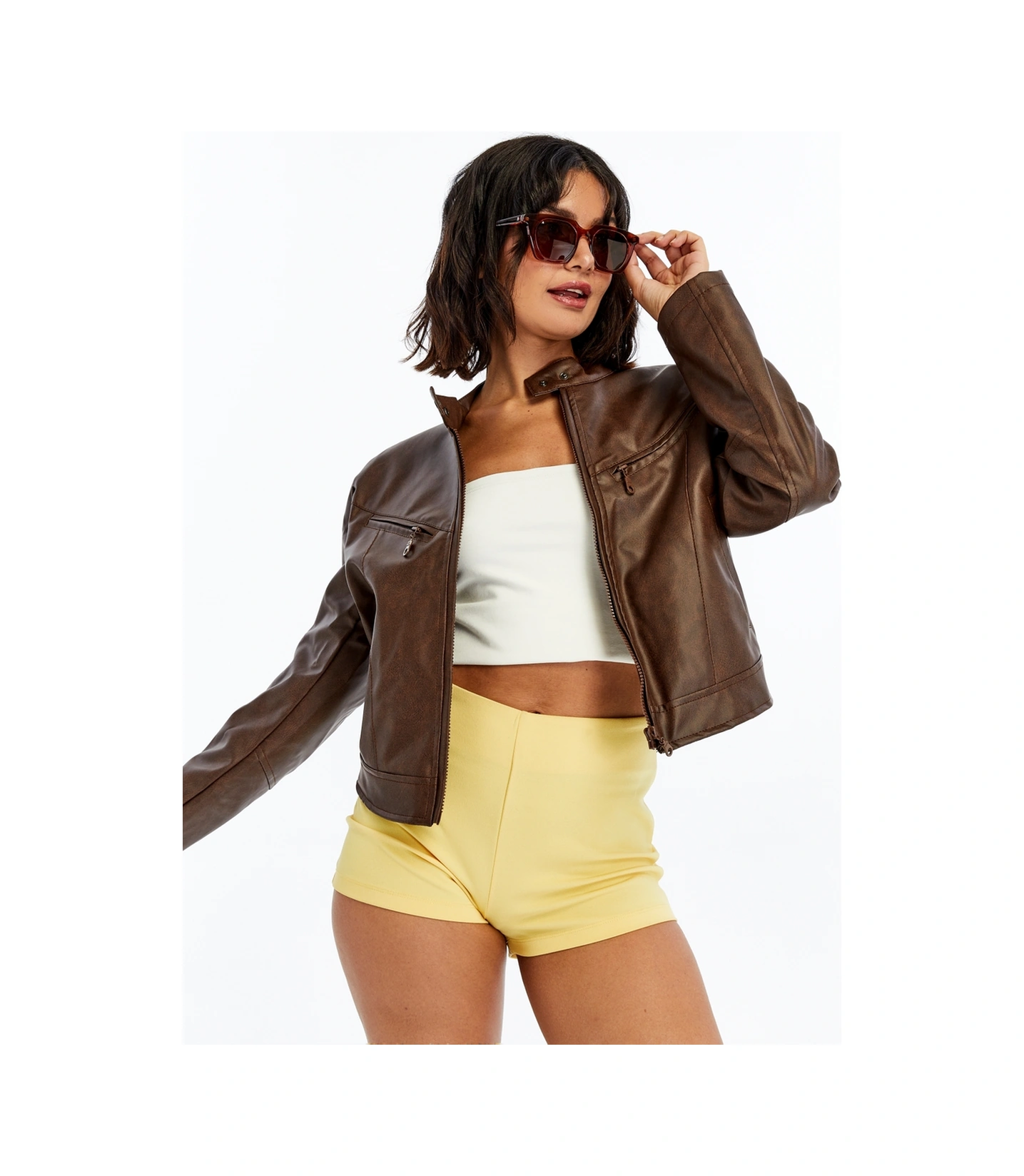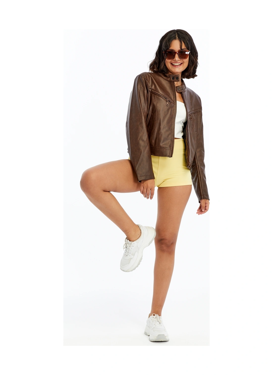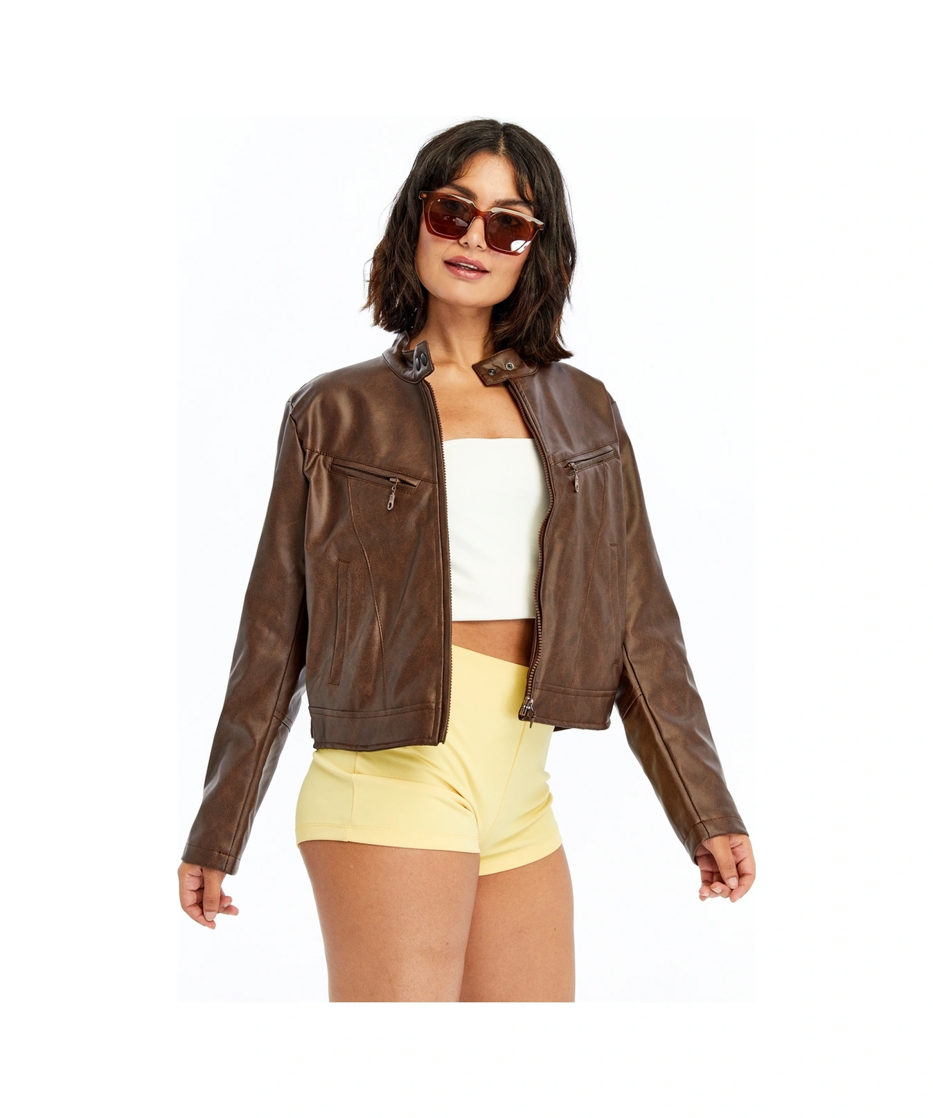 Kadın Deri Ceket Niş Kompakt Tasarım Mont Günlük Kullanım Fermuar Hakim Yaka Şık Ceket Kahverengi