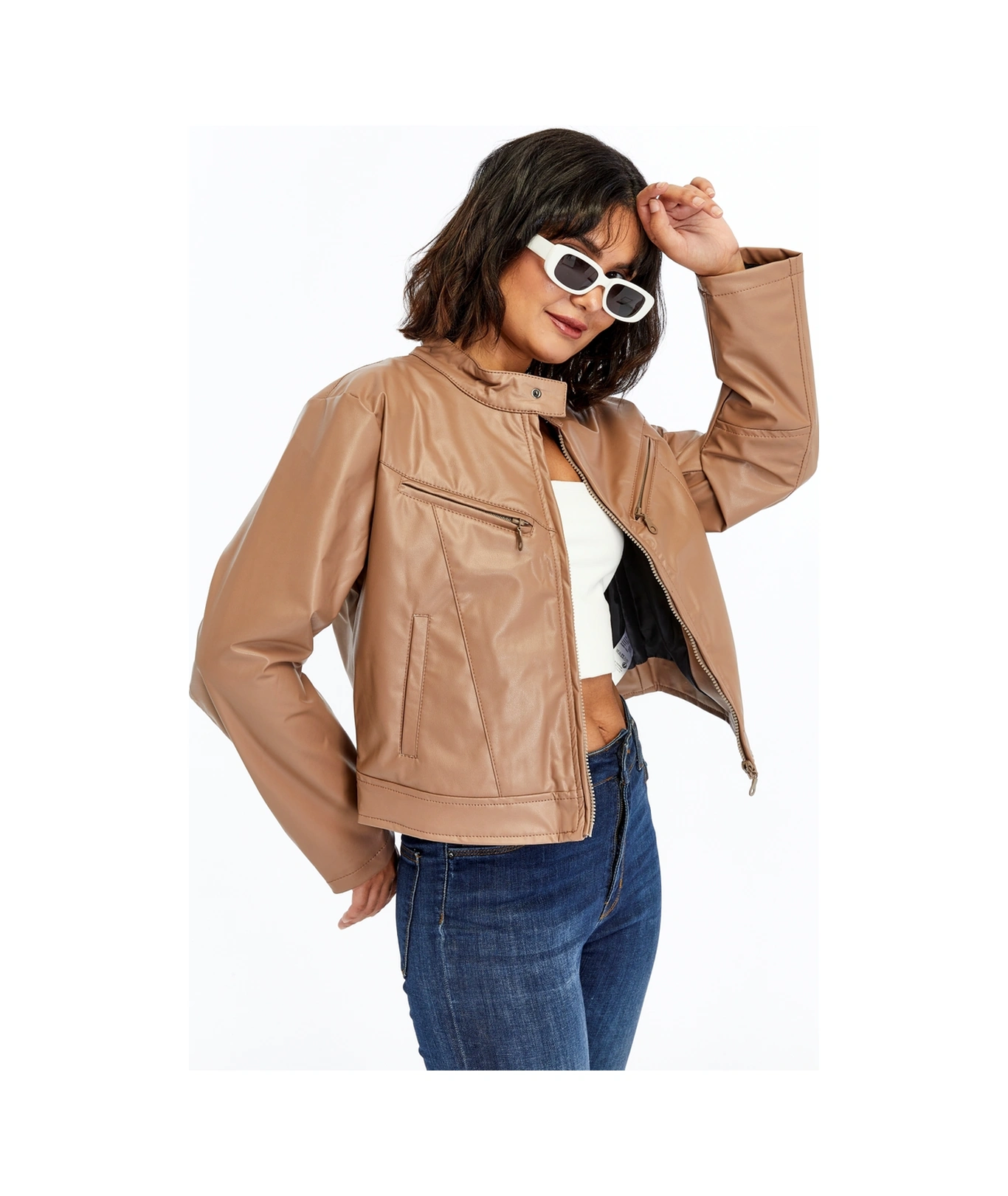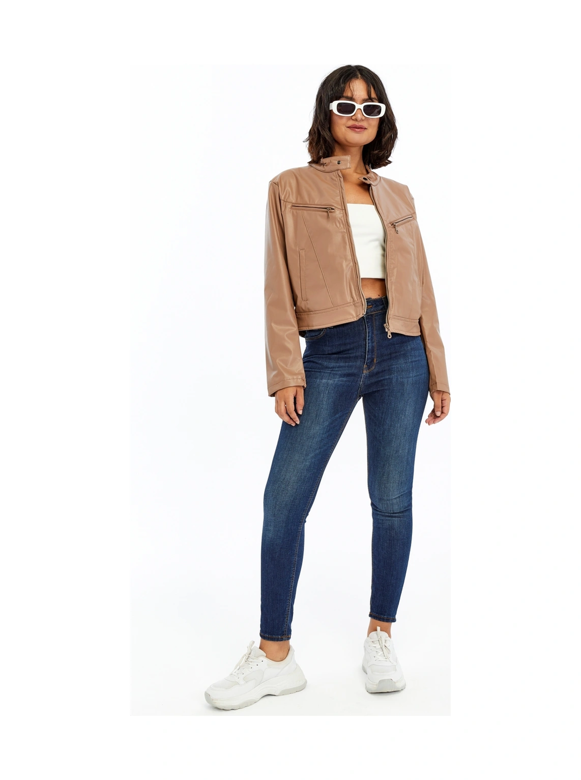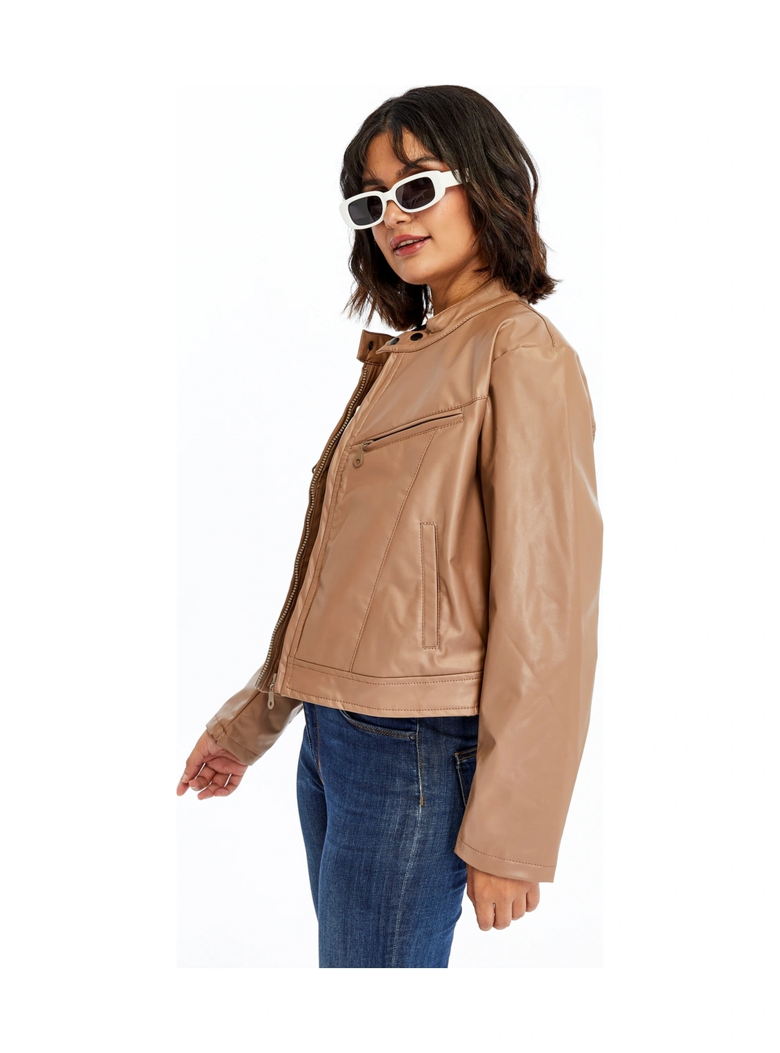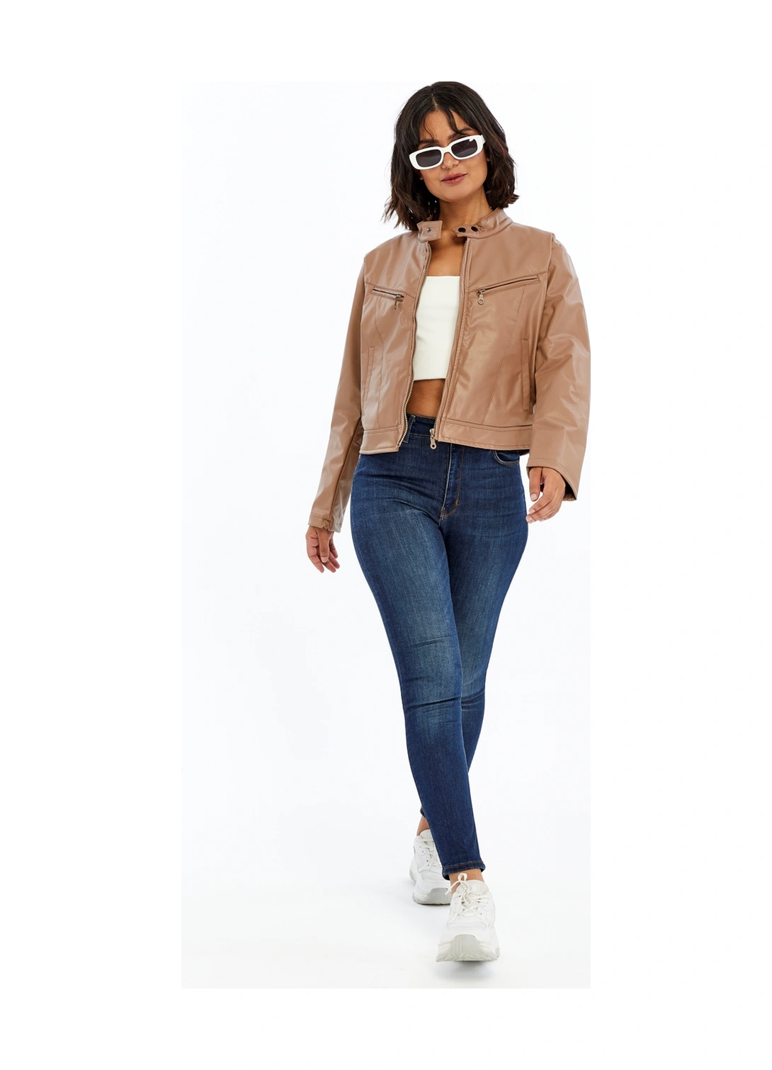 Kadın Deri Ceket Niş Kompakt Tasarım Mont Günlük Kullanım Fermuar Hakim Yaka Şık Ceket Pudra