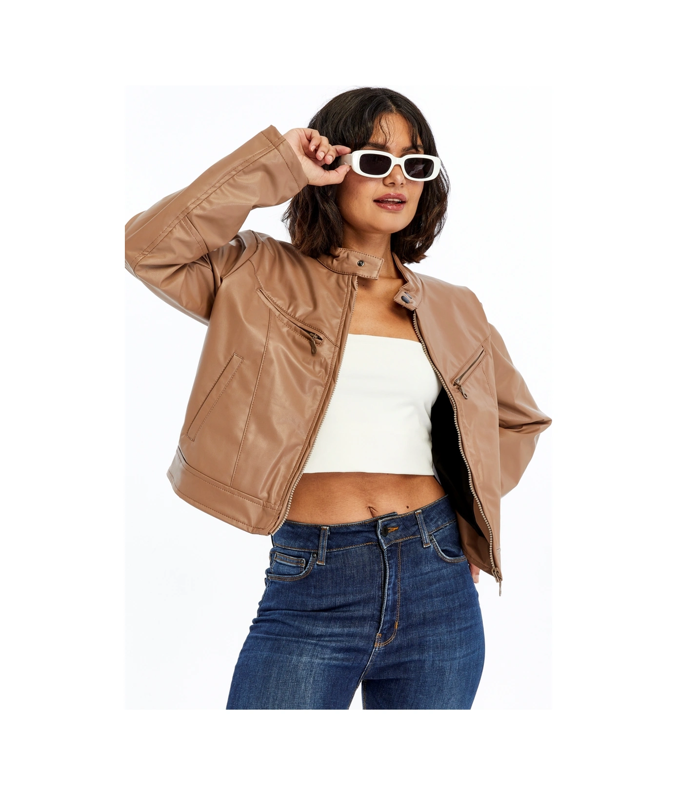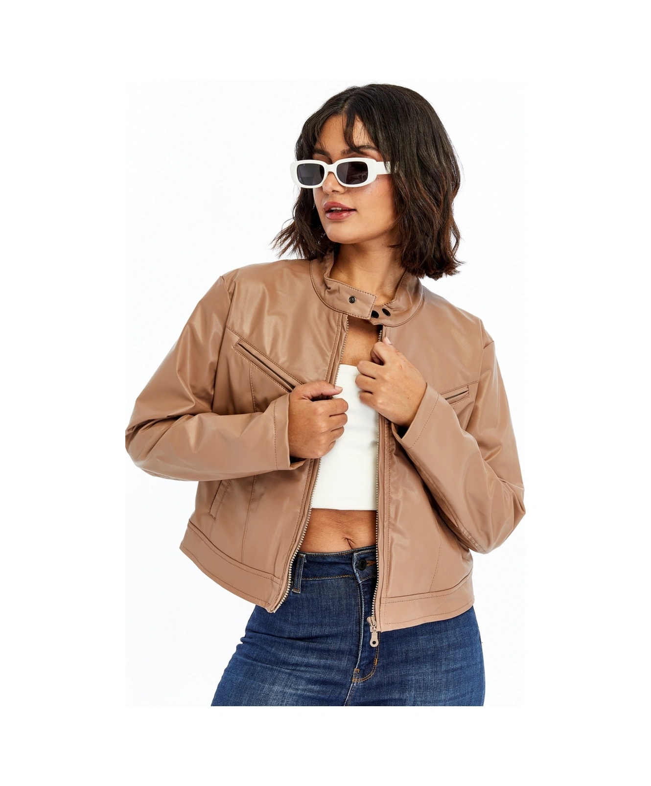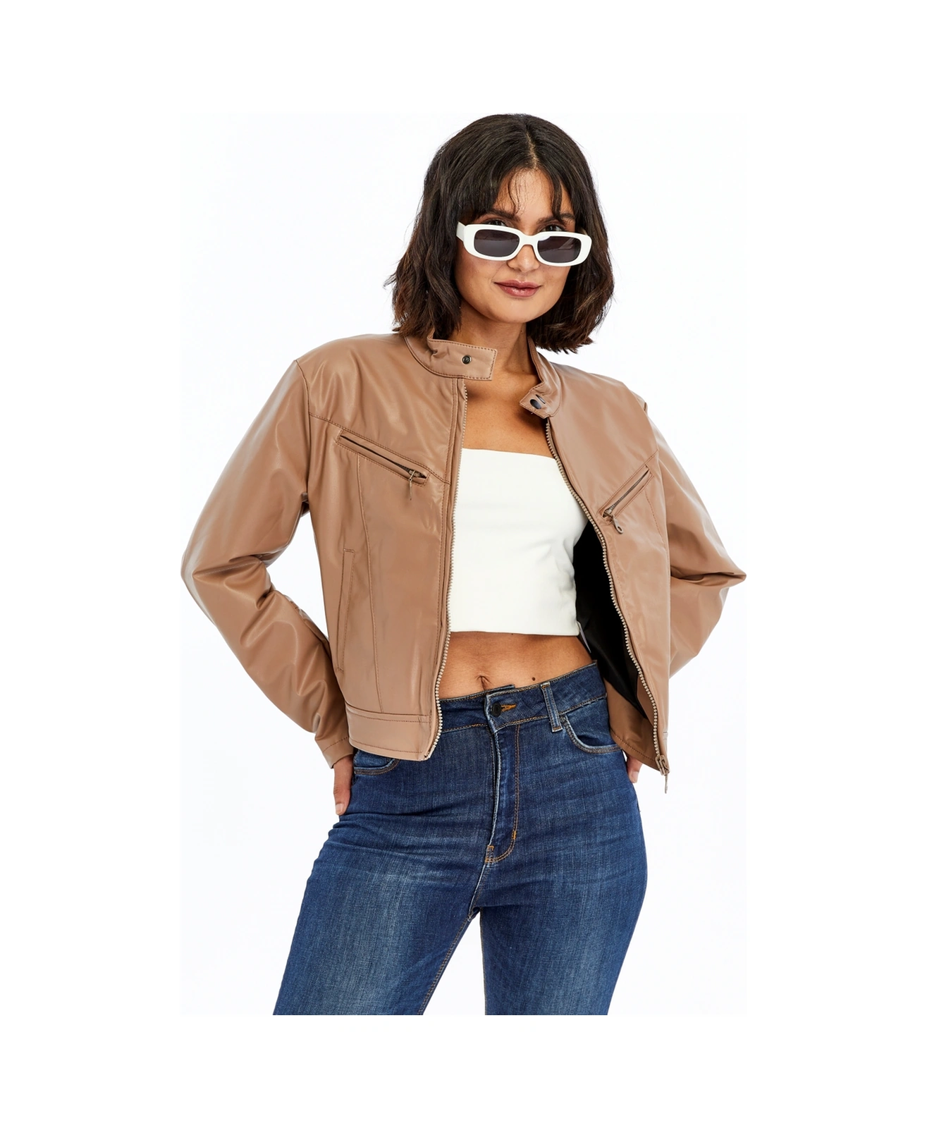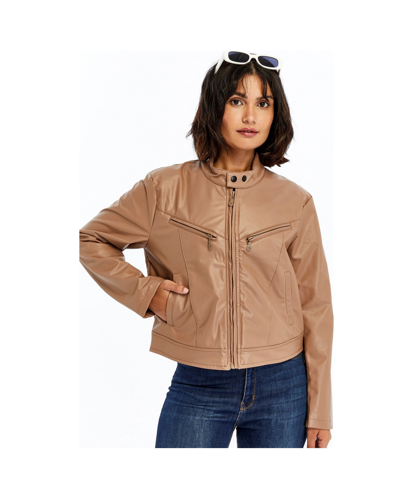 Kadın Deri Ceket Niş Kompakt Tasarım Mont Günlük Kullanım Fermuar Hakim Yaka Şık Ceket Pudra