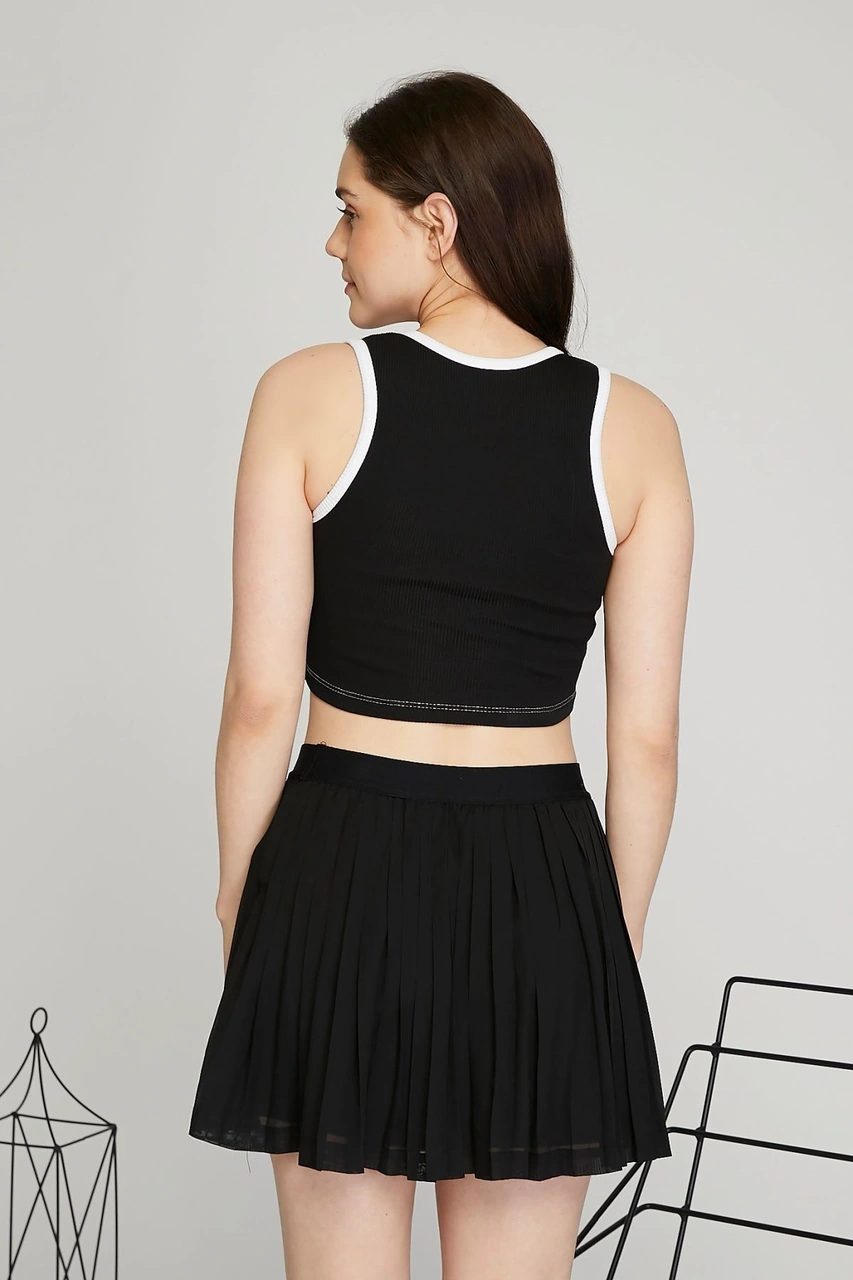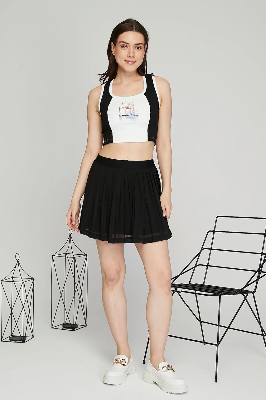 Kadın Deri Crop Ribana Kaşkorse Likralı Deri Garnili Baskılı Crop Büstiyer Deri Üzeri Baskılı Crop Siyah