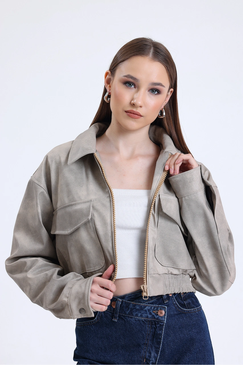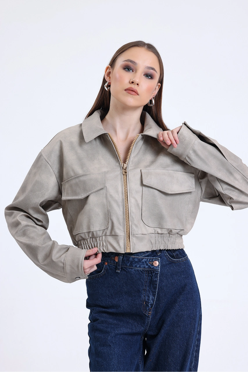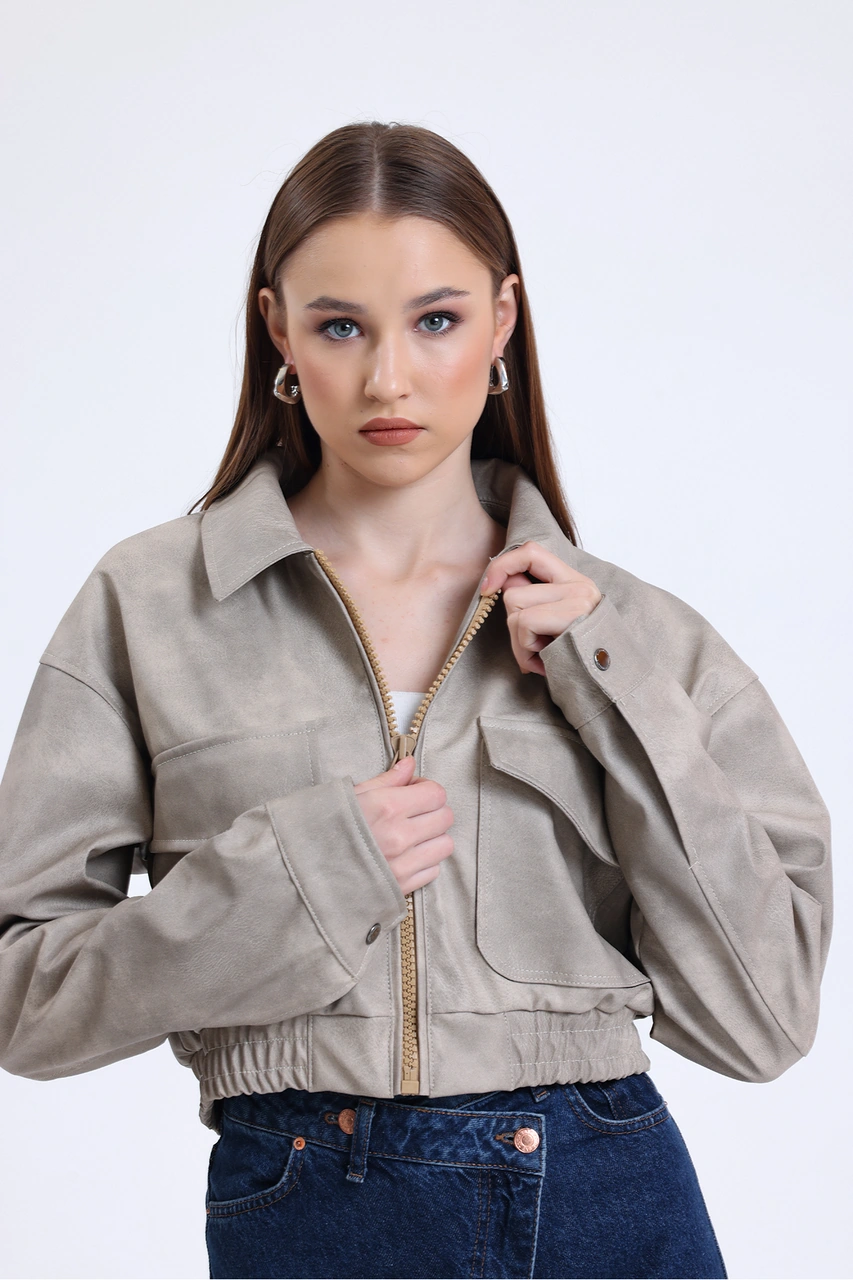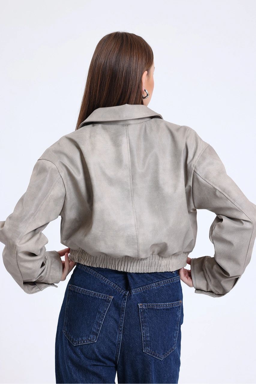 Kadın Deri Oversize Astarlı Kol Çıt Çıt Düğmeli Deri Mont Fermuar Kapamalı Kolej Mont Bej Bej