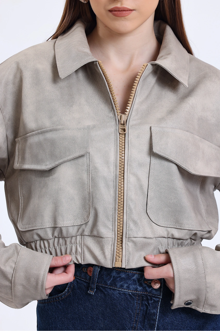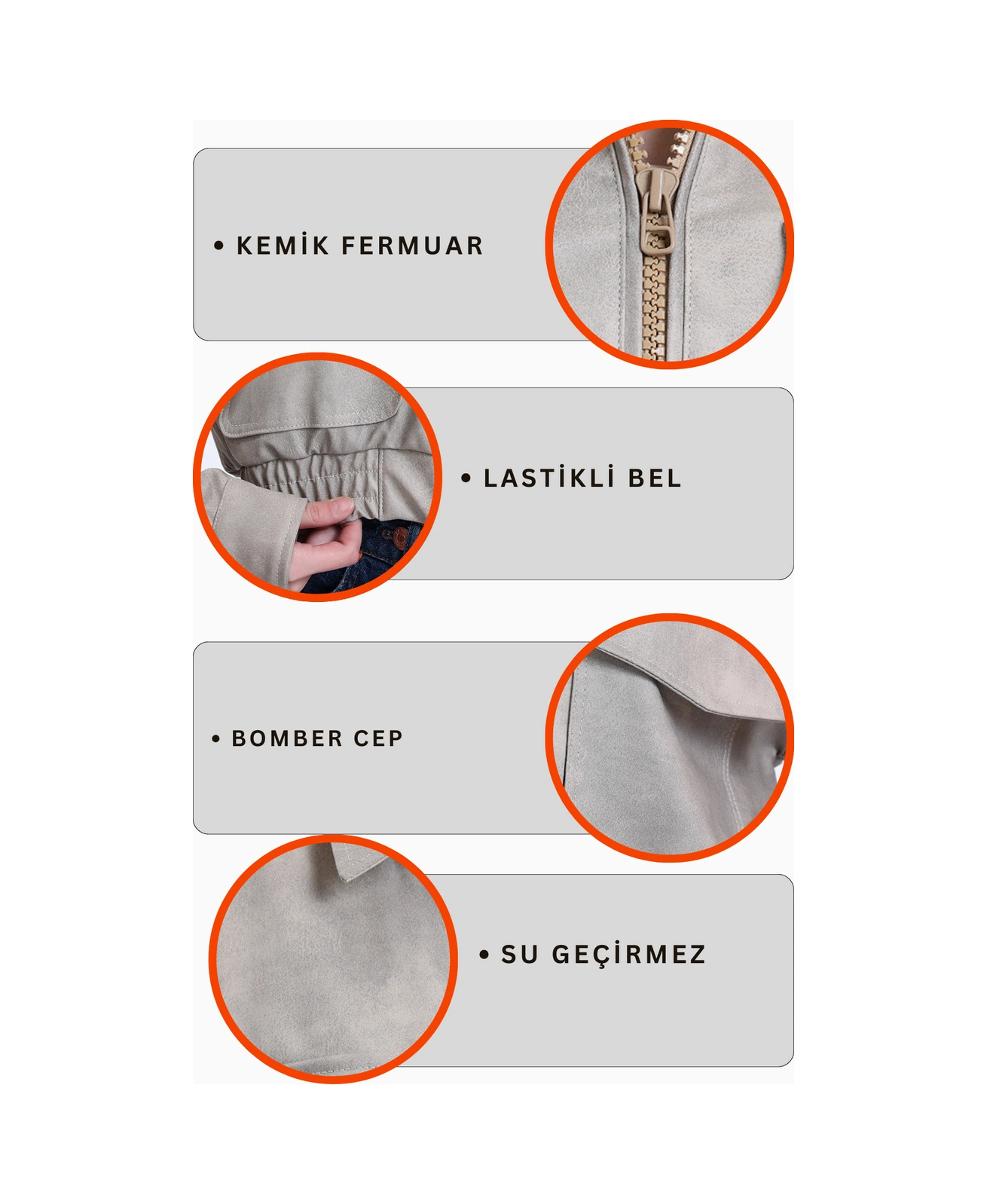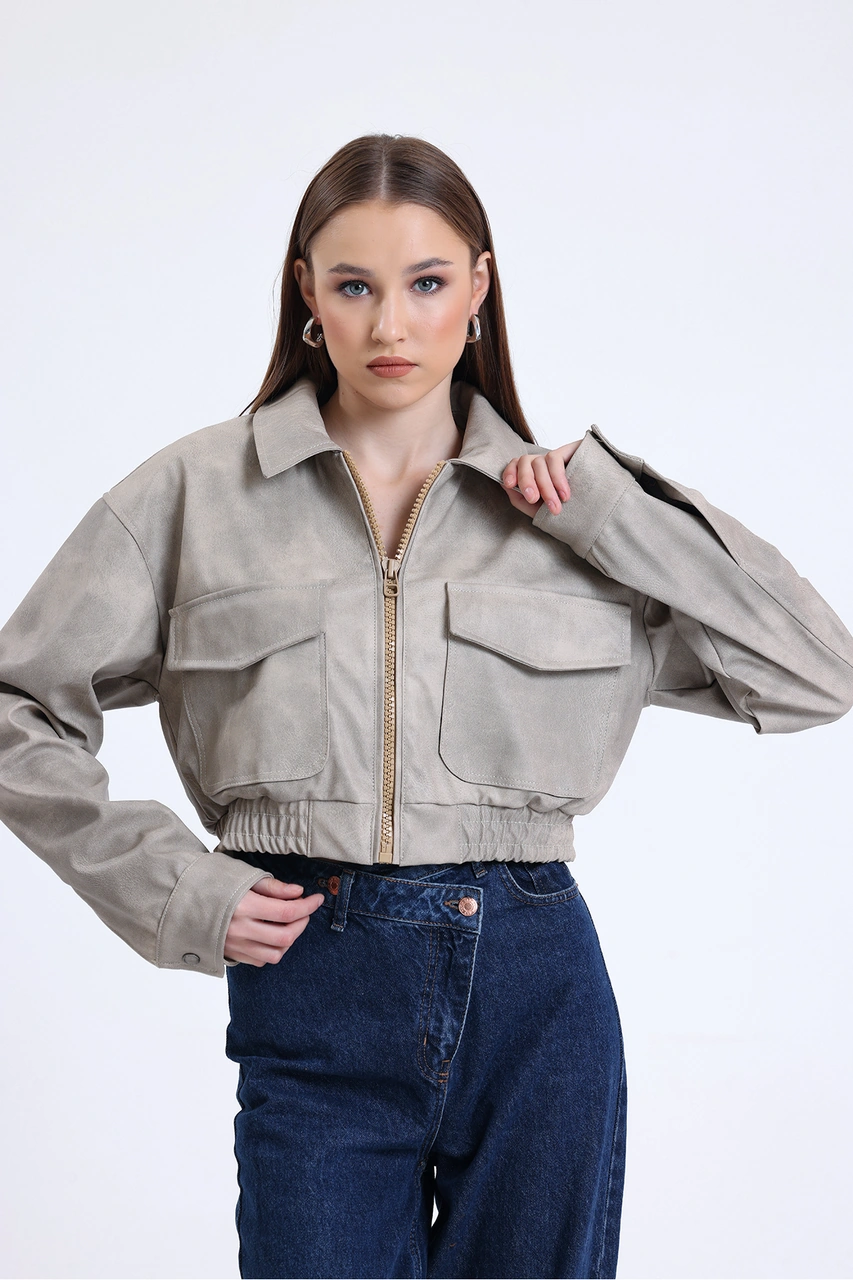 Kadın Deri Oversize Astarlı Kol Çıt Çıt Düğmeli Deri Mont Fermuar Kapamalı Kolej Mont Bej Bej