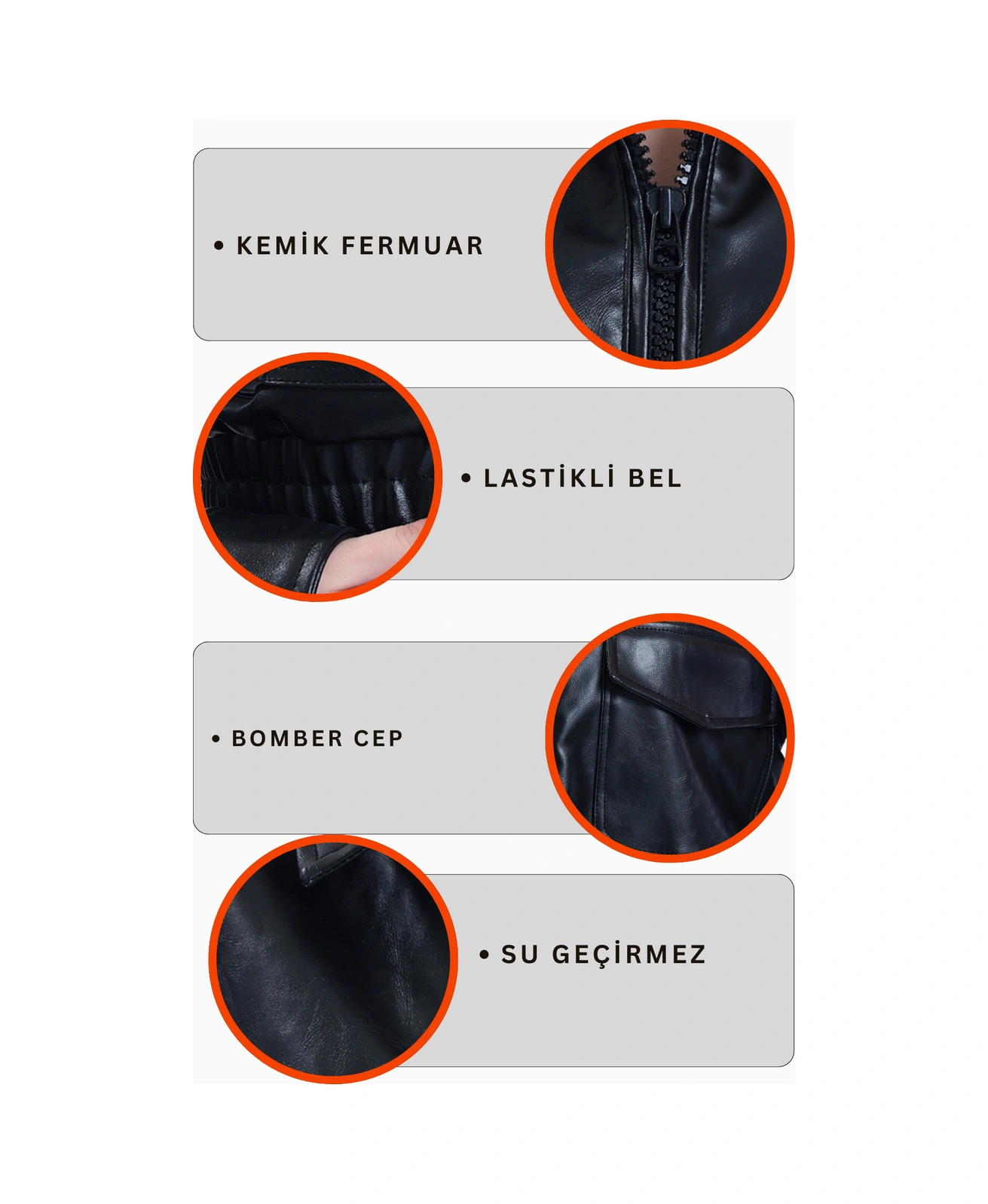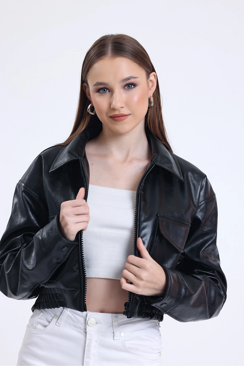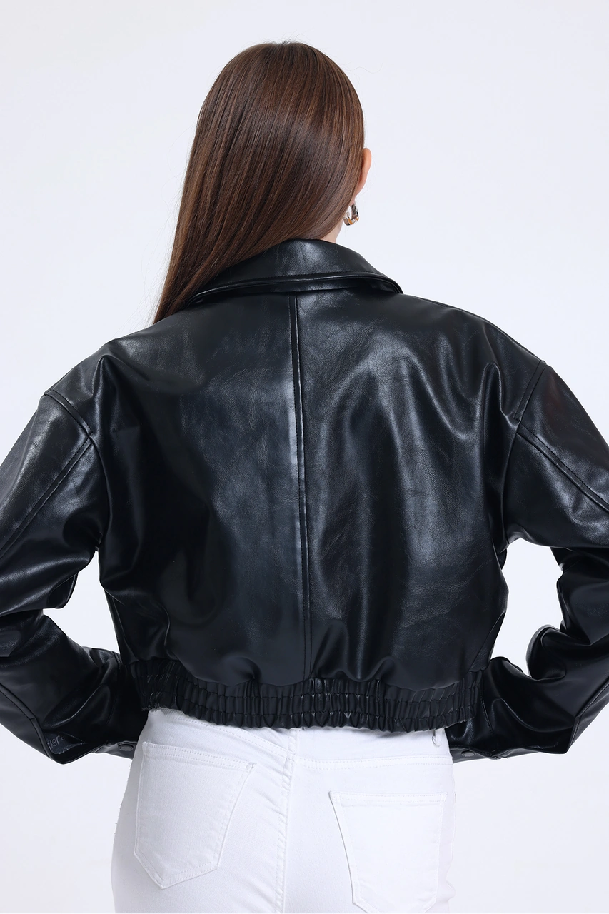 Kadın Deri Oversize Astarlı Kol Çıt Çıt Düğmeli Deri Mont Fermuar Kapamalı Kolej Mont Siyah Siyah