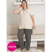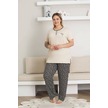 Kadın Desenli Bisiklet Yaka 3 Düğmeli Yırtmaç Detaylı Büyük Beden Viskon Kısa Kol Pijama Takımı Bej